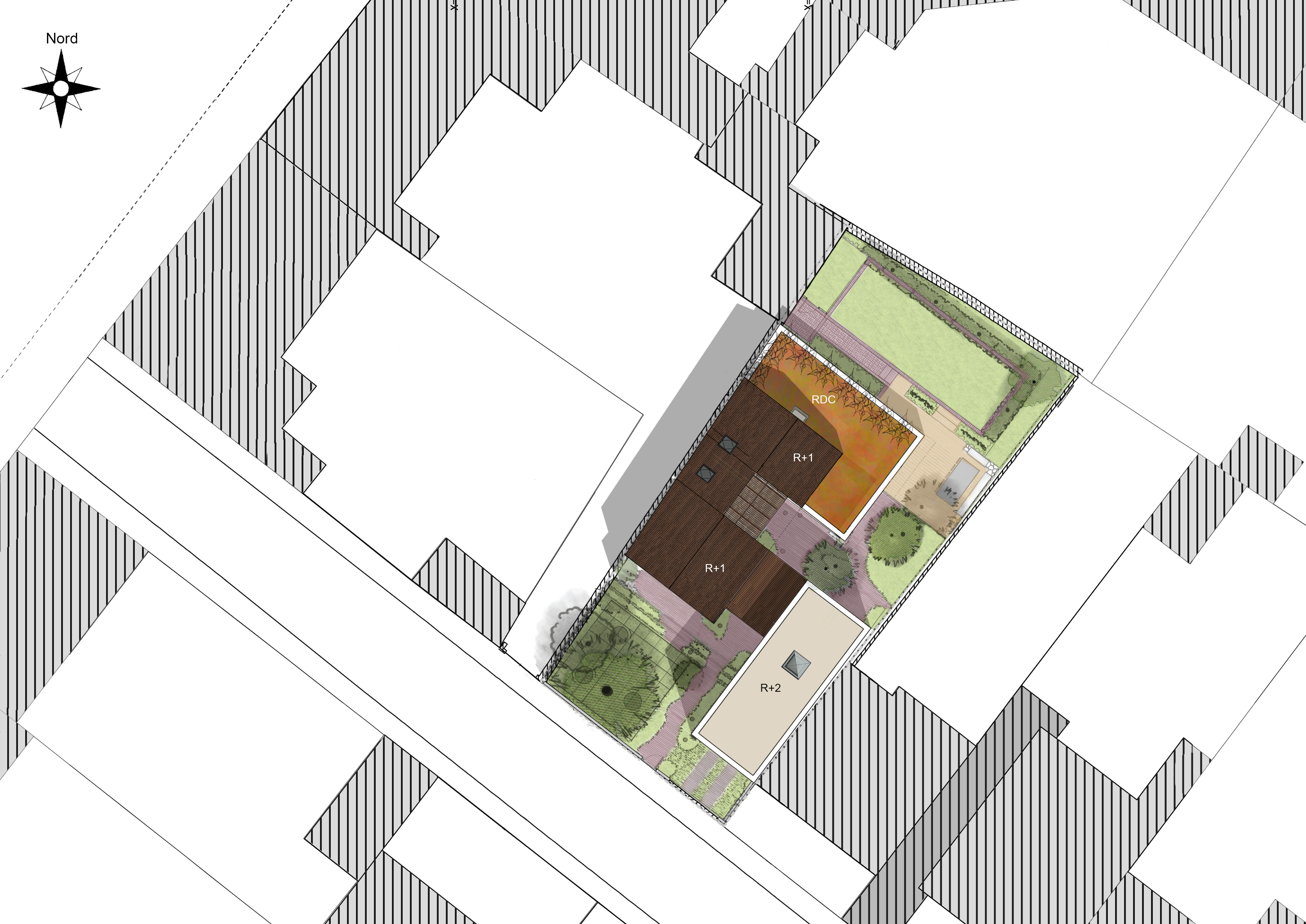 En plein cœur de la métropole Nantaise, le projet est de réaliser un lieu de vie préservé qui prend soin des individus (santé physique/mentale). Plusieurs niveaux de réponses existent dans le projet: - Par la dynamique des espaces à la fois ouverts et fluides facilitant des parcours diversifiés qui rendent le corps actif dans l'espace, - Par le recours aux matériaux sains et biosourcés, - Par la biophilie et l'importance accordé au paysage végétal, - Par l'apport de la lumière et les ouvertures vers l'extérieur. A l'aune des confinements, cette architecture qui apaise prend tout son sens.