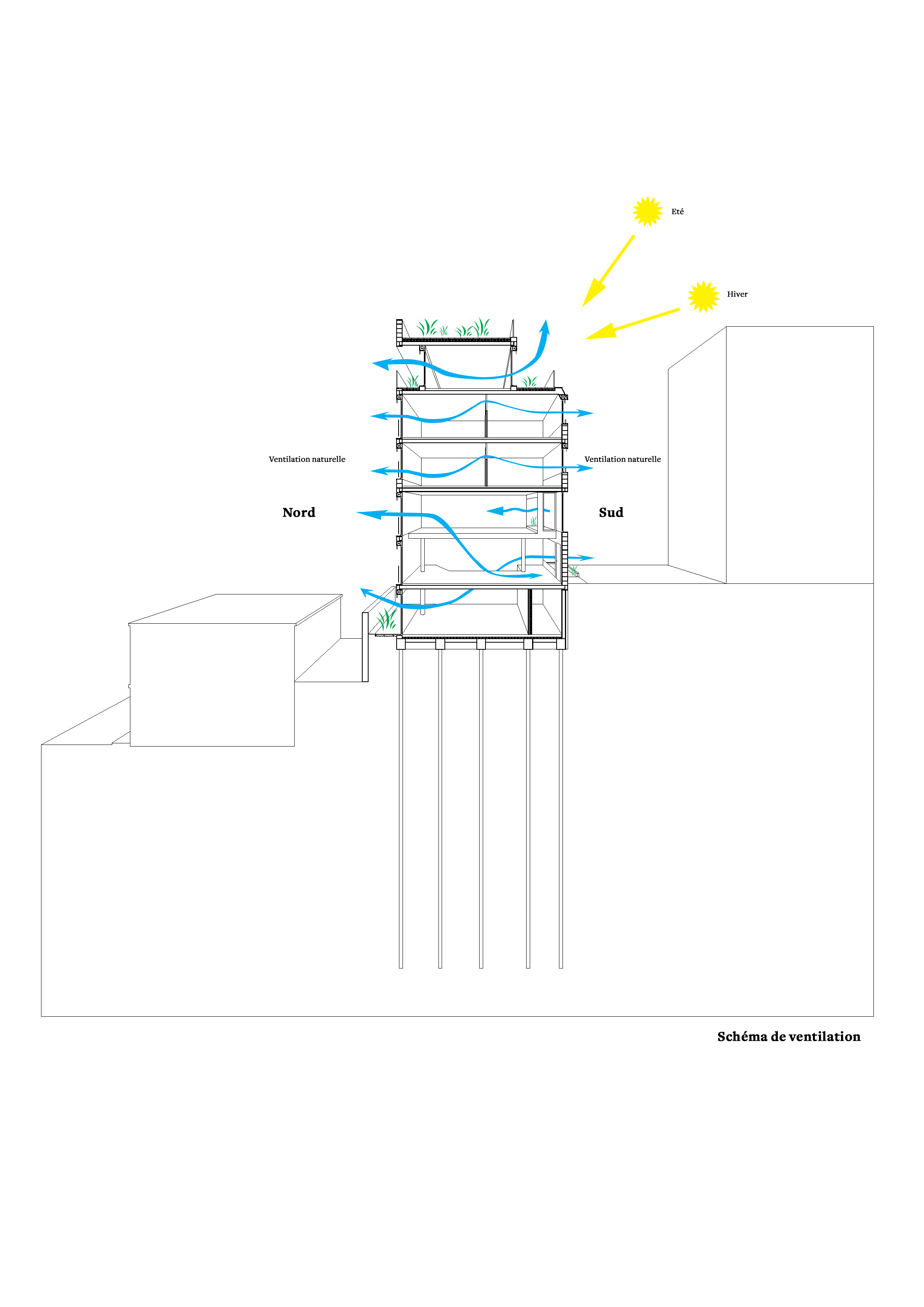 Descriptif technique : Perché sur 10 micropieux de 18m de long, le projet innove dans son mode constructif : il a fallu trouver une solution à la fois performante énergétiquement, peu épaisse pour perdre un minimum de surface habitable et la plus légère possible pour l’approvisionnement sur la Butte au sol fragile. C’est la brique de bois, complexe de 32cm composé à 80% de copeaux de bois, rebuts de scierie, qui intègre en extérieur son isolant en laine de bois, qui l’a rempoté pour ses nombreux avantages : peu de CO2 dégagé, grande performance thermique, excellente inertie, absorption des ondes sonores.