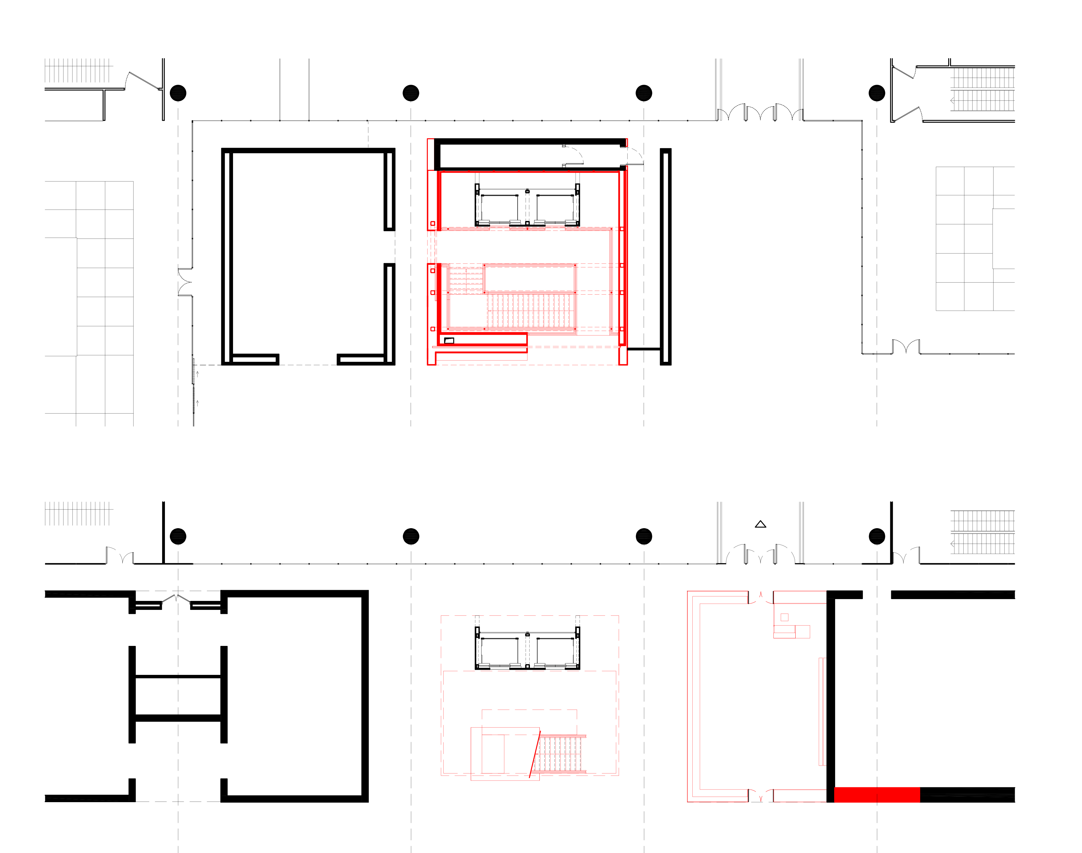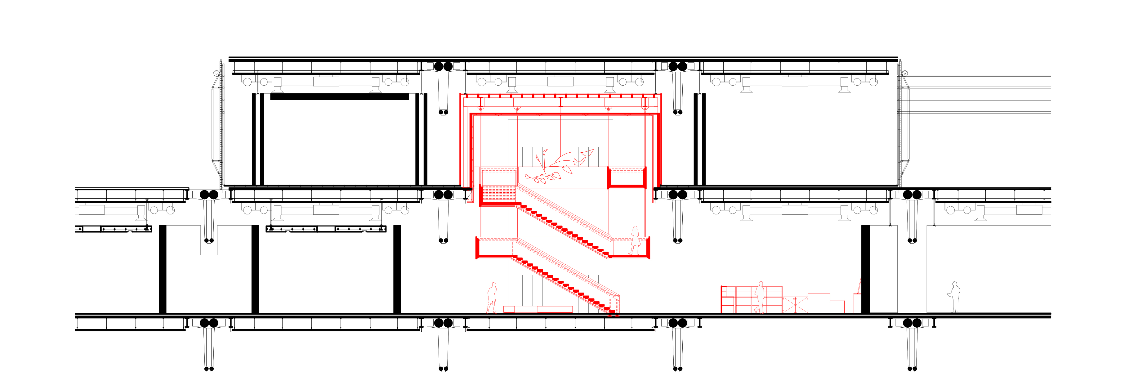 Descriptif technique de l'aménagement : La structure consiste en un assemblage d’éléments préfabriqués extraits du catalogue du fabriquant. Des limons porteurs composés de 4 panneaux de 4cm d’épaisseur sont suspendus à des tirants métalliques (eux même suspendus à des portiques métalliques). Les marches en bois massif ajourées viennent liaisonner les limons porteurs. L’ensemble est butonné sur la cage d’ascenseur adjacente.