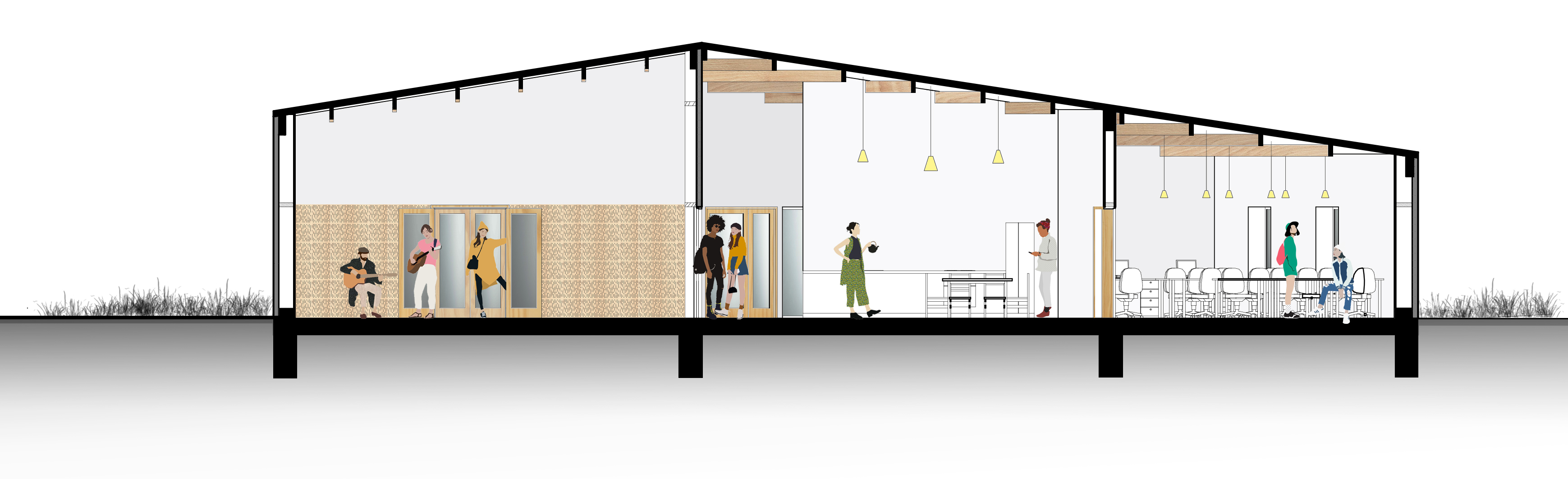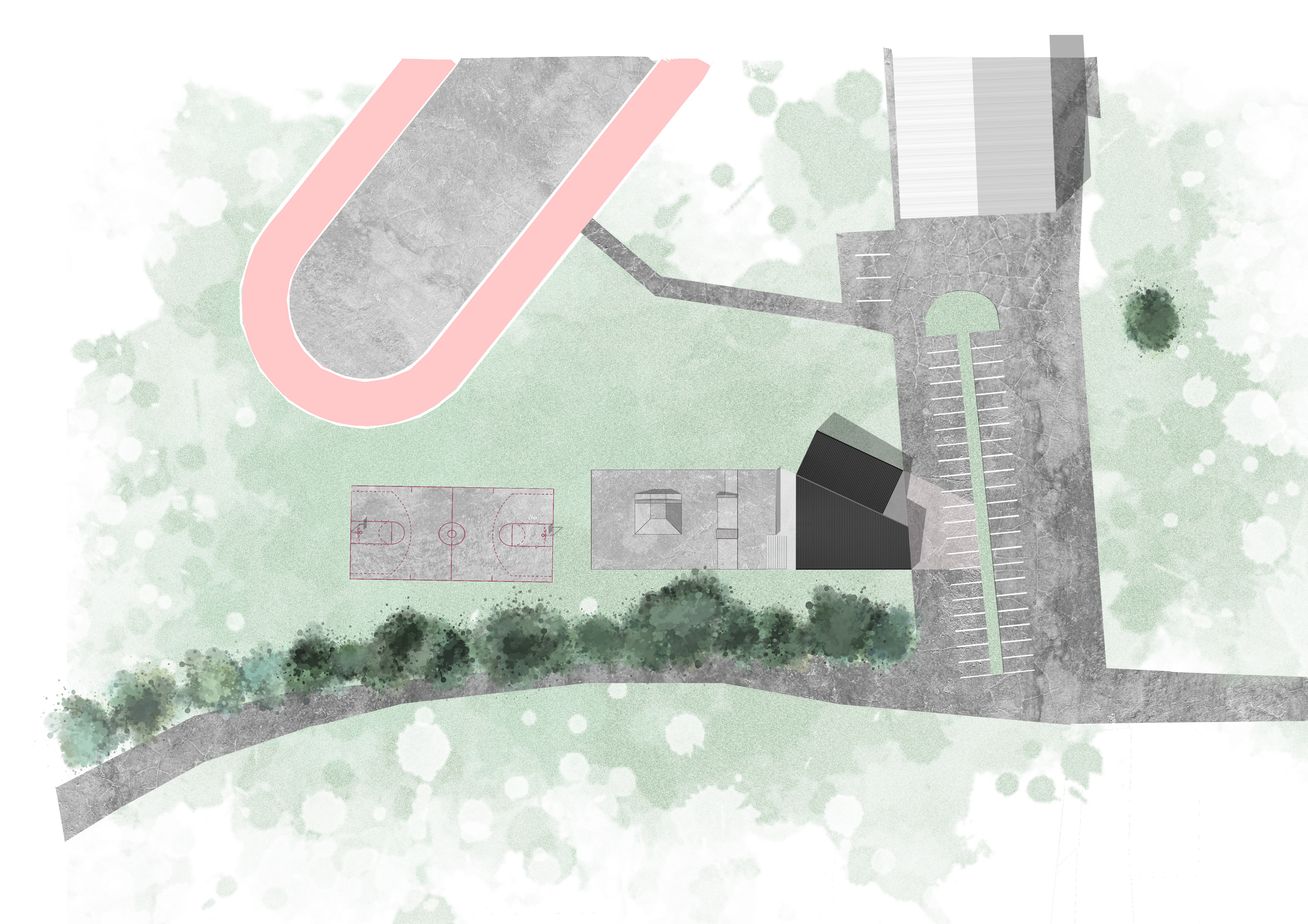 La maison des jeunes accueille diverses activités sportives, ludiques et manuelles. Le bâtiment s’implante dans le prolongement du skate park, en s’inscrivant dans la topographie du site. Le décroché au Nord crée un parvis d’entrée lié à la rue, tandis que de la façade Sud s’ouvre vers la piste de roller et le skate park. En intérieur, les espaces sont répartis de part et d’autre d’une grande circulation centrale et traversante : A l’Ouest, les salles d’activités ; A l’Est, les bureaux et la cuisine en relation avec le patio ; Au nord, les locaux de services accessibles depuis le parking.