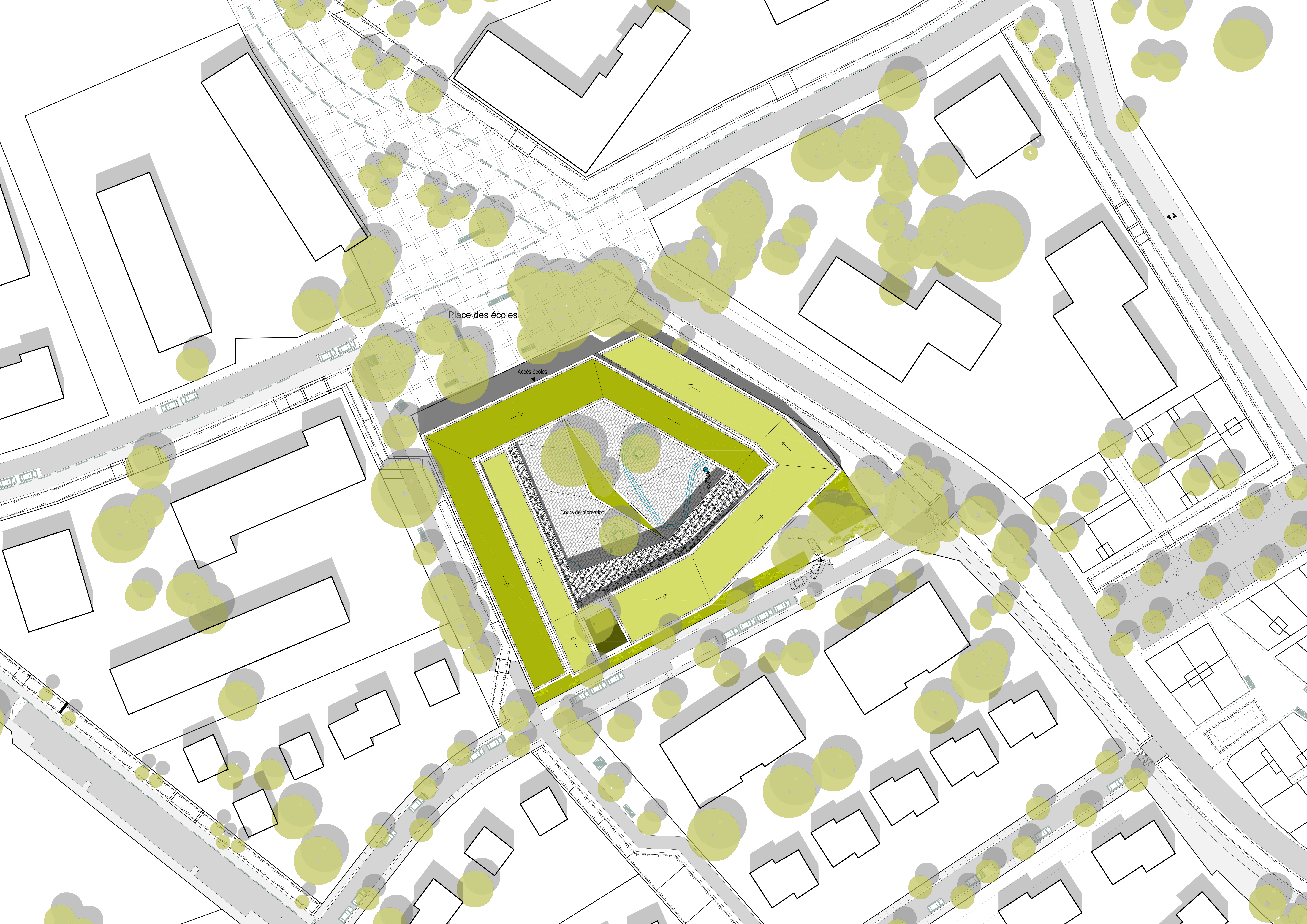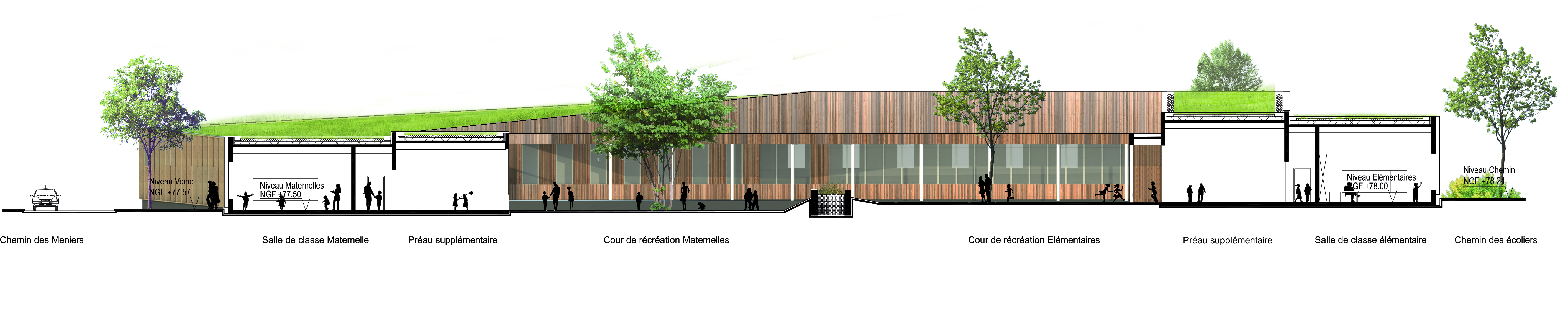 L’architecture de l’école épouse la parcelle et joue avec les différences de niveau du terrain pour minimiser son impact dans le site. Un jeu de toitures végétalisées crée un enroulement. L’intérieur d’îlot se laisse deviner en transparence à travers le Hall. Les salles de classe sont protégées de la surchauffe par des brise-soleil en bois, structurant les façades. La structure bois massive est apparente à l'intérieur du bâtiment en plafond et en mur et garantit une construction pérenne et une ambiance intérieure chaleureuse. La vêture bois extérieure révèle la matérialité bois.