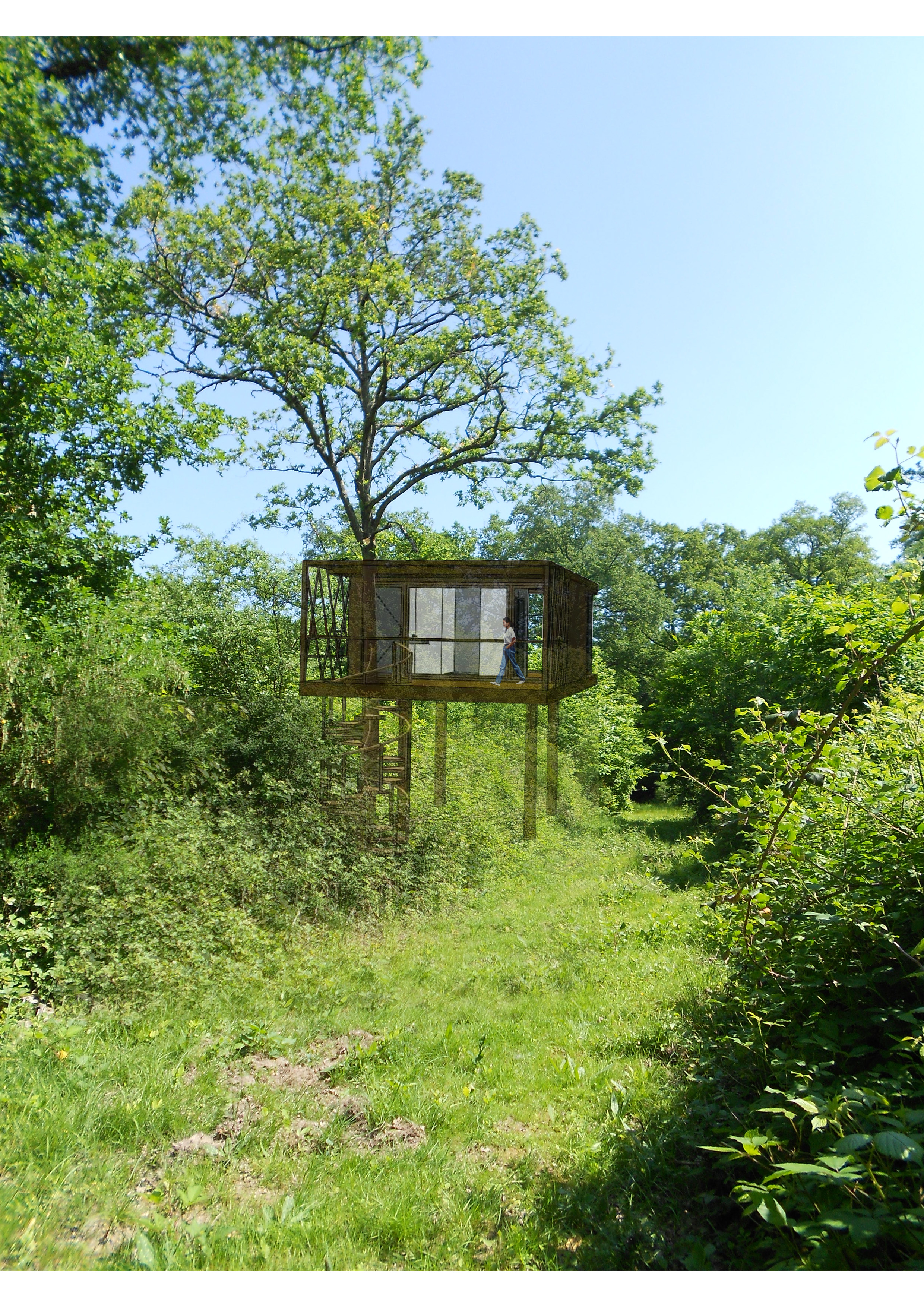 Au cœur d'une forêt de 300 hectares, 18 lodges de 30 m² avec une terrasse de 25 m² et un jacuzzi intégré, sont perchés à 4 mètres au dessus du sol, sur pilotis. Le système constructif poteaux-poutres est en douglas. Les façades du lodge sont en ossature et bardage bois. La toiture terrasse est en charpente bois et membrane. Les fondations sont en techno pieux. Une large baie vitrée fixe permet l'immersion dans la forêt, en osmose totale avec la nature. L'écolodge dont la terrasse est traversée par un chêne, domine la forêt.