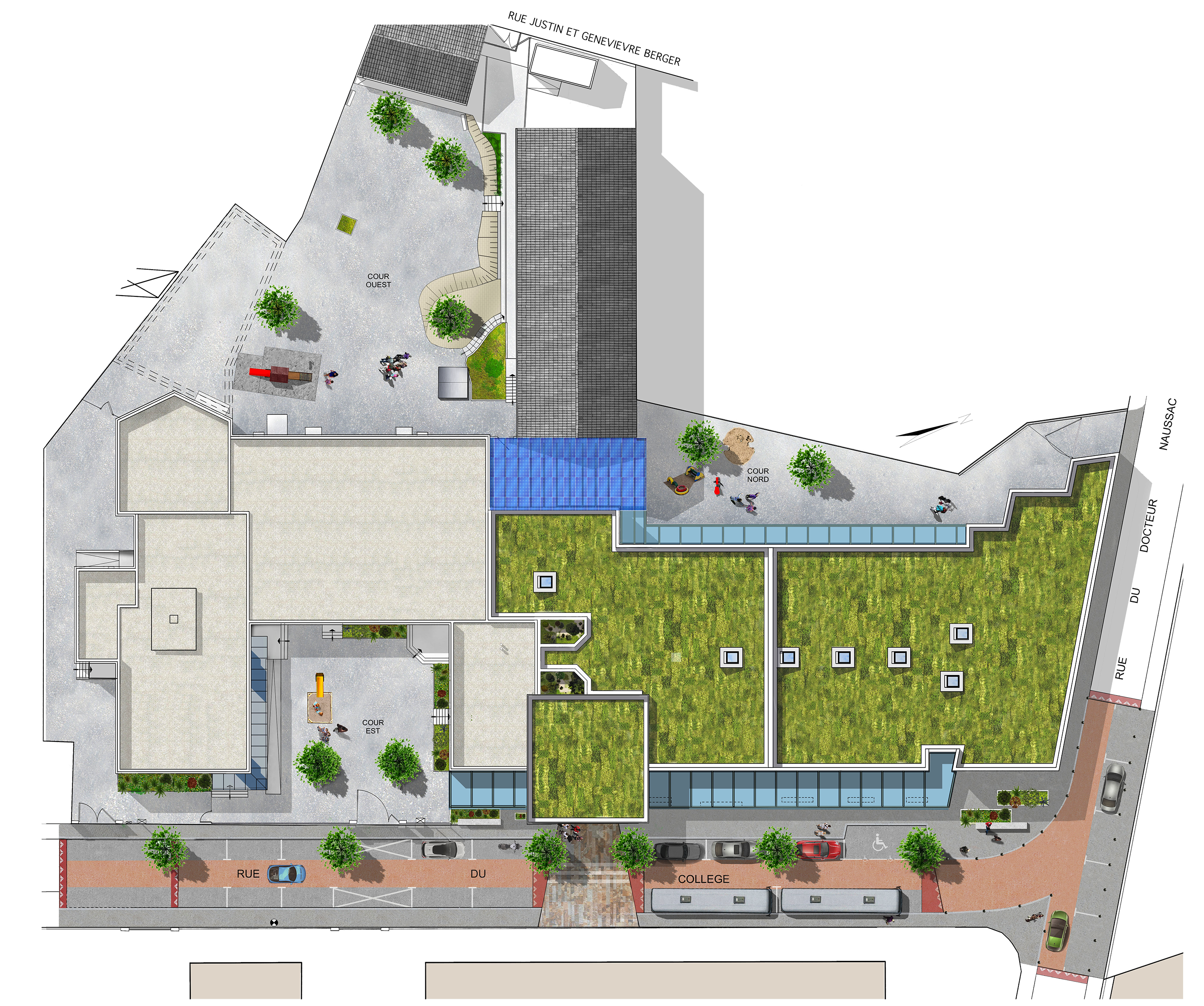 Approche environnementale : Nous avons privilégié les apports maîtrisés de lumière naturelle au coeur du projet et le traitement des points de changements de direction des circulations intérieures en les faisant correspondre avec des espaces de rassemblement, l’accueil d’entrée et ses patios, le préau central et sa lumière tamisée. La dimension des patios végétalisés est calculée pour éviter de longues périodes d’ensoleillement direct tout en apportant une quantité de lumière et un agrément visuel importants au centre du bâtiment. Lumineux, vivants au rythme des saisons et des heures qui passent.