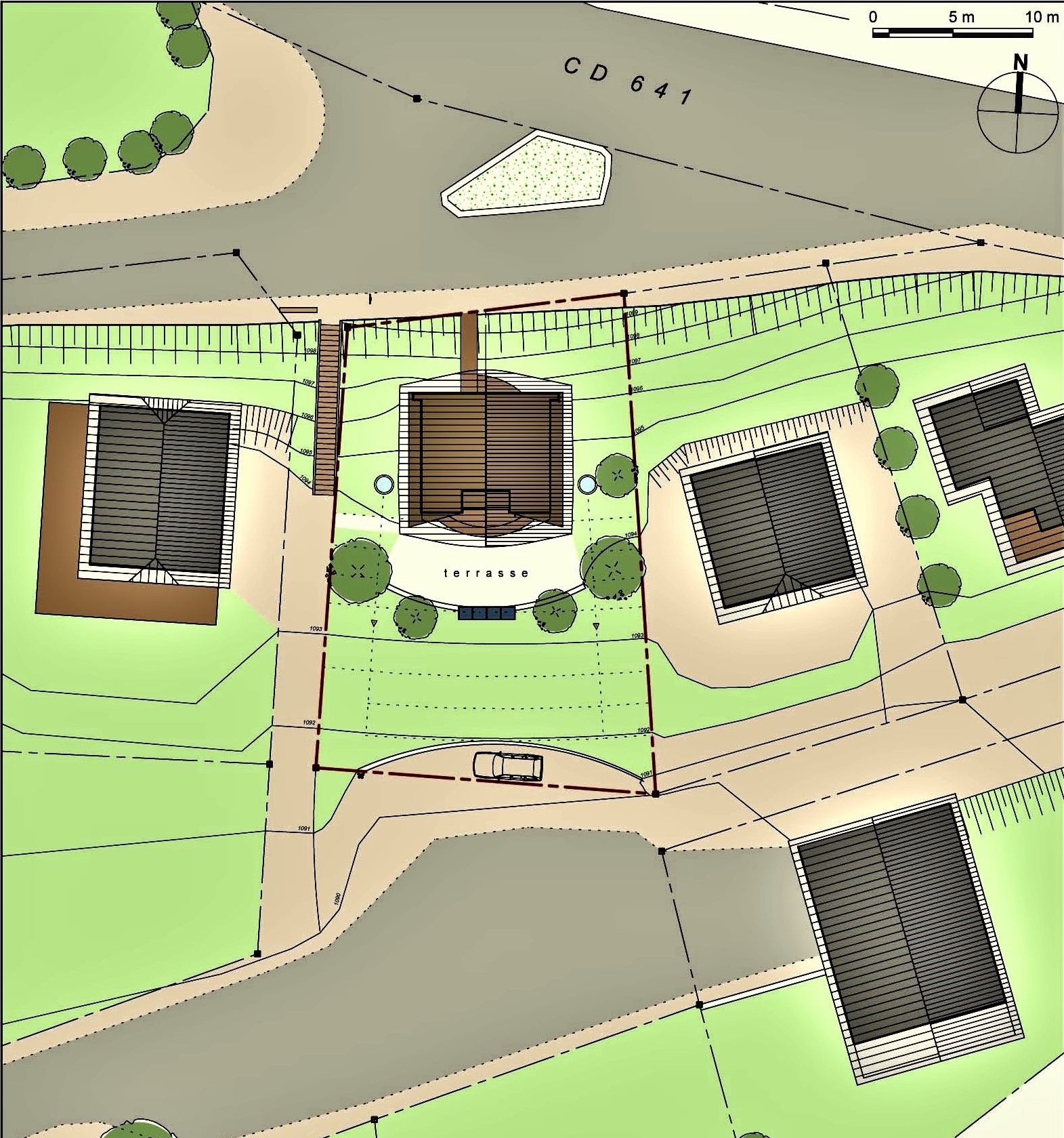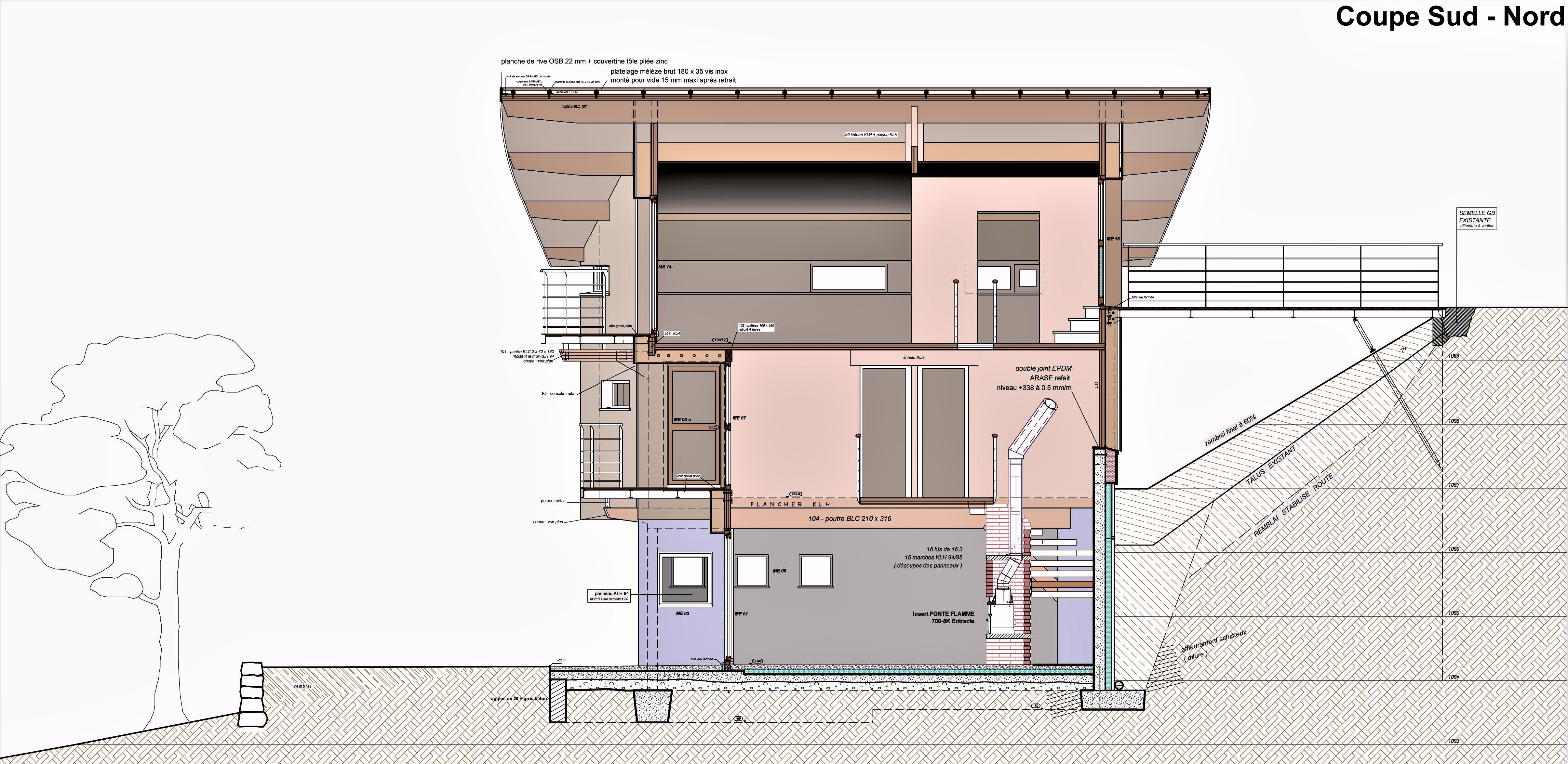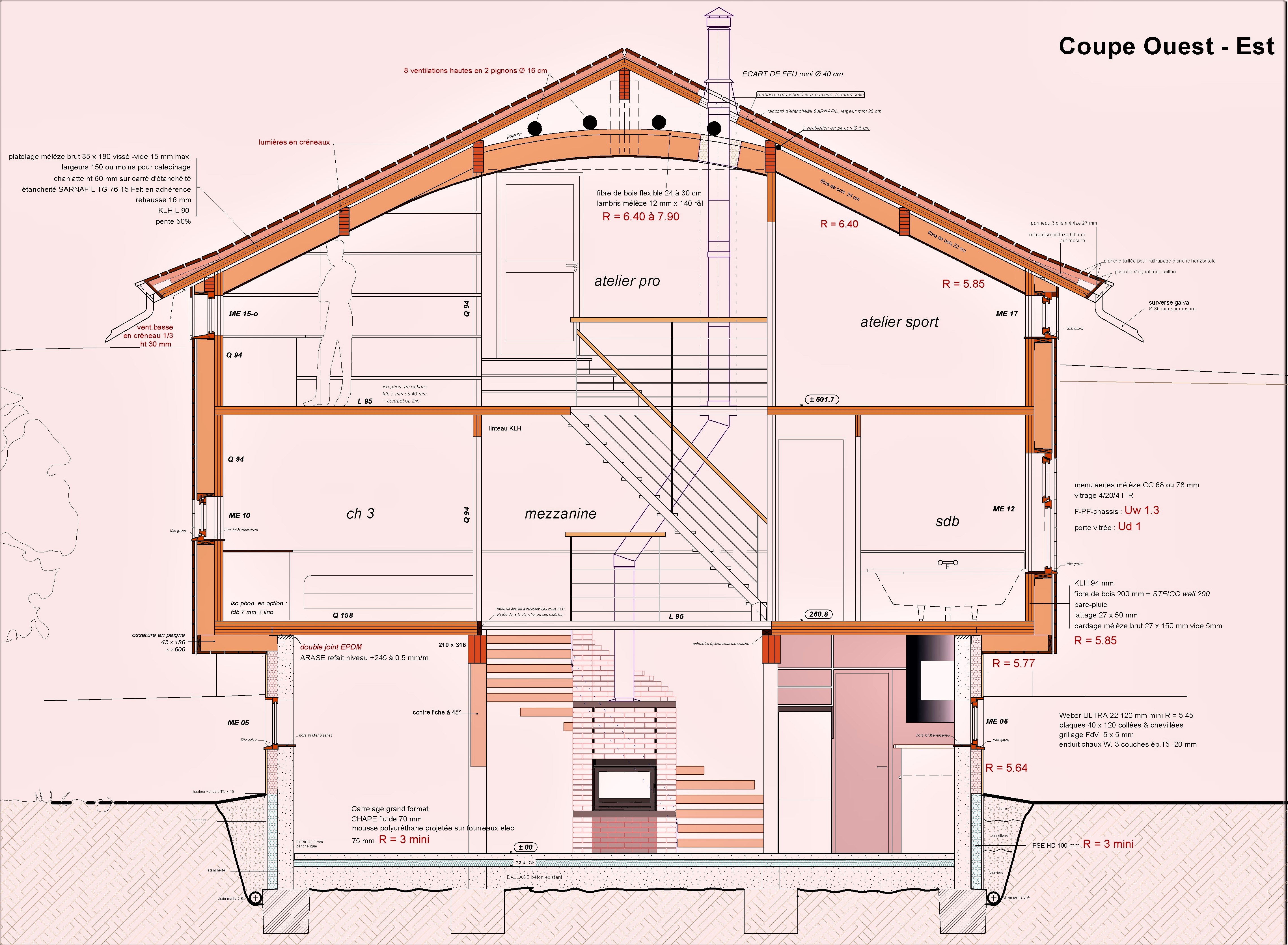 Descriptif technique : RdJ : mur soutènement arrière, façades : béton armé, ITE, enduits intérieur / extérieur à la chaux Etage et combles : planchers, façades, refends, toiture : . panneaux KLH, formant structure de boîte fermée sur 2 niveaux, huile de lin intérieur . poutres en refend, pannes : BLC . ITE STEICO poutres en I et laine de bois - étanchéité SARNAFIL, chéneaux intégrés - menuiseries mélèze carrelet 3 plis - bardage, platelage mélèze local, livré frais à l’avancement, brut - balcons, passerelle : acier galvanisé Chauffage : poêle de masse norvégien, rendement 90 %, 2 stères /an, 20 kWh/m²shon/an Bois des Alpes