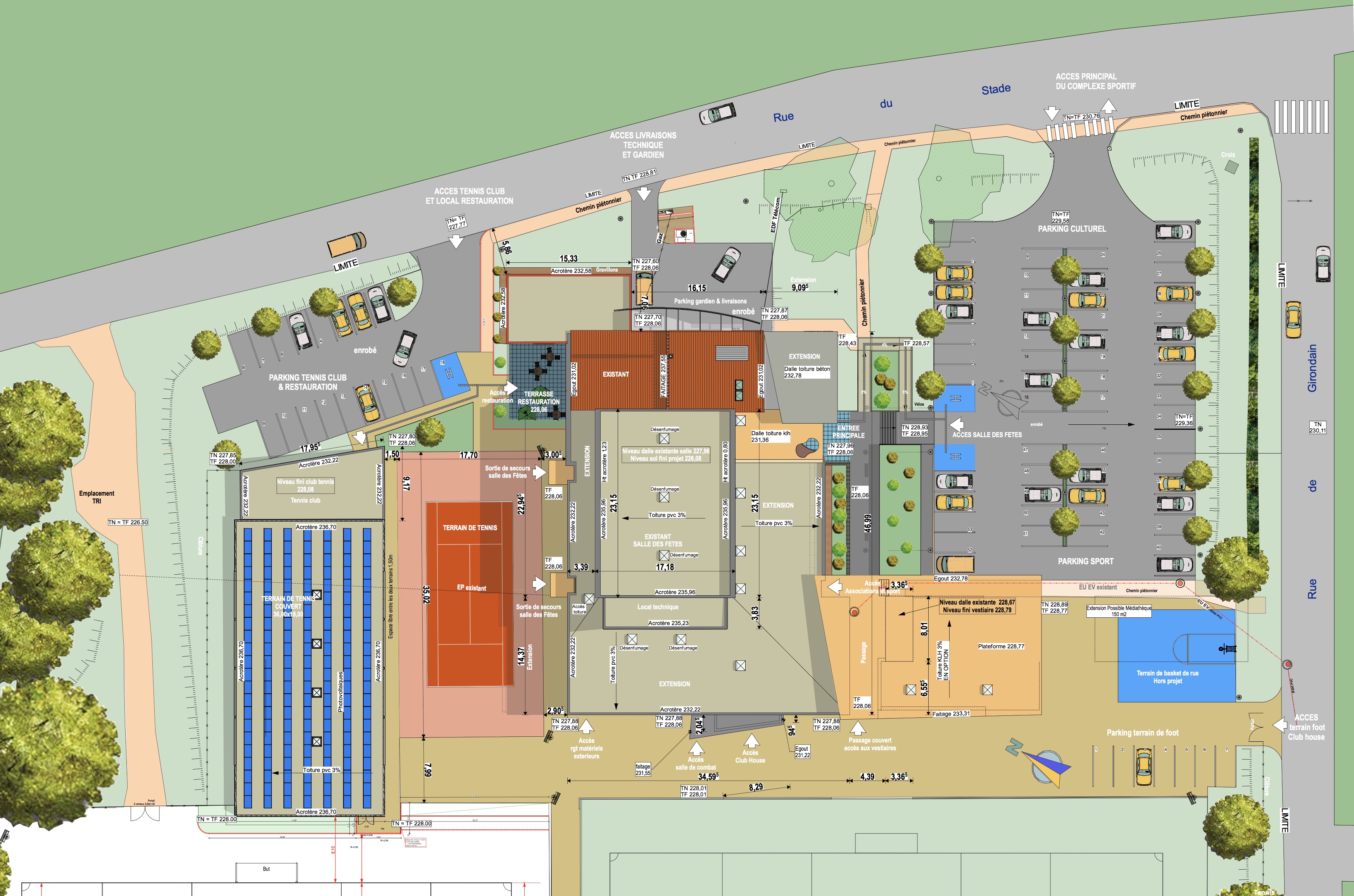 Restructuration et rénovation du bâtiment principal contenant la salle polyvalente. Ces travaux comprendront également une restructuration des espaces extérieurs avec une partie extension comprenant : - un terrain de tennis couvert recevant le club de tennis de table et un terrain de tennis extérieur, une salle de combat, des vestiaires sanitaires séparés, des vestiaires arbitre, des espaces de stockage pour les associations, deux salles de réunion servant de bureau pour les associations, un espace Club House, et un espace en restauration avec terrasse et un espace terrain de pétanque.