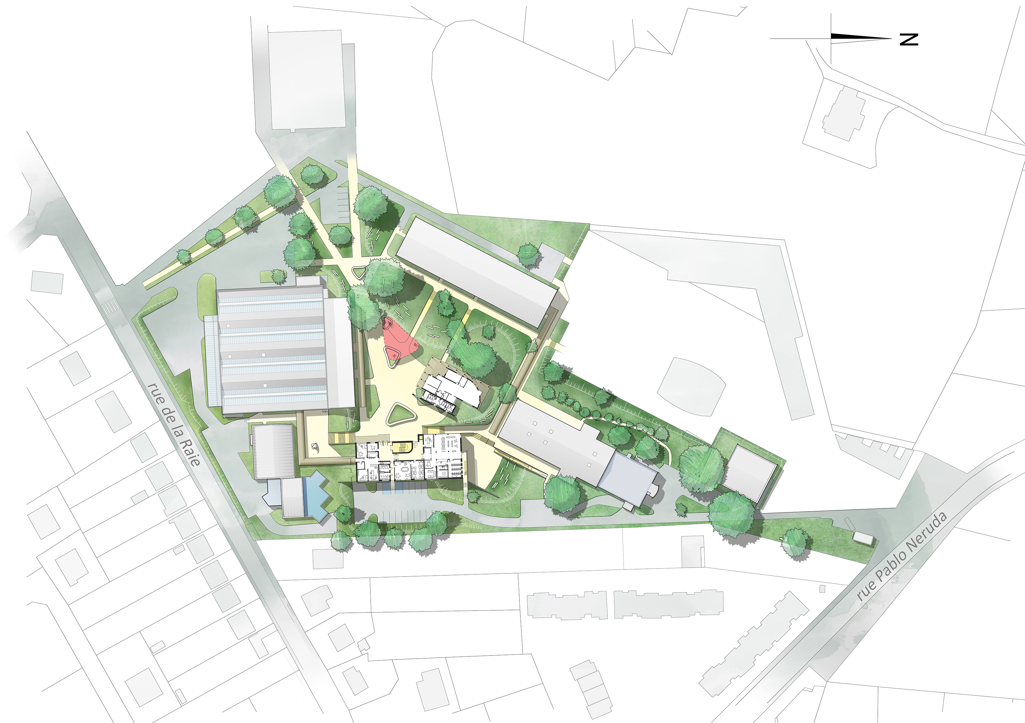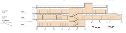 Lycée Pierre-Bérégovoy à Nevers Reconstruction du bâtiment Externat Bâtiment construction bois : livraison décembre 2020 Conseil régional de Bourgogne Franche-Comté maître de l’ouvrage, SPLAAD mandataire Une équipe de maîtrise d’œuvre locale composée de 5 architectes associés : Charlotte Jackman-Allain, Pascal Mallard, Dominique Maringe, Atelier Videau, ABW Warnant Patrice Warnant mandataire commun Ingénierie : Sylva-Conseil / structure construction bois Chevrier Ingénierie / structure BA LP Energies / énergies Aïda Acoustique / acoustique Entreprise bois : LCA Les Charpentiers de l’Atlantique Quand le bois remplace le métal La reconstruction totale du bâtiment de l’externat du Lycée Pierre-Bérégovoy, en métal de type Pailleron détruit par incendie, est destinée à recevoir le cœur de l’établissement et à incarner une nouvelle centralité au lycée. Ce nouveau bâtiment donne l’opportunité d’affirmer l’identité du lycée et de fédérer cet ensemble composé de bâtiments hétéroclites (ateliers, bungalows…), tout en requalifiant les espaces extérieurs (entrée, placette centrale). L’utilisation du bois pour les murs, cloisons et planchers (panneaux CLT) a été intégrée dès le début du projet (stade concours) afin de traduire cette dimension environnementale tellement essentielle aujourd’hui. Diverses vêtures (bardage métallique à joint debout ou perforé, panneaux composites) viennent habiller ce bâtiment-bois afin de le protéger des intempéries, à la demande du Conseil Régional. Les ouvertures, positionnées en façade de manière aléatoire, viennent rompre et dissimuler le rythme des salles de cours tout en reprenant ce qui fait l’identité du Collège des Loges voisin (Froidevaux, Maringe, Warnant architectes). Le « phare » au dessus de l’entrée traduit la centralité du site en renforçant la dynamique du lycée et le lien entre dedans et dehors.