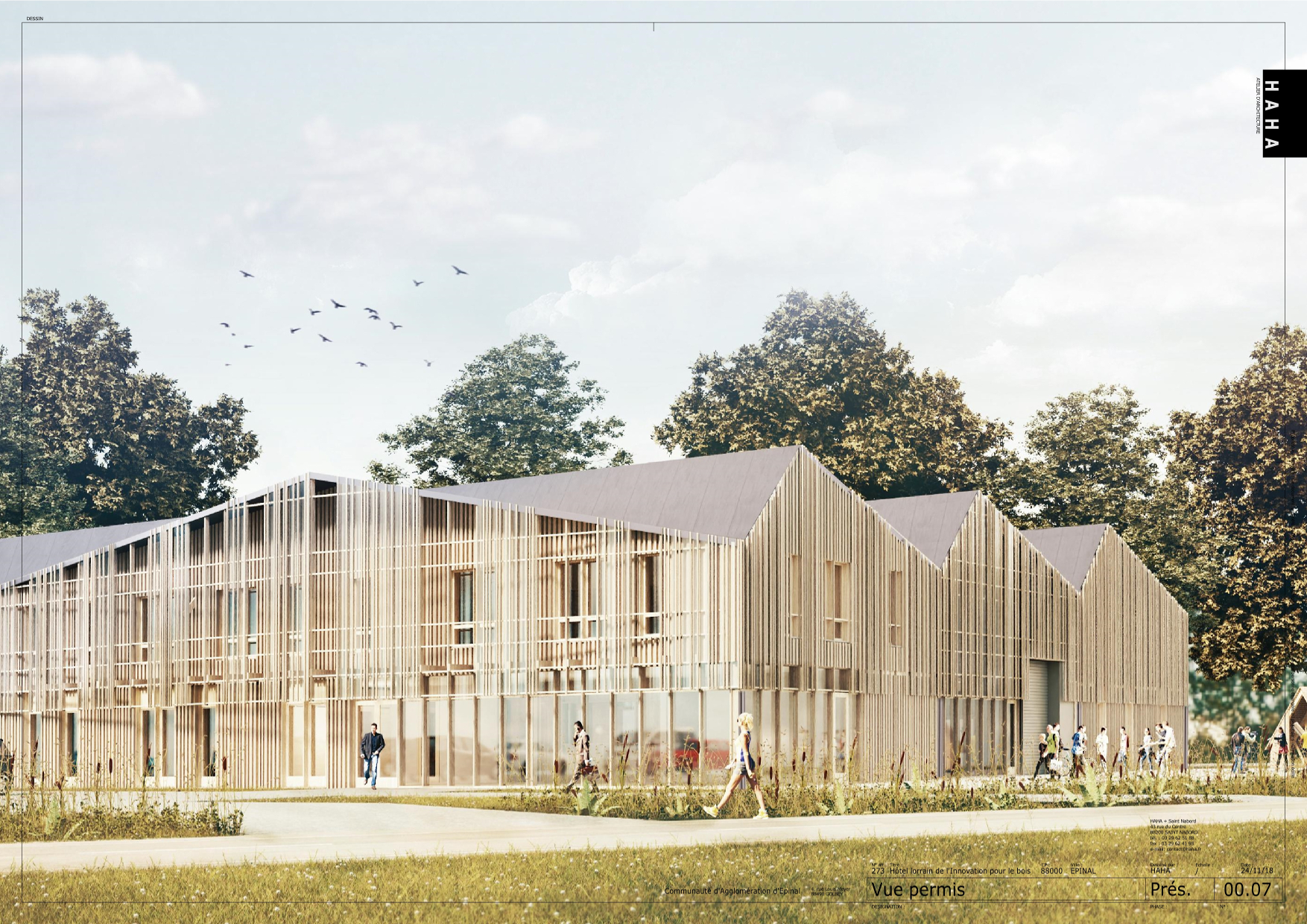 Ce bâtiment de 1200 m² évoquant les archétypes des fermes et usines vosgiennes regroupe un fab lab et un incubateur d'entreprises spécialisés bois. Sa structure et son enveloppe performante alignée aux objectifs du label E3C2 permettent d'accueillir les particuliers comme les professionnels dans une ambiance de travail chaleureuse et conviviale. L'édifice exprime sa singularité par le plissage de sa toiture. La charpente arborescente et nervurée évoque une structure végétale, elle couvre et abrite les espaces intérieurs d'étude, de coopération, d'expérimentation et de fabrication.