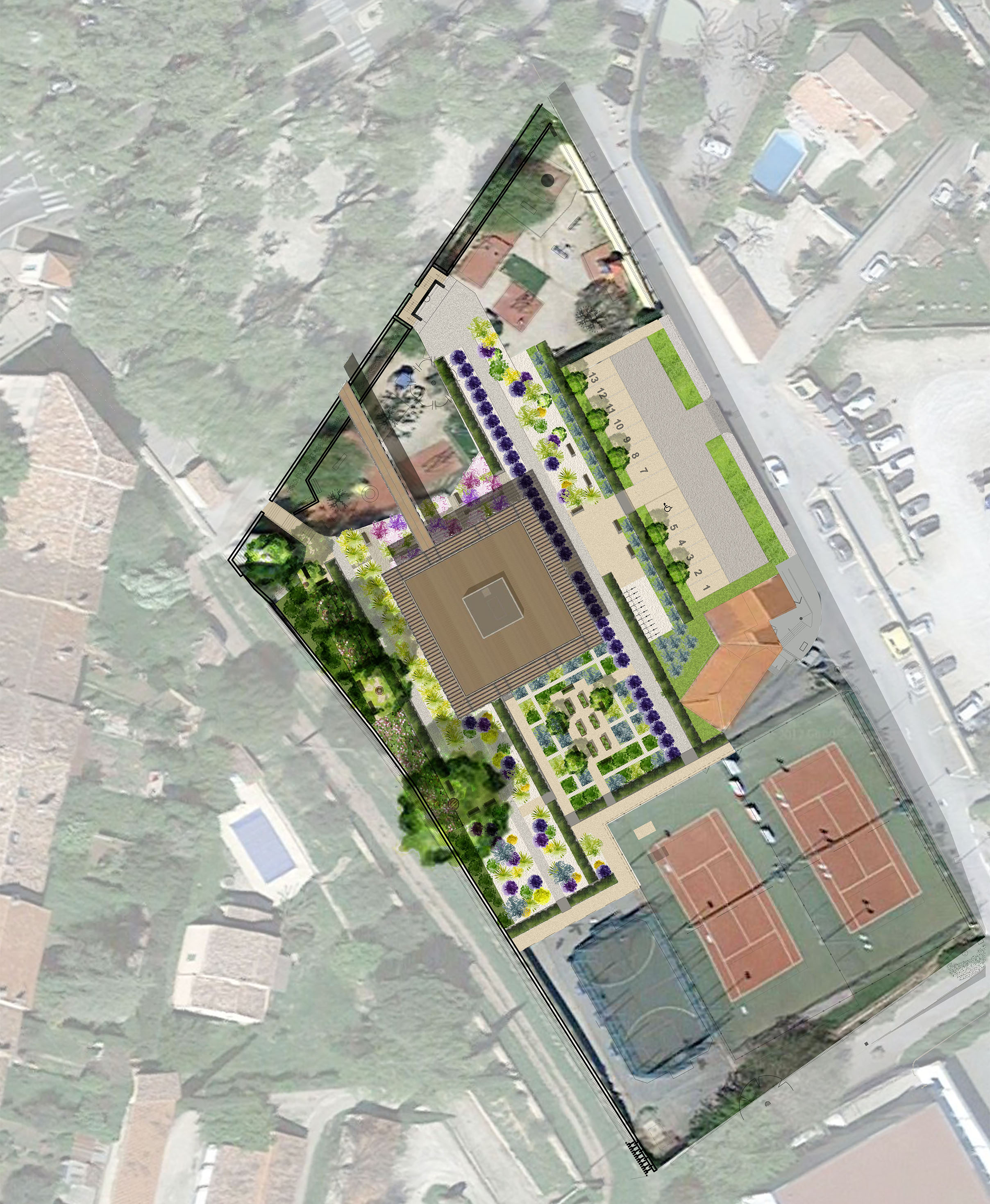 La maison de santé est conçue comme un pavillon en harmonie avec le paysage. Le bâtiment ne s’impose pas et s’insère, au contraire, délicatement dans la végétation alentour. Une sur-toiture légère, en bois, filtrant le soleil, nervurée comme une feuille d’arbre apposée sur une charpente en bois, fine, raffinée, délicate, savante. La maison de santé ne se limite pas à l’enceinte de ses murs, elle se prolonge à l’extérieur, par un jardin méditerranéen, plein de senteurs. Elle est alors comme un petit pavillon dans ce beau jardin, une curiosité attirante.
