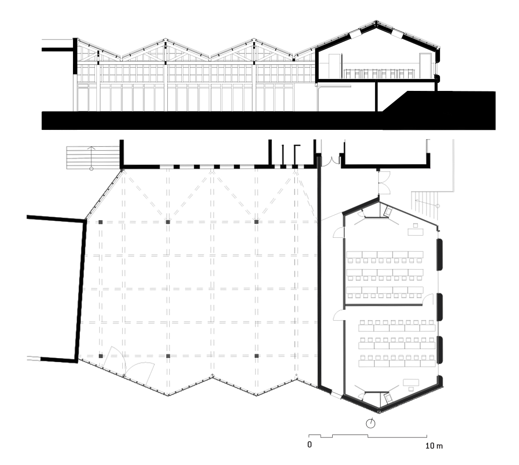 Descriptif technique : La construction est à 90% en filière sèche. Les caissons à ossature bois du plancher sont isolés de ouate de cellulose, les murs et la toiture sont isolés par des bottes de paille et une partie en chaux-chanvre projeté. La charpente de la couverture de la halle a été construite sur des poteaux en rondin de frêne des Vosges du Nord juste écorcés. Les salles de classe sont chauffées par la ventilation double flux raccordée au réseau de chaleur de la chaufferie bois à proximité.