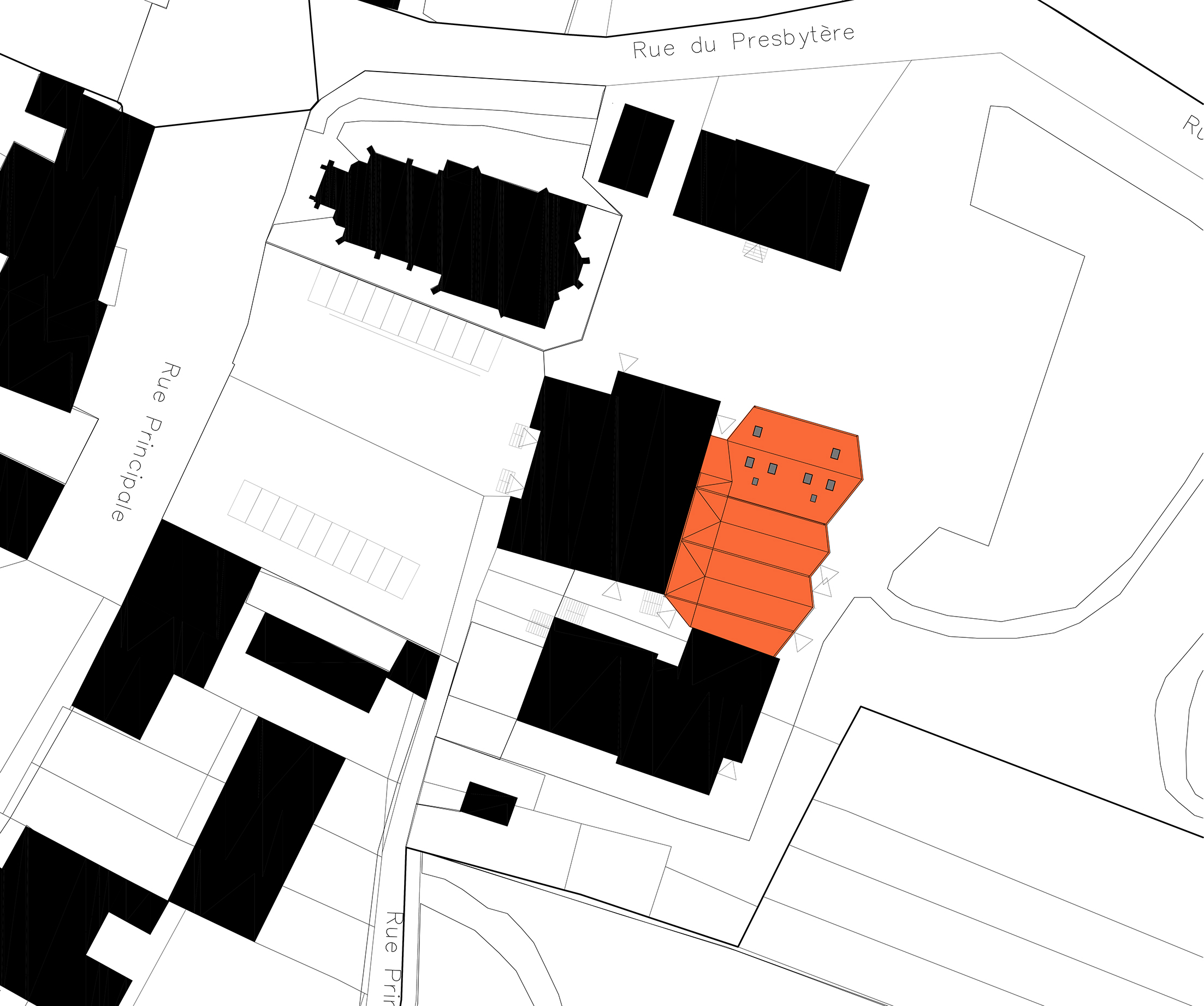 Cet ensemble architectural complète et achève la série d’extension déjà opérées depuis l’origine de l’école-mairie. Le projet prend la forme d’un pliage du toit et de la façade tel un origami. Il articule la continuité des bâtiments de l’école par un enduit à la chaux mais avec des ouvertures variées. Il revêt une image plus abstraite vers le parc au Nord, avec le découpage du toit qui répond à ceux existant de l’ancienne école et de l’église et un bardage de planches verticales de mélèze brut de sciage.