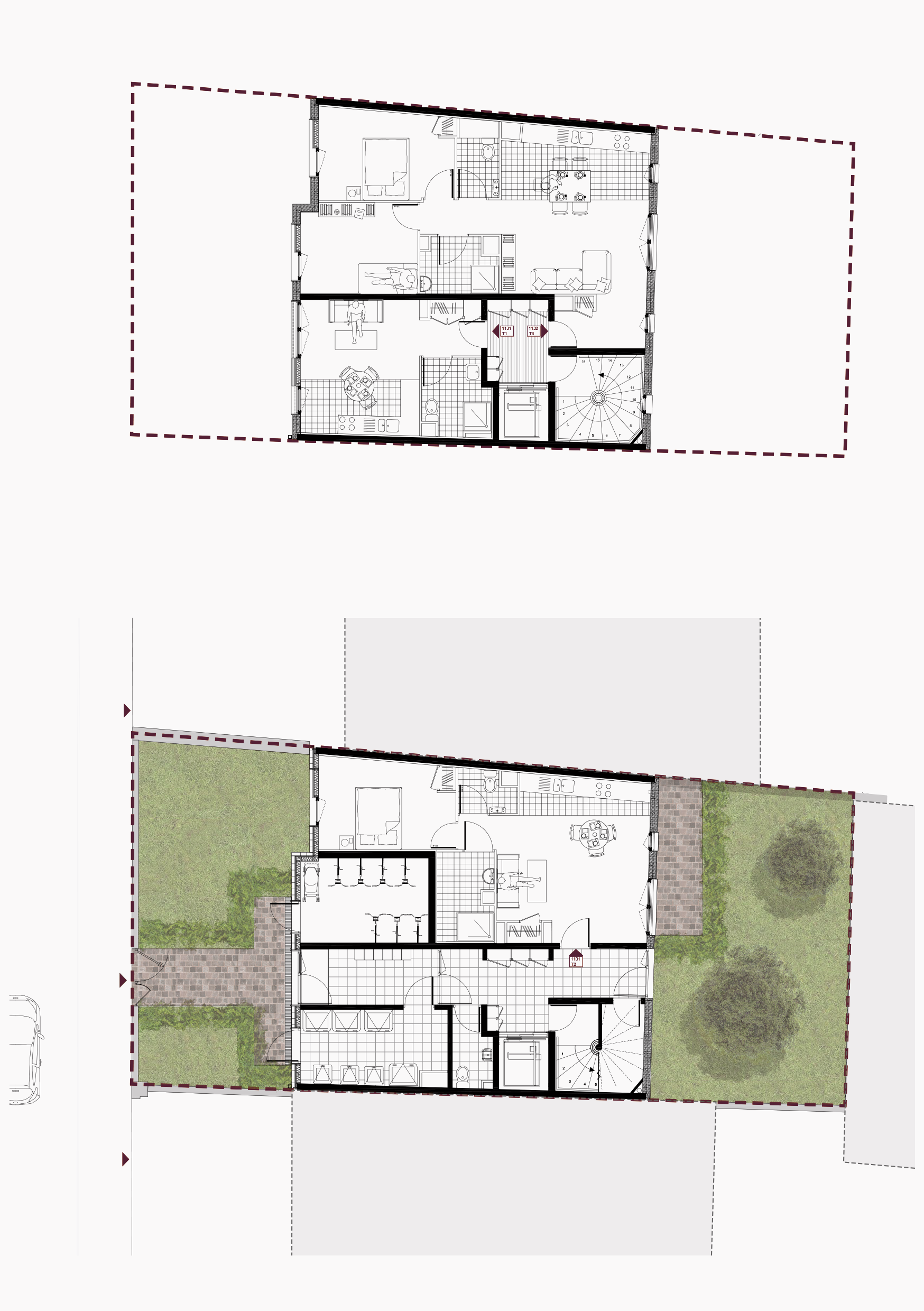 Le projet se niche entre deux immeubles des années 70-80, et permet leur articulation par une écriture architecturale sobre et rationnelle. Sa composition obéit à une logique verticale qui assume les proportions produites par une parcelle étroite et des immeubles voisins de grande hauteur. Le socle du bâtiment s’élève sur deux niveaux en brique pleine, assurant la continuité visuelle avec les héberges et affirmant son lien avec le sol. L’enduit à la chaux dialogue avec la pierre calcaire. Les cadres et volets en bois affirment la domesticité du seuil entre la rue et l’intimité des logements.