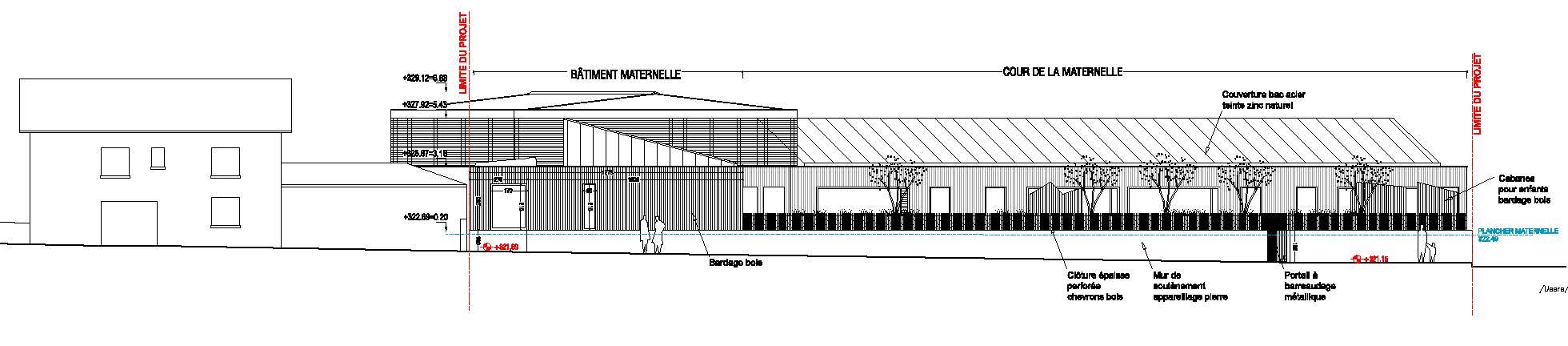 Descriptif technique : Dalles bois isolées en ouate de cellulose. Murs et caissons de toiture en bois isolés en bottes de paille entre ossature. Menuiseries bois alu. Les salles de classes sont en parquet bois, et revêtements ajourés en bois aux murs. Chauffage par batteries chaudes sur la ventilation double flux. le bois est également utilisé en extérieur (palissades et cabanes dans le jardin, bardage, le tout en douglas du limousin non traité).