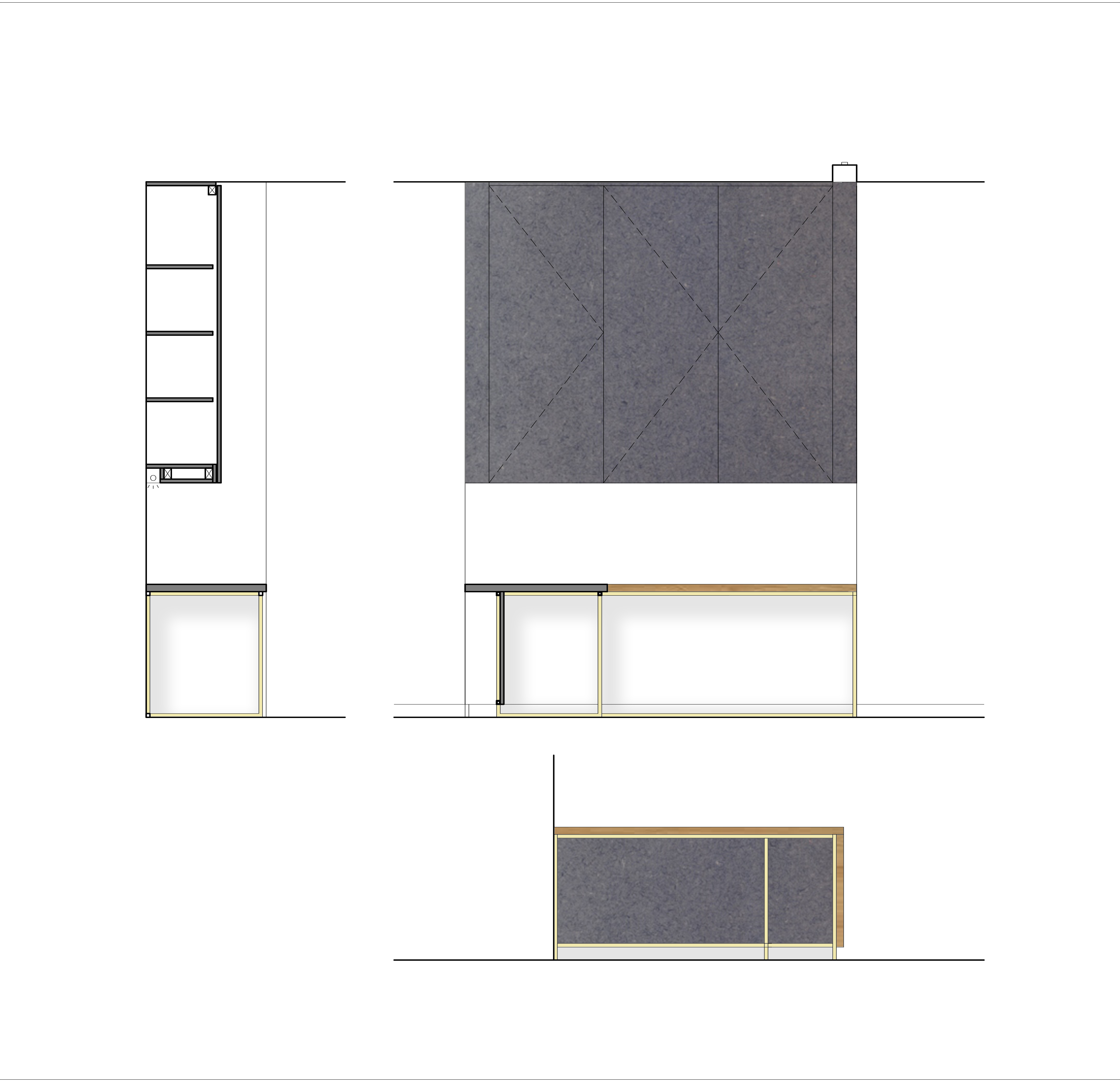 Descriptif technique de l'aménagement : Tout l’aménagement est fait sur mesure, et a été réalisé en grande majorité sur site pour s’ajuster au mieux aux contraintes de l’existant.