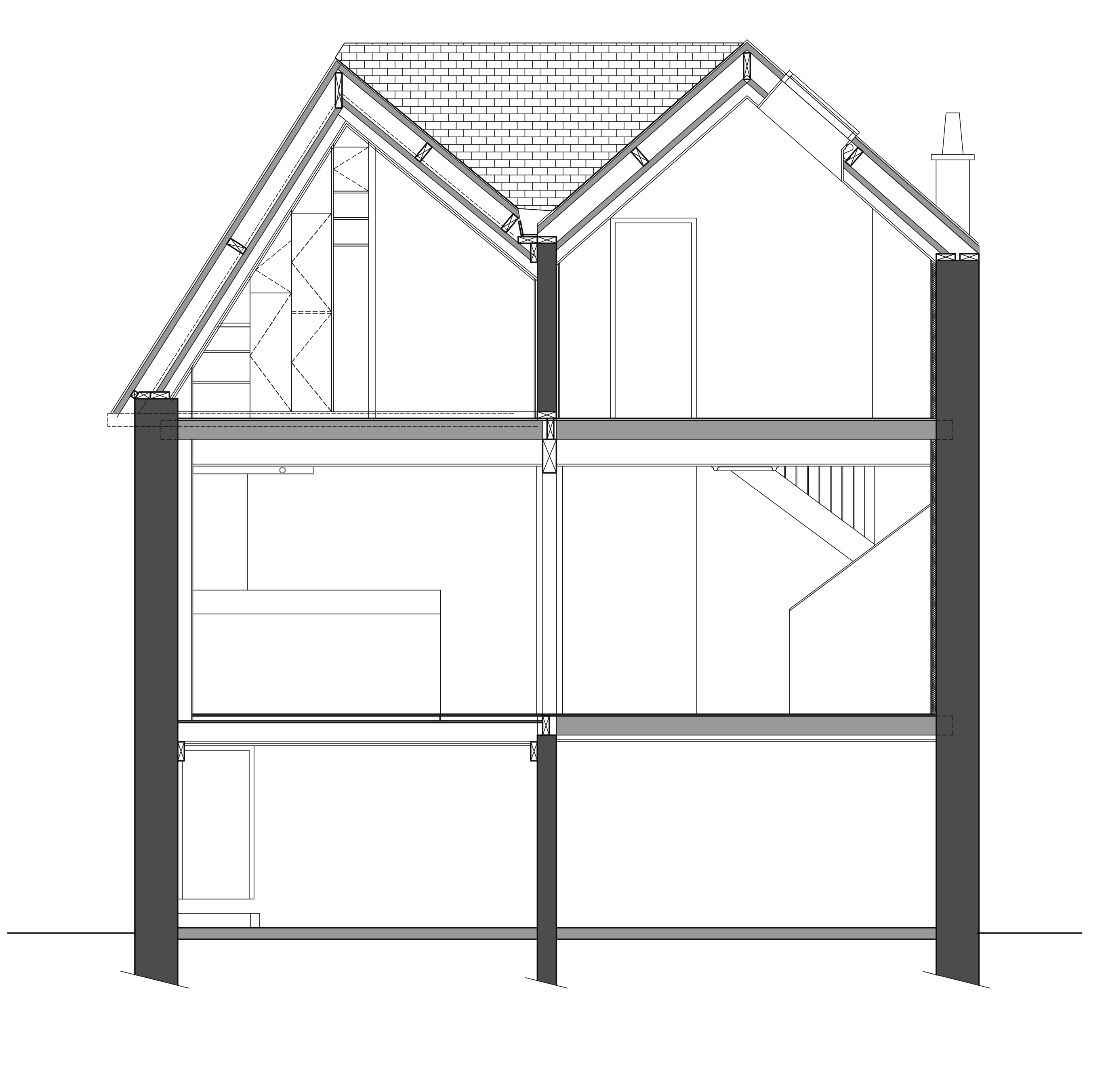 Descriptif technique : Le projet consiste à modifier la charpente traditionnelle de la maison pour une créer une "lucarne-pignon avec une grande ouverture sur le jardin" ; La complexité du projet réside dans la livraison de la grande baie vitrée triangulaire et son implantation minutieuse dans la charpente bois.
