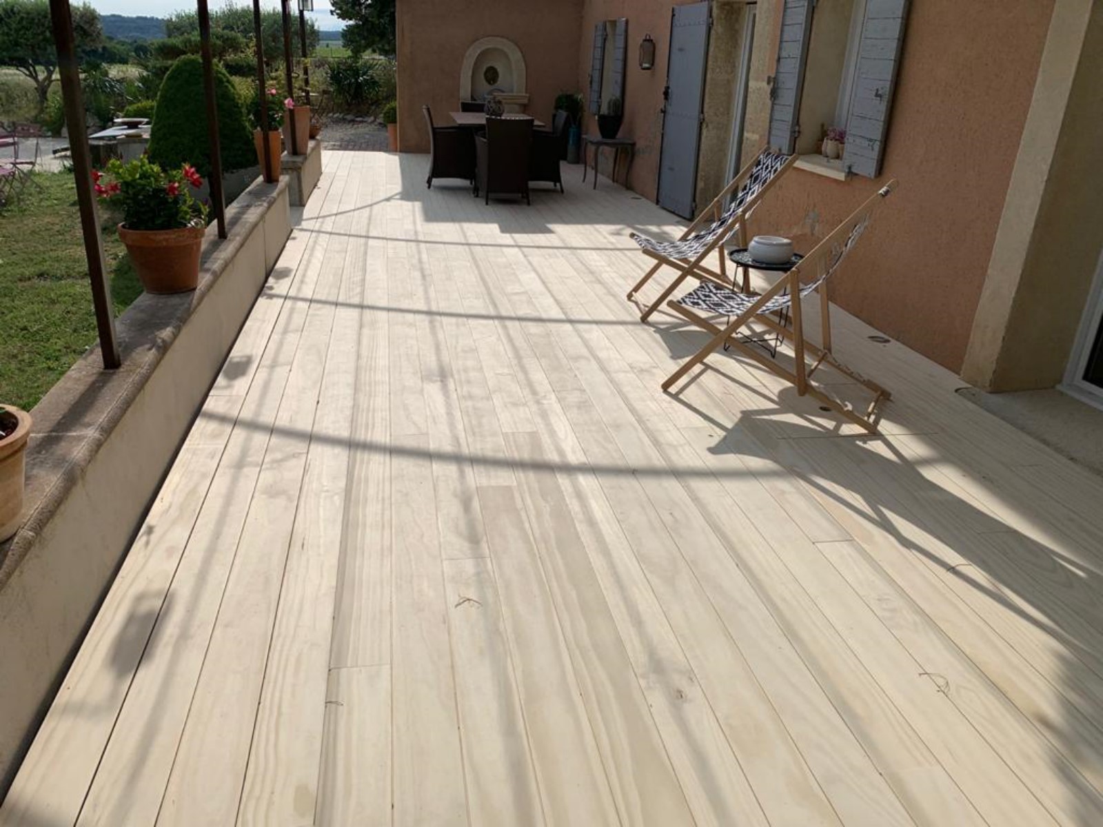 Nous façonnons sur-mesure du bois ACCOYA reçu brut. Ainsi, sur cette terrasse nous avons fabriqué un plancher en largeur 150 mm (mais nous pouvons réaliser les largeurs et profils souhaités pour construire des lames de terrasses, du bardage bois, du revêtement intérieur de murs,...), toujours pour des constructions 100 % sur-mesure en Luberon. Le plancher est construit sur lambourdes en bois ACCOYA. Le plancher est fixé avec un système de fixation invisible en Inox.