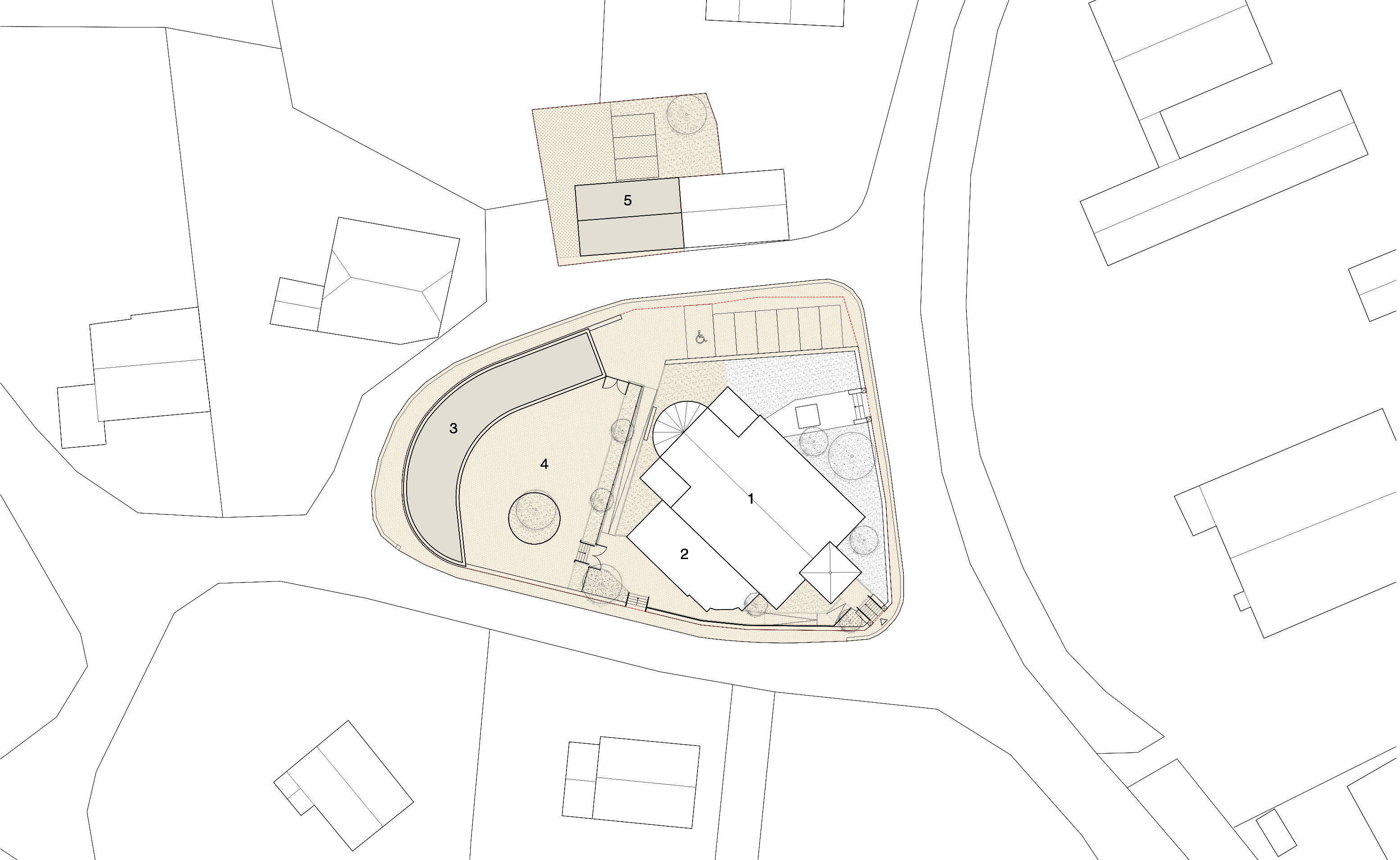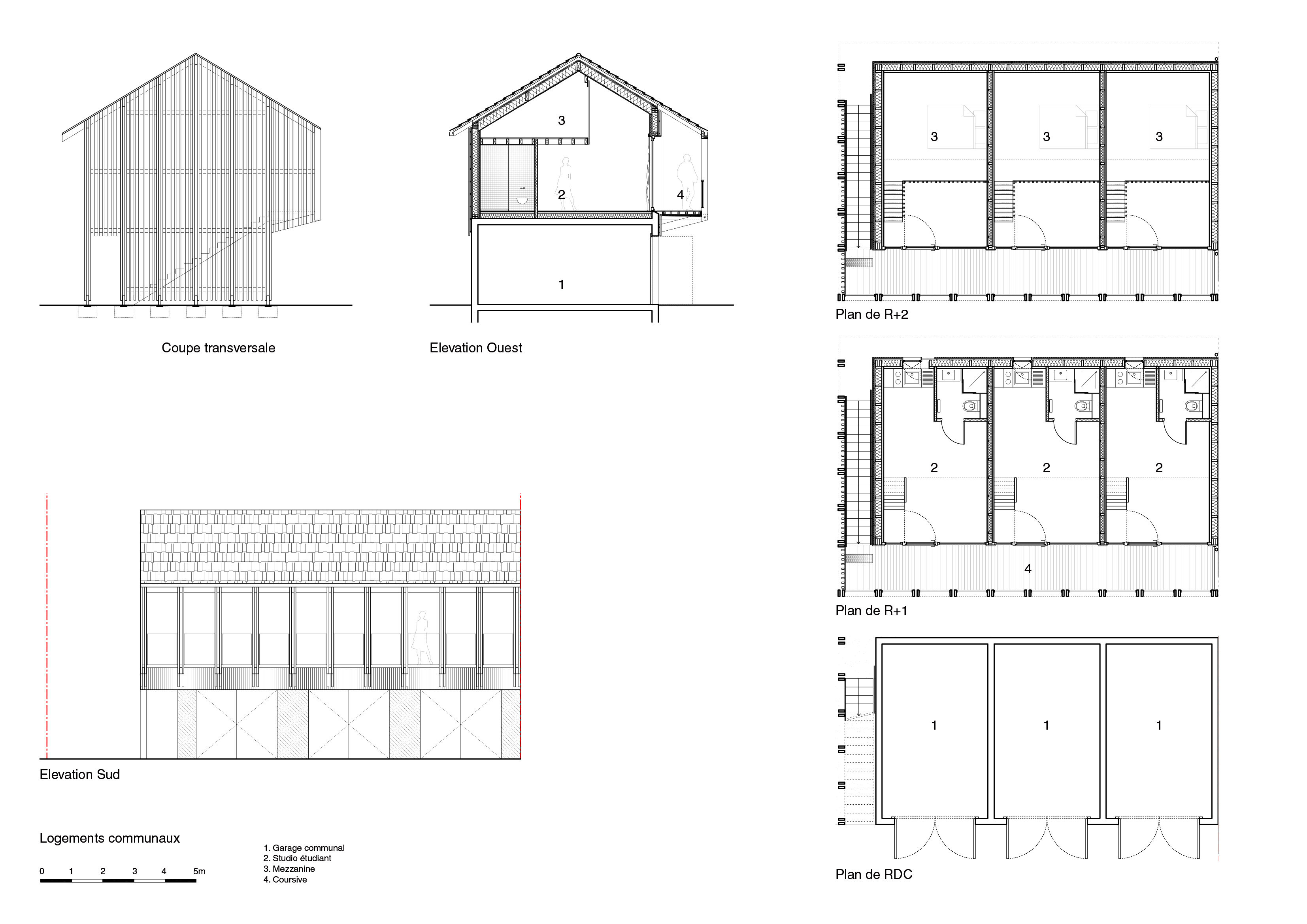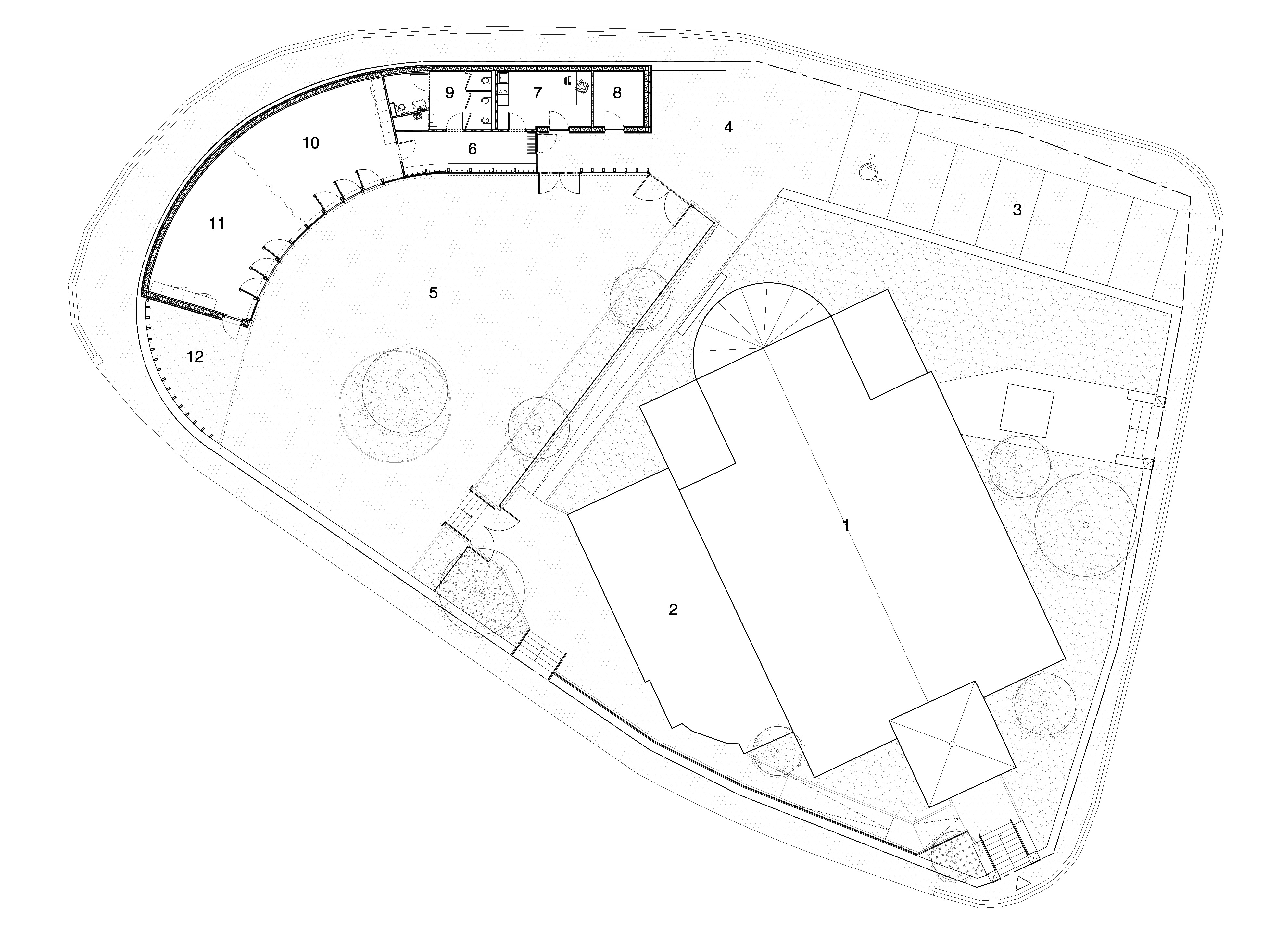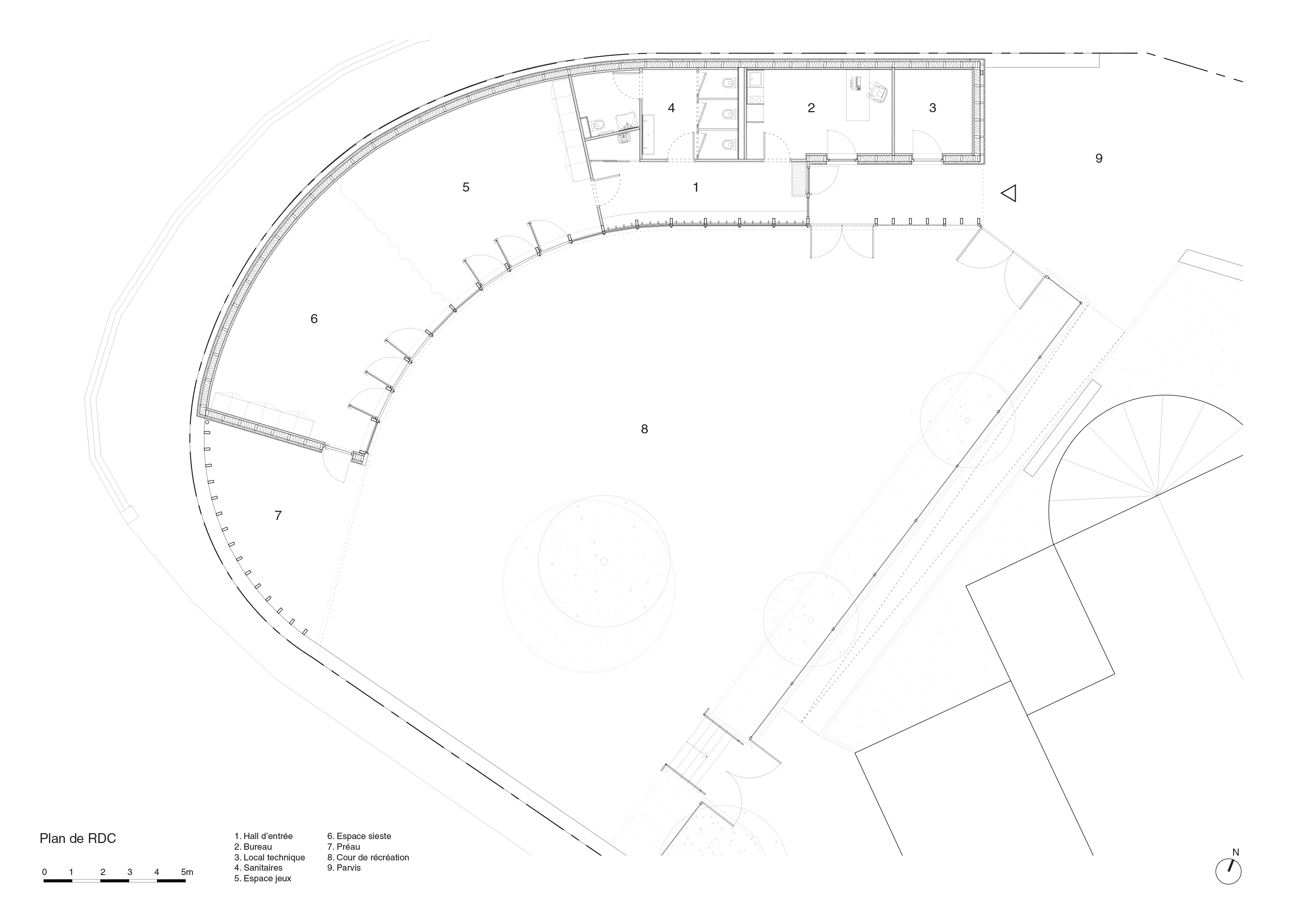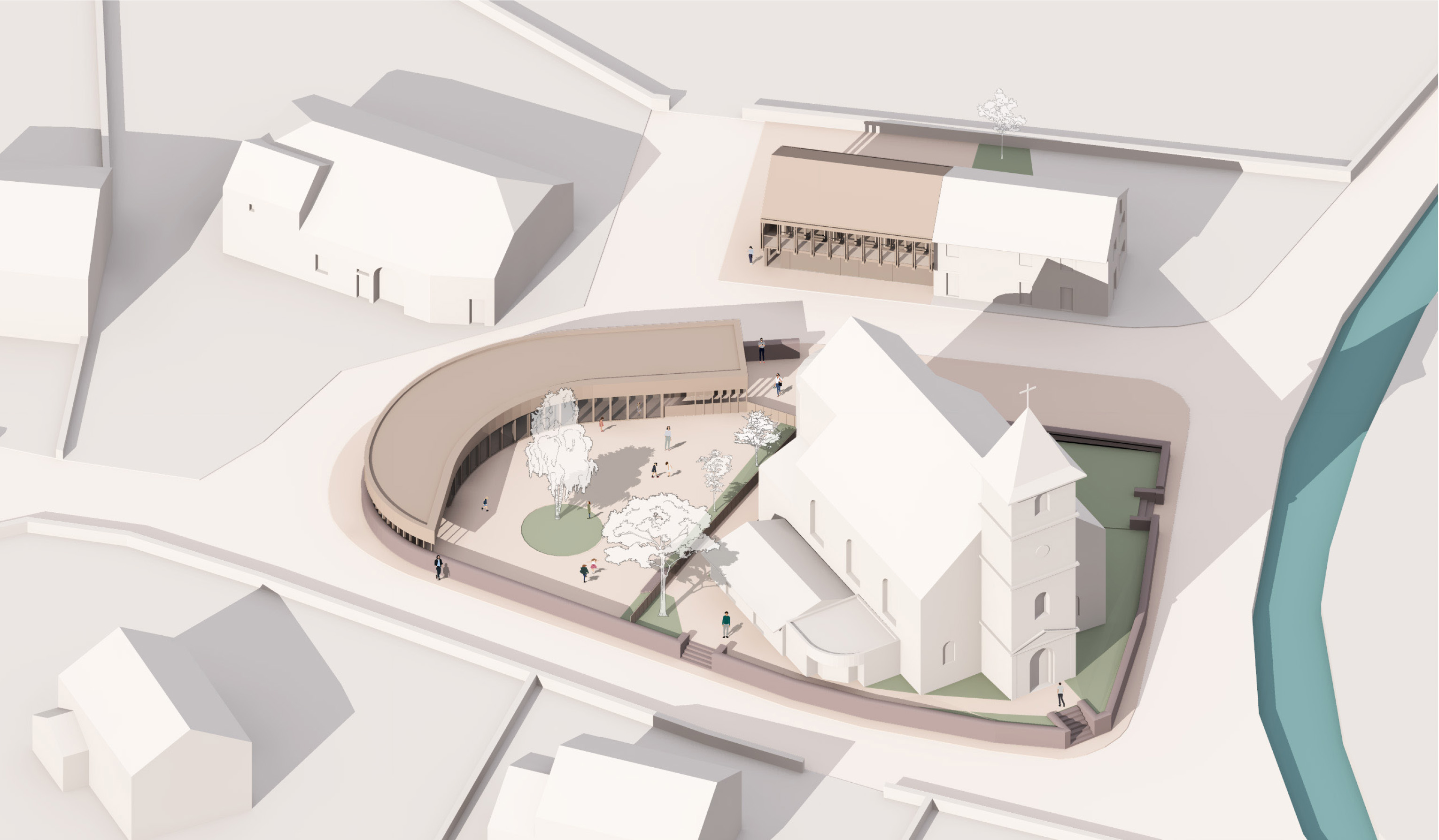 Descriptif technique : Le fil rouge est le muret en pierre. Nous l’avons prolongé pour ceinturer l’ensemble de l’îlot. Le bâtiment périscolaire vient se blottir dans le creux de l’anse pour libérer un grand vide central : la cour. Cette cour protégée, est essentielle pour faire le lien entre le périscolaire, la salle des fêtes et l’église. Cet ensemble pourra répondre à de multiples usages pour la collectivité. Une telle restructuration est déterminante pour les 238 habitants du village. Les principes de mutualisation et polyvalence sont essentiels pour favoriser les usages et valoriser au mieux l’investissement.