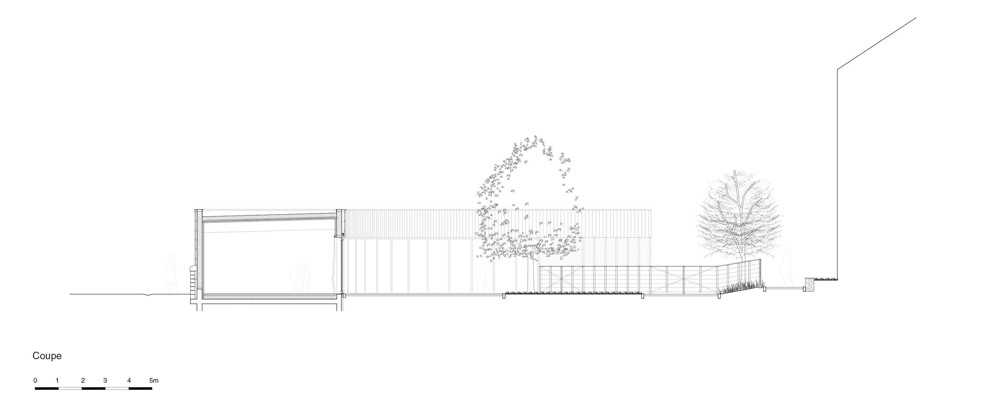 Approche environnementale : Travail pragmatique sur les ressources géosourcées : Les bardages et structures en bois de douglas proviennent de la scierie Mandray à Taintrux (88) et la scierie Strabach à La Bourgonce (88) Les couvertines du muret sont en grès rose de la carrière Sebeler à Bleurville (88) Les moellons du muret sont récupérés de diverses démolitions. Et au milieu, un beau tilleul planté avec la participation des enfants, le jour de la sainte Catherine (le jour où tout bois prend racine).