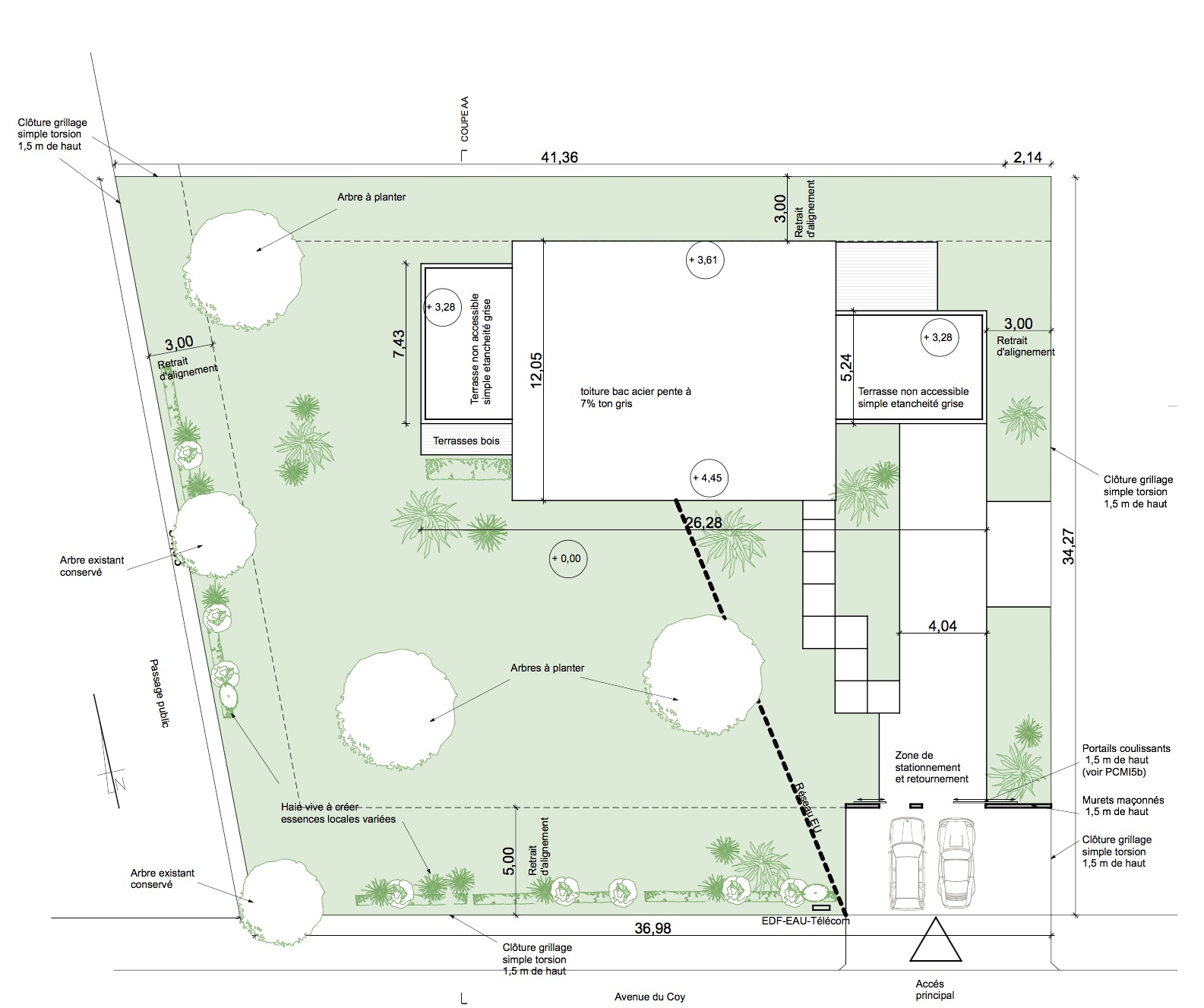 Projet de maison individuelle de plain pied avec couverture mixte toit terrasse et mono-pente bac acier. Structure ossature bois sur plancher béton, lamellé collé et plafond en caisson. Matériaux biosourcés et perspirants.