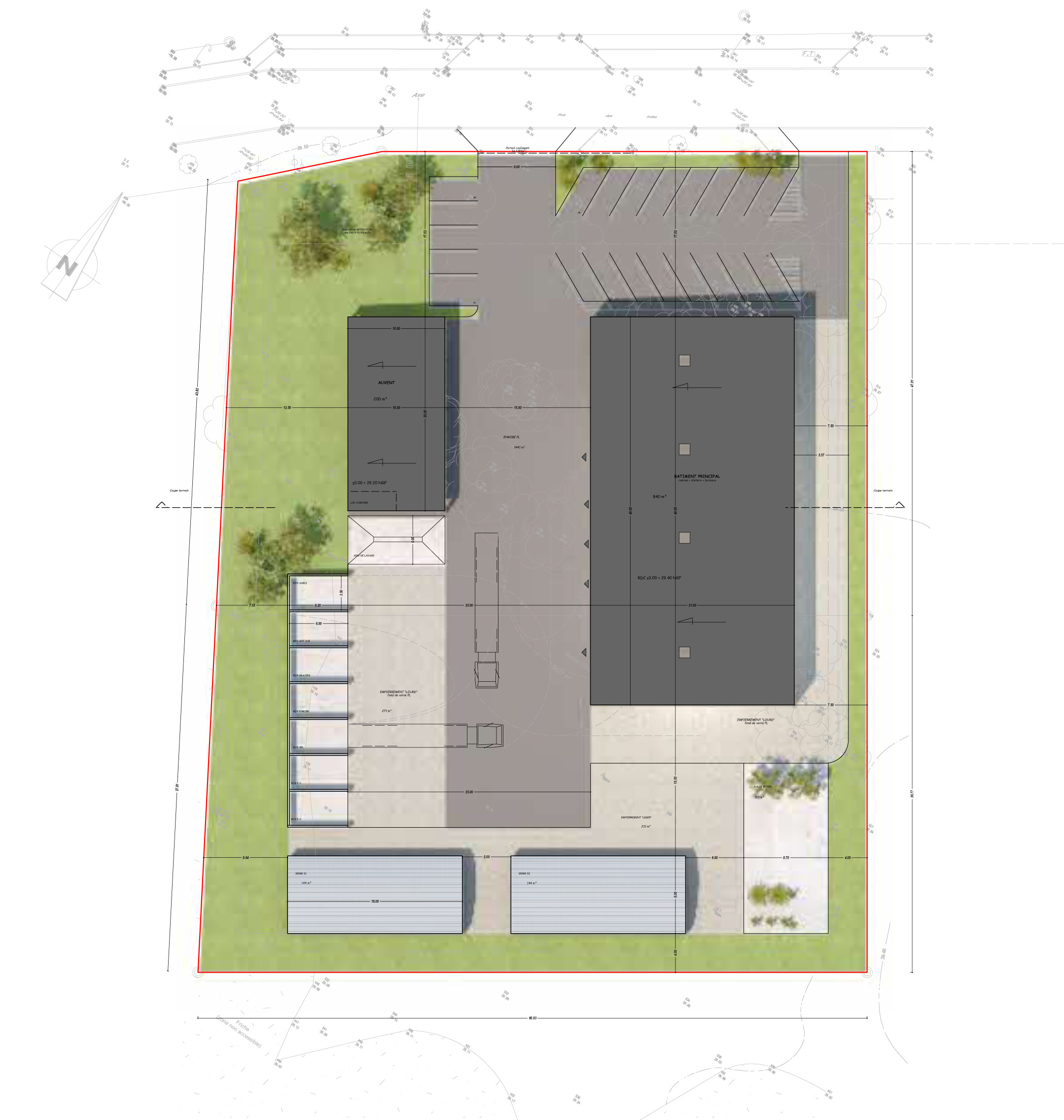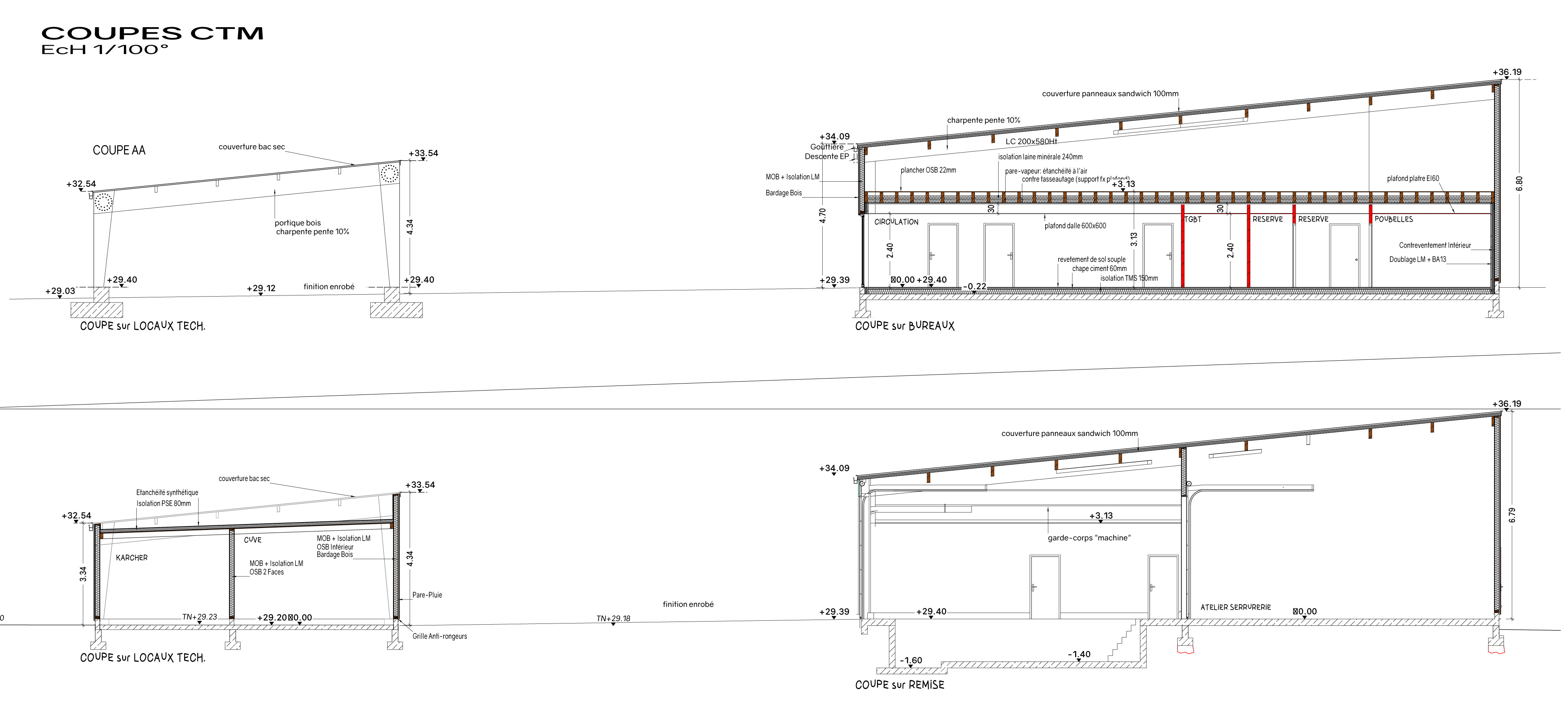 Approche environnementale : Ensemble du bâtiment réalisé en mur ossature bois et charpente traditionnelle bois; Chauffage via chaudière bois à granulés; Optimisation des apports de lumière naturelle via l'emploi de bardage translucide. Récupération des eaux pluviales pour l'aire de lavage des véhicules. Bassin de régulation pour les eaux pluviales