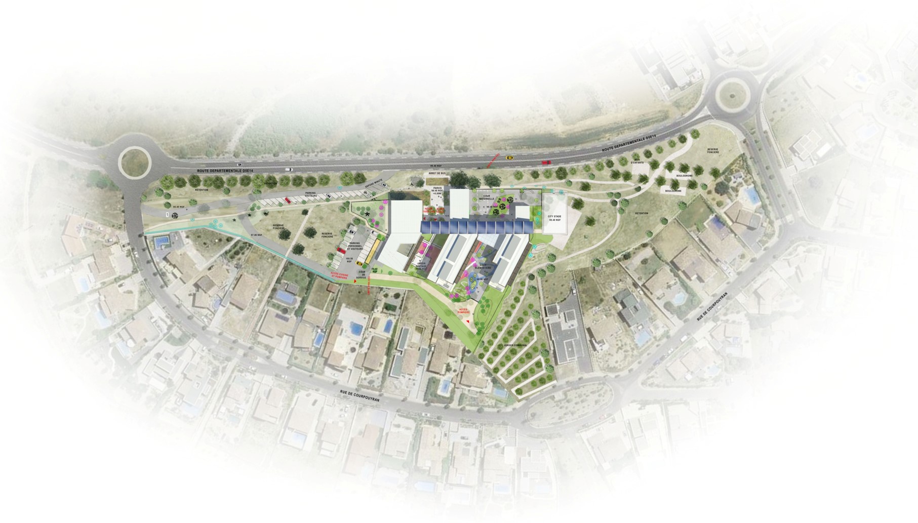 Approche environnementale : Une conception passive a été adoptée. Les bâtiments sont majoritairement en structure bois avec isolation biosourcée. Les façades principales sont orientées au Sud pour valoriser les apports solaires en hiver et faciliter les protections solaires en été. Les pièces principales sont aussi orientées au Sud pour bénéficier des vents dominants d’été, valorisés pour la ventilation naturelle via des ouvrants dédiés. L’écartement entre les volumes ont été définis pour limiter les ombres portées. La rue intérieure reliant les différentes ailes fait office d’écran acoustique.