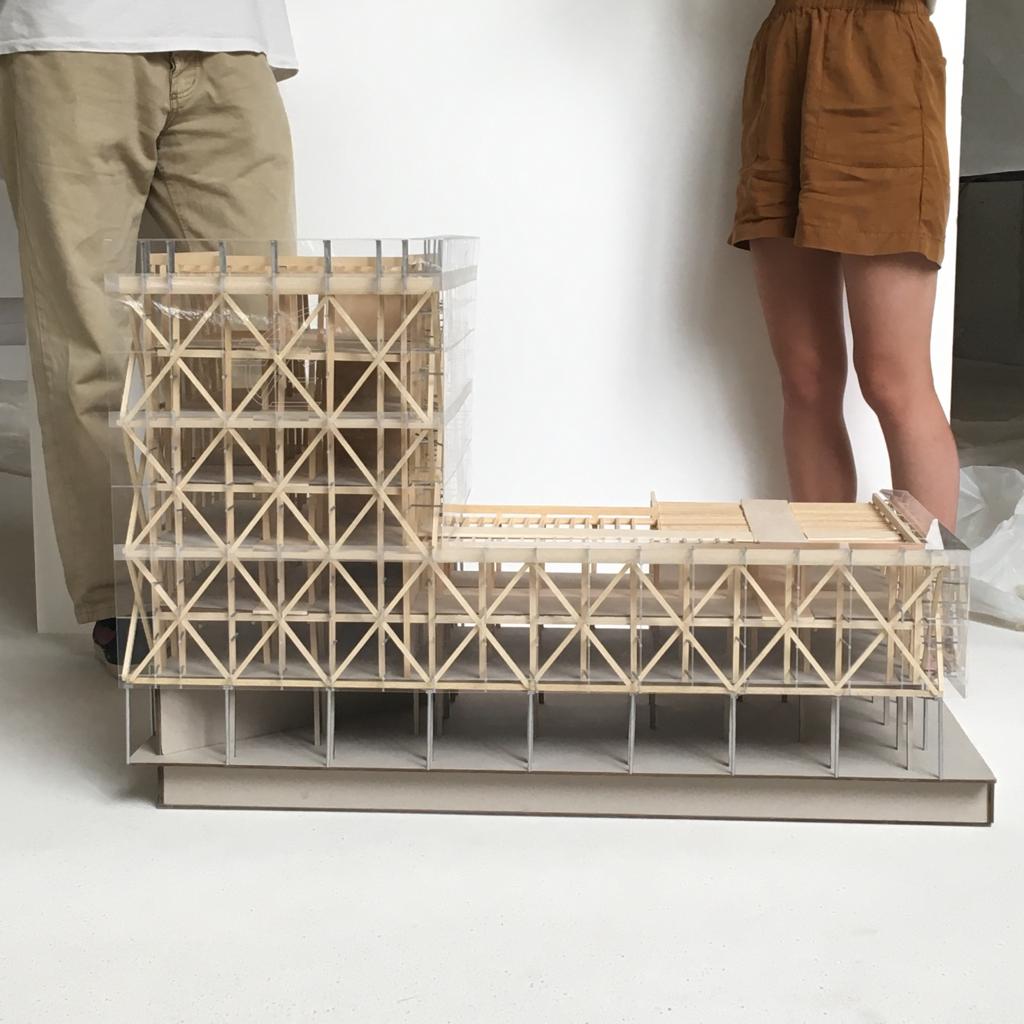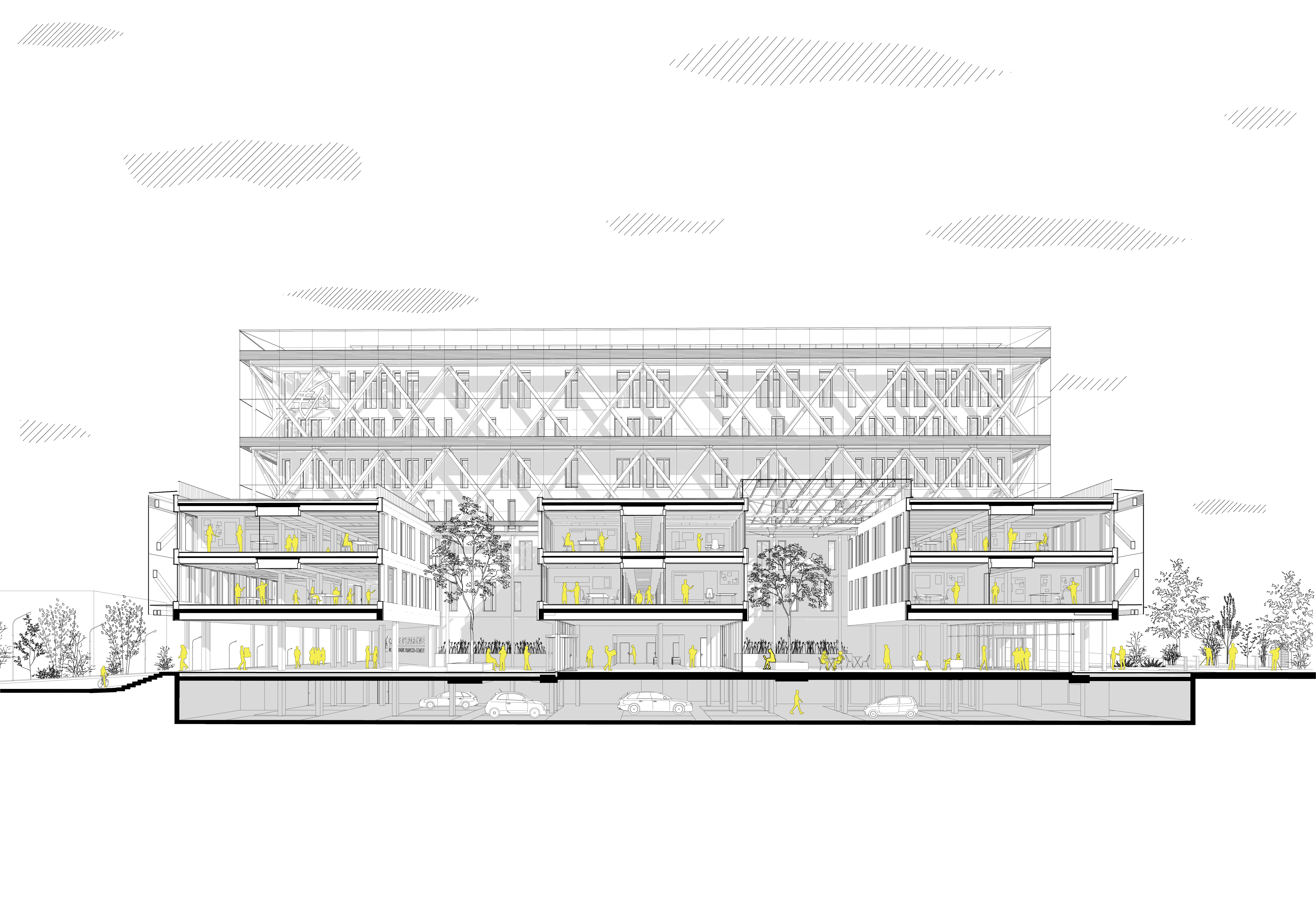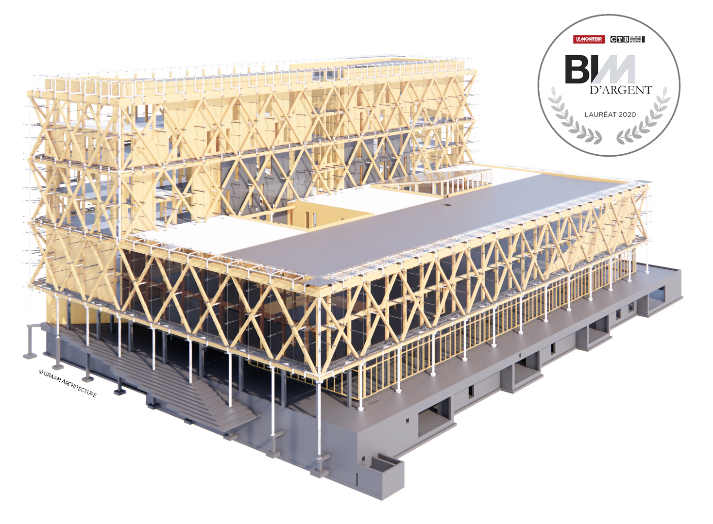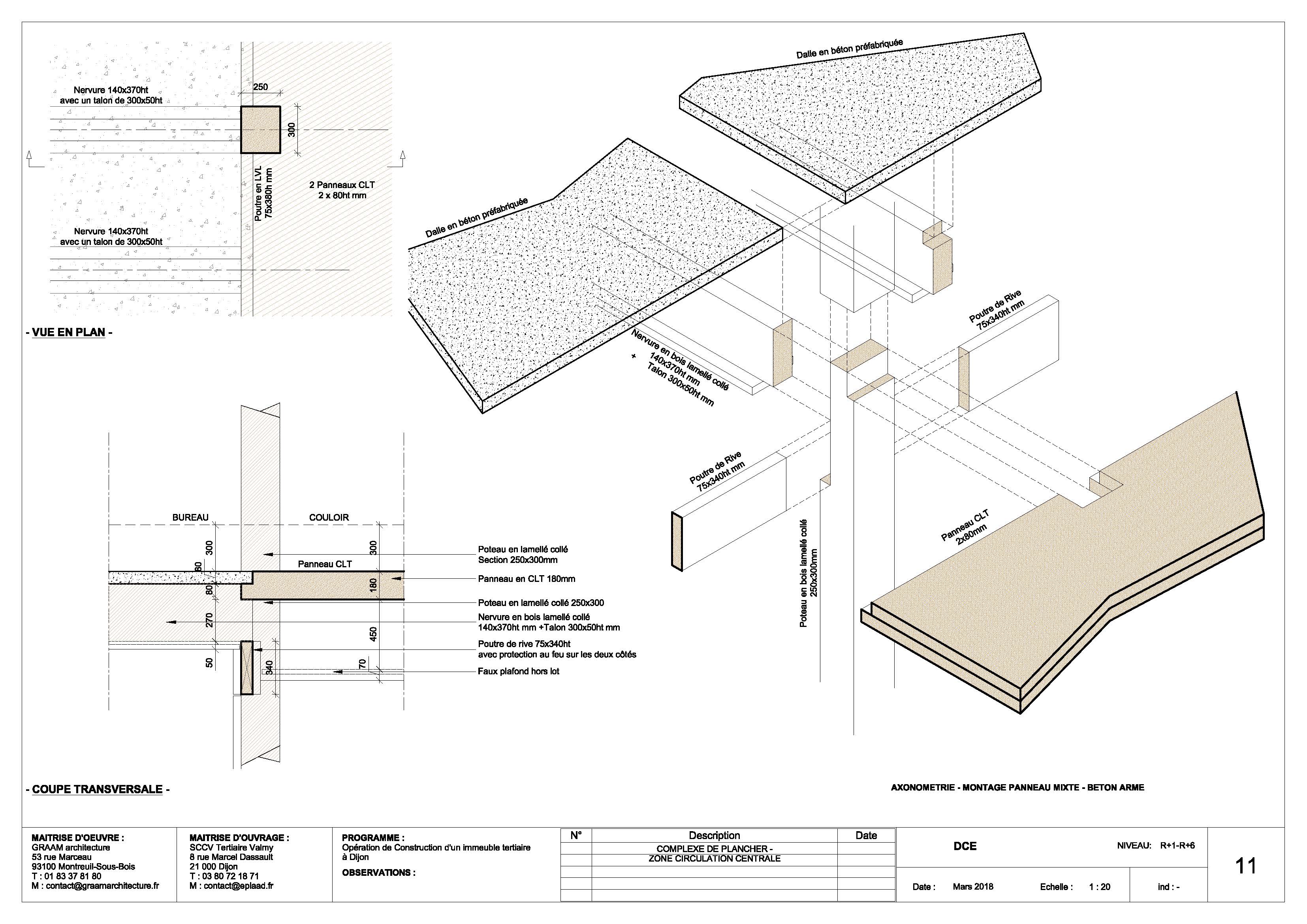 Descriptif technique : Le bâtiment est constitué d'un socle béton et de 6 niveaux en structure poteau poutre bois. La dissociation formelle des éléments de structure, selon leur rôle et leur comportement ("dynamique" pour l'exosquelette de contreventement, mais "statique" pour les poteaux-poutres des façades à remplissage MOB), a permis la réalisation d'une double peau ventilée bioclimatique. Réalisée en simple verre extra-clair, la paroi externe de celle-ci est suspendue aux poutres supérieures de l'exosquelette en bois. L'association du béton, du bois, de l'acier et du verre rend ce bâtiment unique.