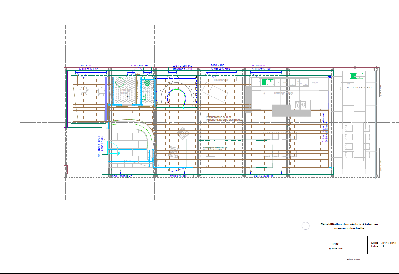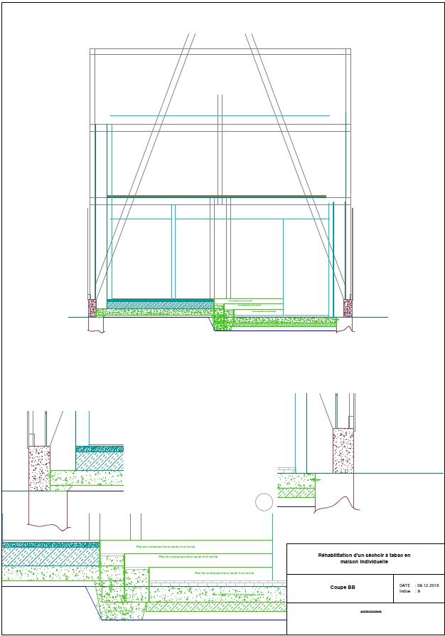 Descriptif technique : Spécificités Techniques : Murs extérieurs construits "à l'envers", méthode spécifiquement développée pour le chantier, pour ne pas démonter le bardage existant et dénaturer le moins possible le projet. Utilisation de la charpente existante. Menuiseries Triple Vitrage Alu au rez-de-chaussée, PVC à l'étage. Utilisation possible de l'eau du puits pour les WC. Free-cooling avec registres motorisés et sur-débit de ventilation. Gestion KNX Dali des luminaires. Ventilation mécanique Double Flux avec batteries électriques terminales. Insert avec prise d'air extérieure. ECS par ballon thermodynamique.