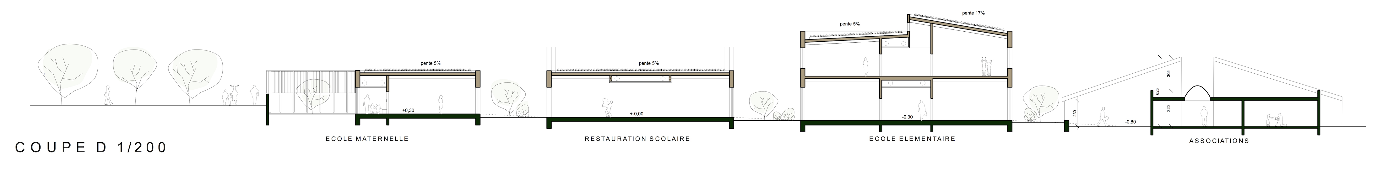 Le nouveau groupe scolaire, périscolaire et associatif est implanté en cœur de village, sur le terrain accueillant déjà la mairie et la bibliothèque. L’ancienne école maternelle est conservée pour devenir la maison des associations. Le bâtiment compact est organisé autour de patios séparant les différentes entités du programme et permettent un apport de lumière naturelle. L'usage généralisé de matériaux bruts (bois, béton) limite l’entretien et facilite l’appropriation par ses usagers du bâtiment. Son statut d'école de centre-bourg en fait un équipement indispensable à la commune.