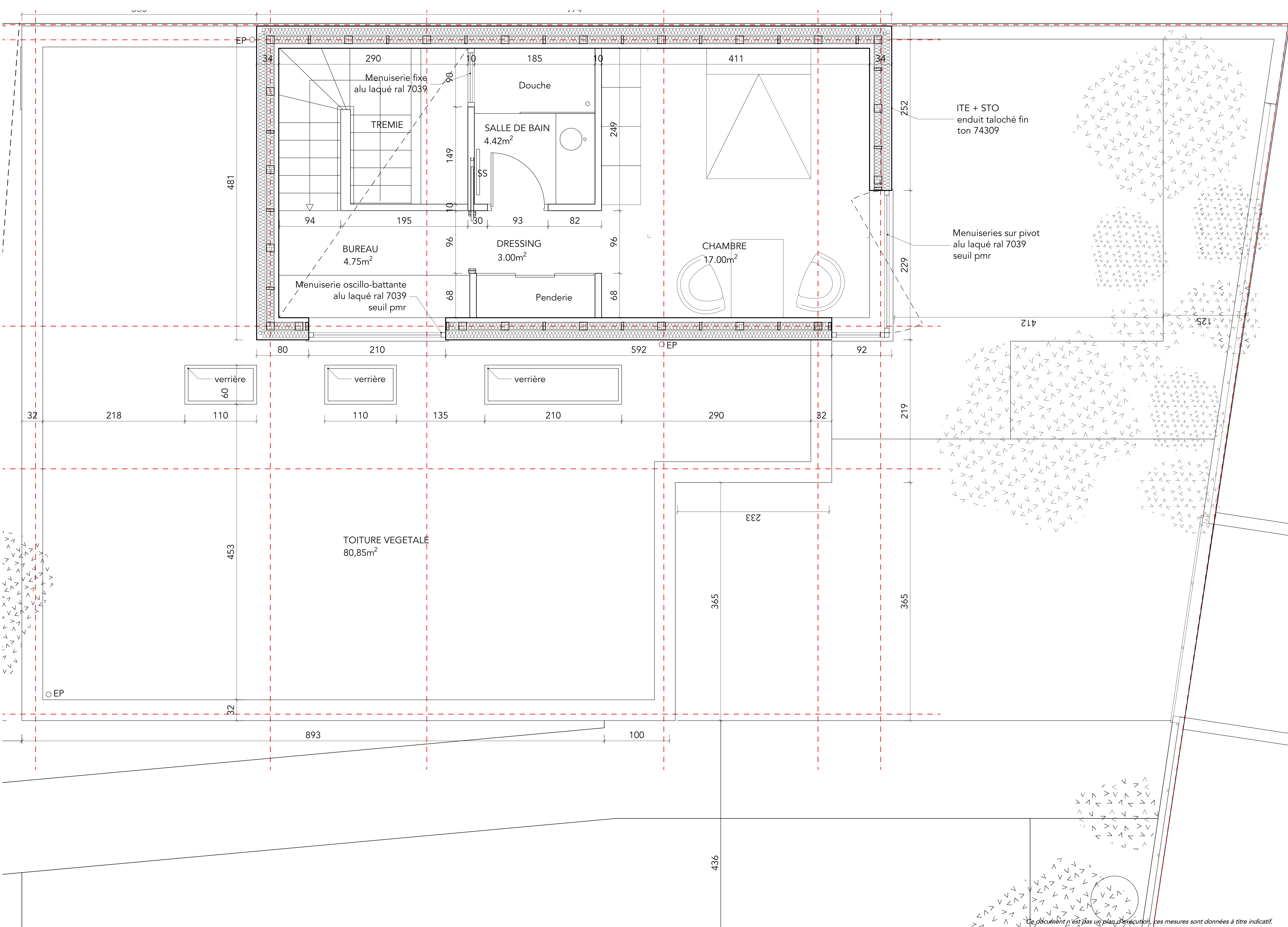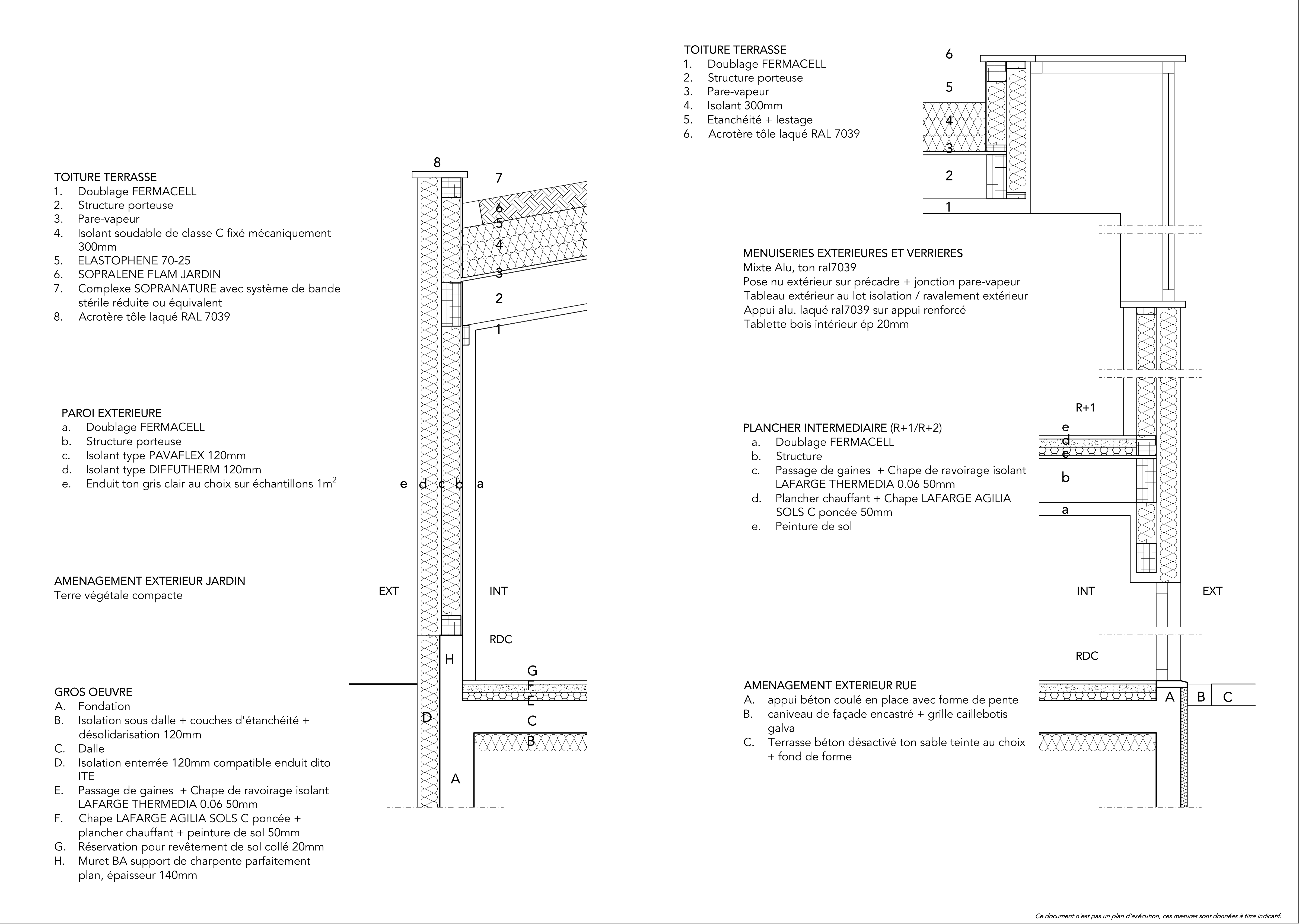 Descriptif technique : Structure verticale + Système poteau-poutre en bois LC Doublage intérieur en BA13 Membrane pare-vapeur Isolation laine de bois souple ITE + Enduit minéral Structure horizontale Toiture terrasse + végétalisation (15cm) Étanchéité Bicouche Plancher de l’étage en bois + parquet PEFC (Gestion forestière durable) FSC (Gestion forestière responsable) NF Portes résistant au feu en bois NF Vantaux de portes planes NF Contreplaqués (CTBX - CTBC) NF Parquets Marquage CE