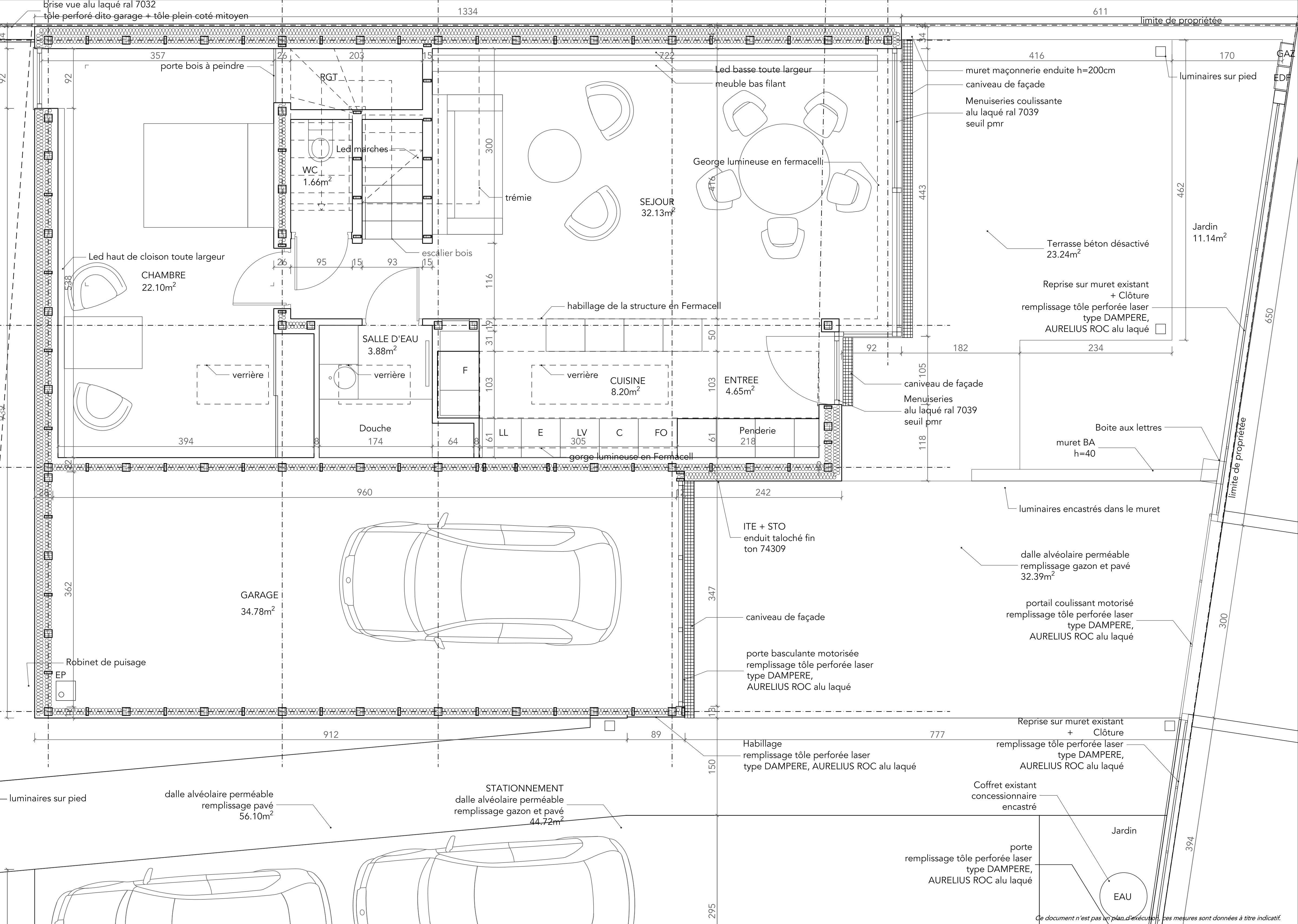 Approche environnementale : Une superstructure réalisée en quasi totalité avec des matériaux biosourcés et/ou recyclables. Une rétention des eaux pluviales avec 75% des surfaces de toiture végétalisées. Une densification urbaine contrôlée dans un quartier résidentiel du centre-ville de Saint-Gratien (95), le projet propose un habitat de densité intermédiaire avec deux logements sur la parcelle.