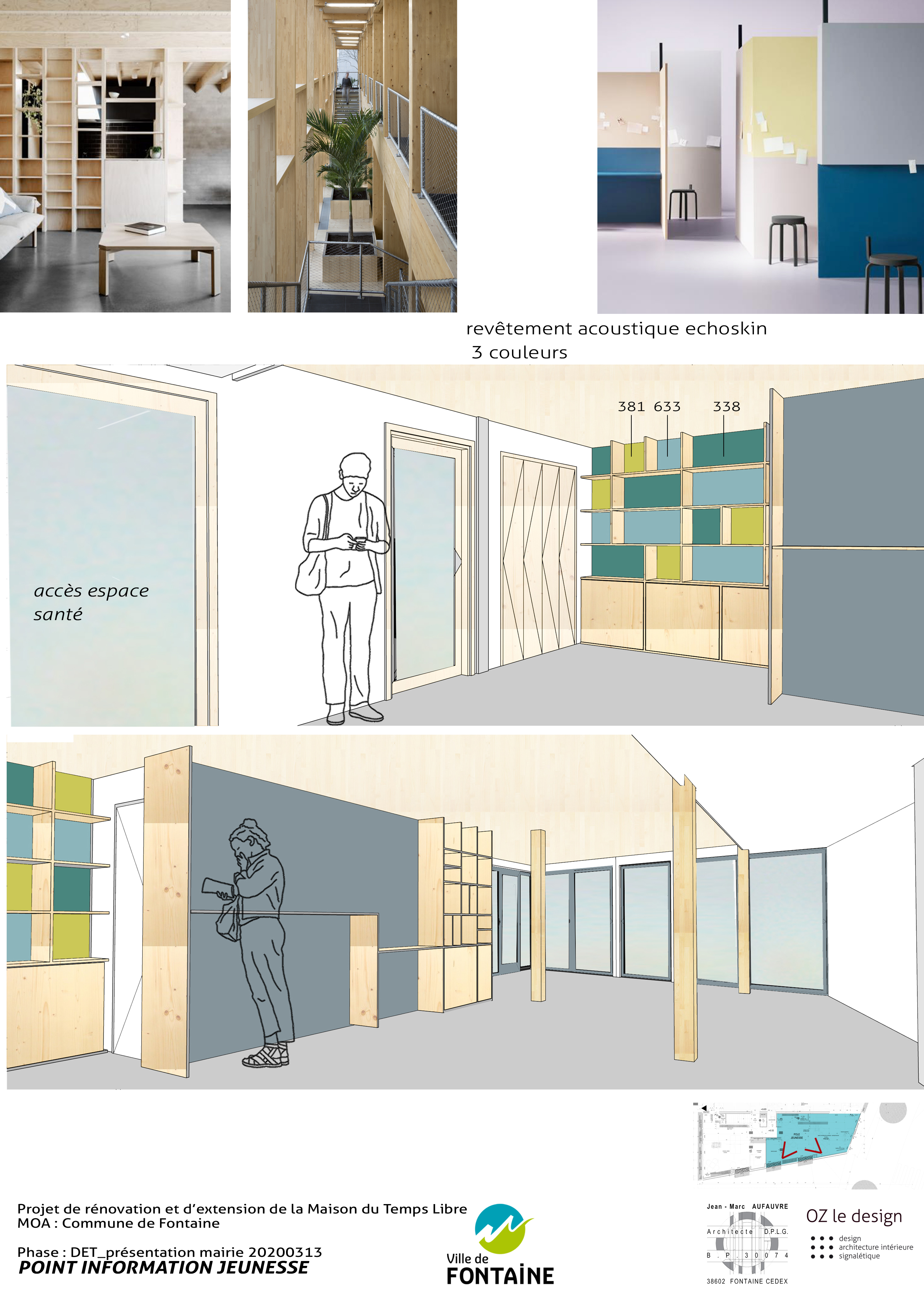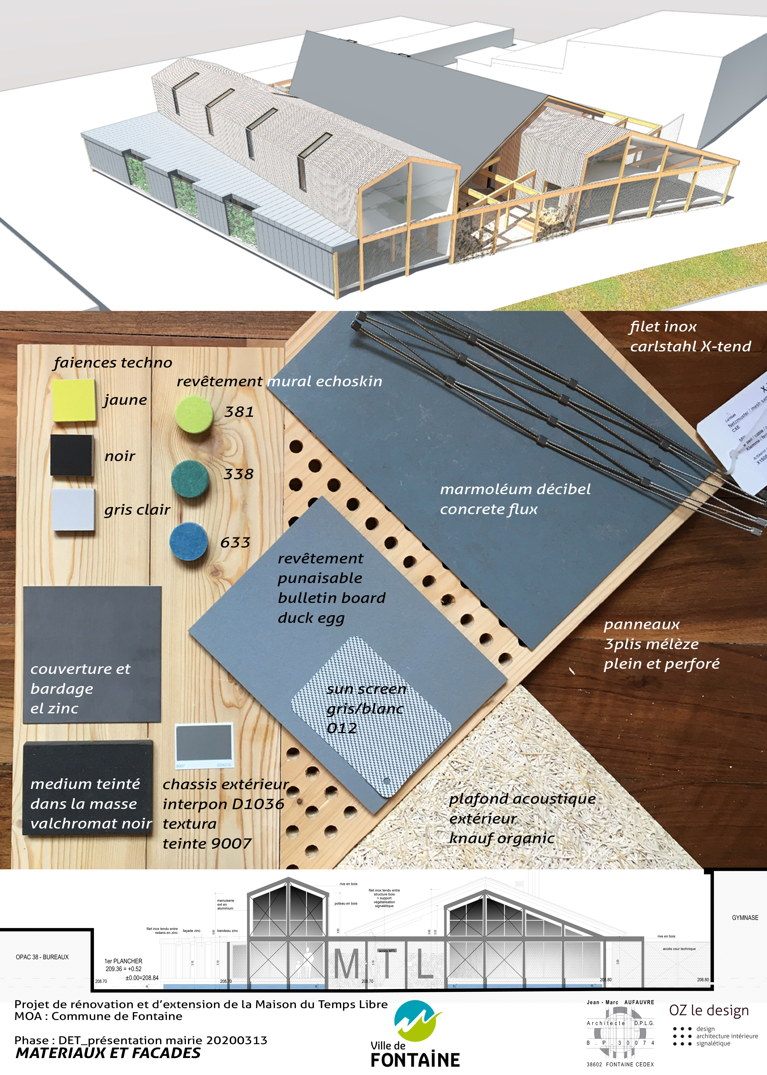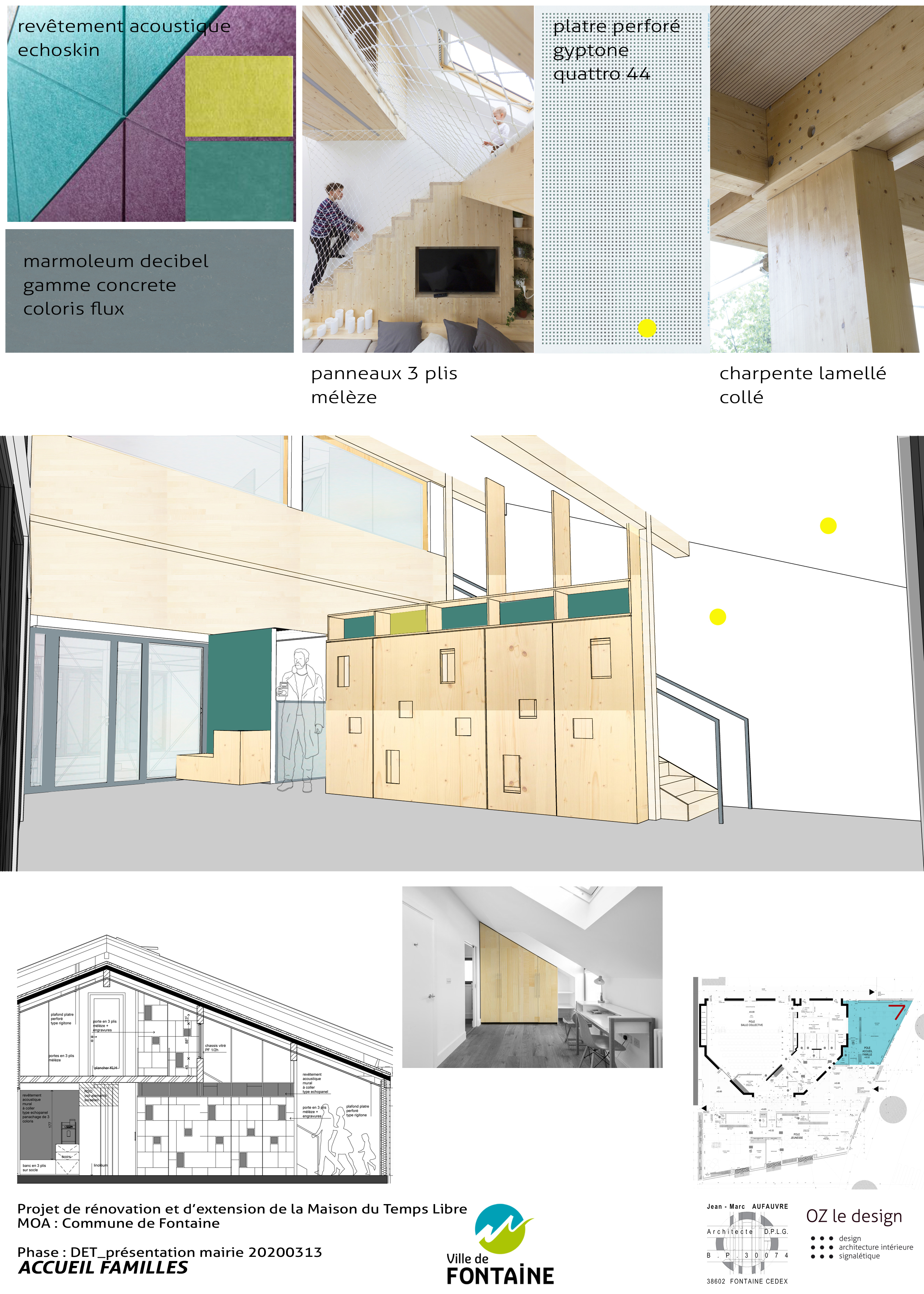 Descriptif technique de l'aménagement : L'aménagement intérieur est développé en continuité de l'architecture, comme une serre qui protège et qui permet la croissance à travers les activités proposées. La trame structurelle est mise en avant (charpente bois, plancher CLT visible). Le mobilier en 3 plis est intégré aux parois afin de libérer l'espace. Les casiers sont habillés de panneaux acoustiques colorés, les portes en mélèze sont ponctuées de découpes carrées. Dans la salle polyvalente, des placards en mélèze perforé font écho au dispositif acoustique situé en plafond, des cimaises en valchromat, des suspensions colorées.