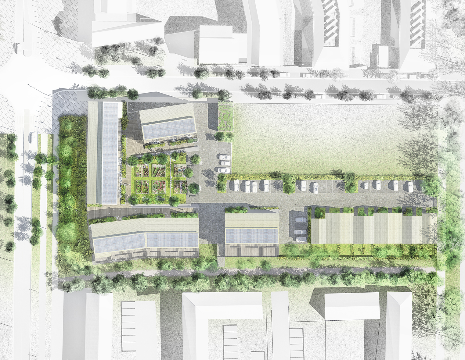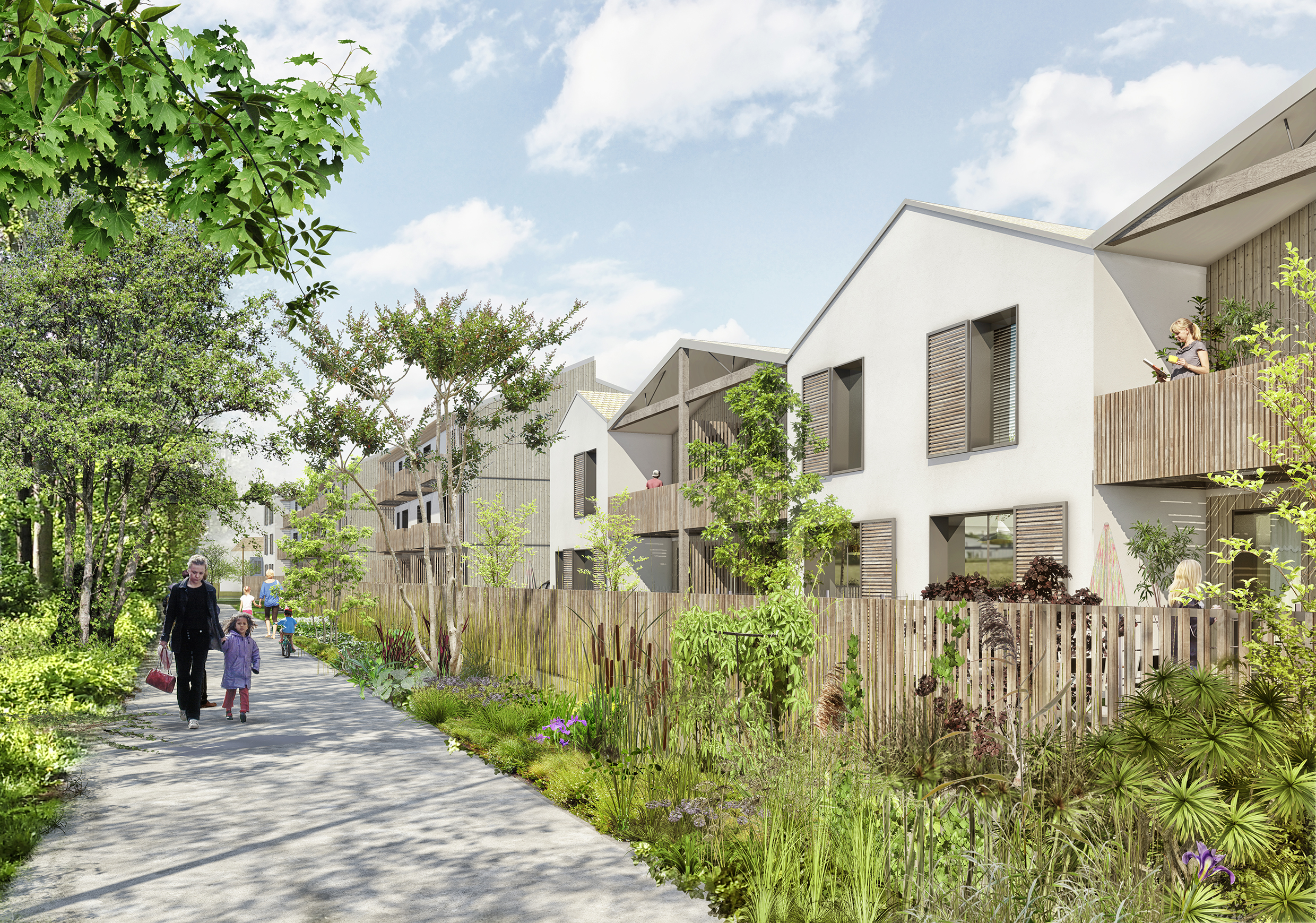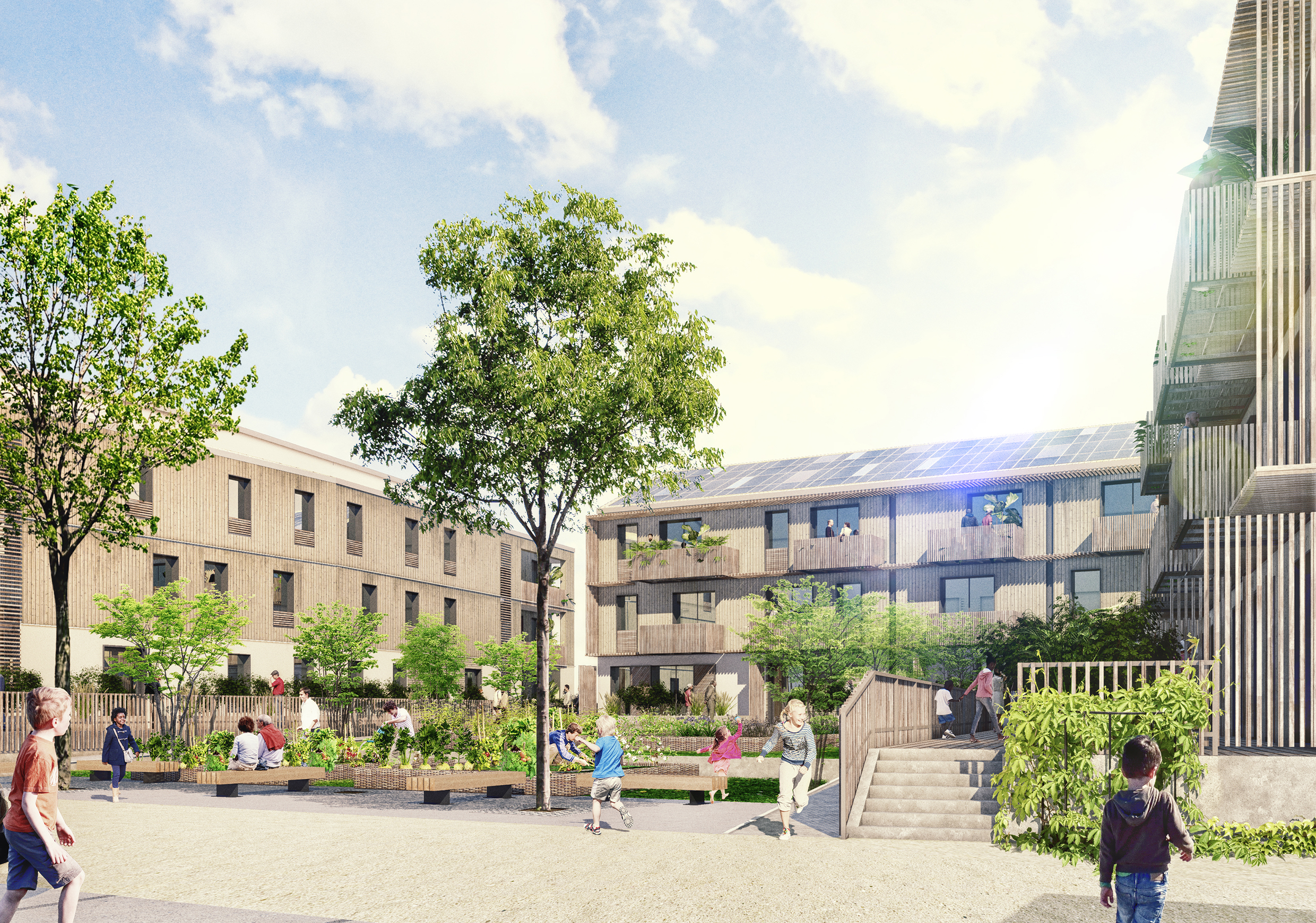 Approche environnementale : Projet E3C2 en gaz. Lauréat Green Solutions Awards 2021. Optimisation énergétique en conception passive avec triple vitrage et ventilation double flux - suppression des radiateurs en logement, panneaux photovoltaïques. Optimisation carbone IC construction avec construction ossature bois, escaliers et cage d'ascenseur en CLT, filière sèche et préfabrication, parking semi enterré et stabilisation des terres à la chaux, gestion des EP à la parcelle sur noues plantées, toitures COOL ROOF et limitation des ICU, matériaux biosourcés (bois d'oeuvre, fibre de bois, Métis), verger en coeur d'îlot.