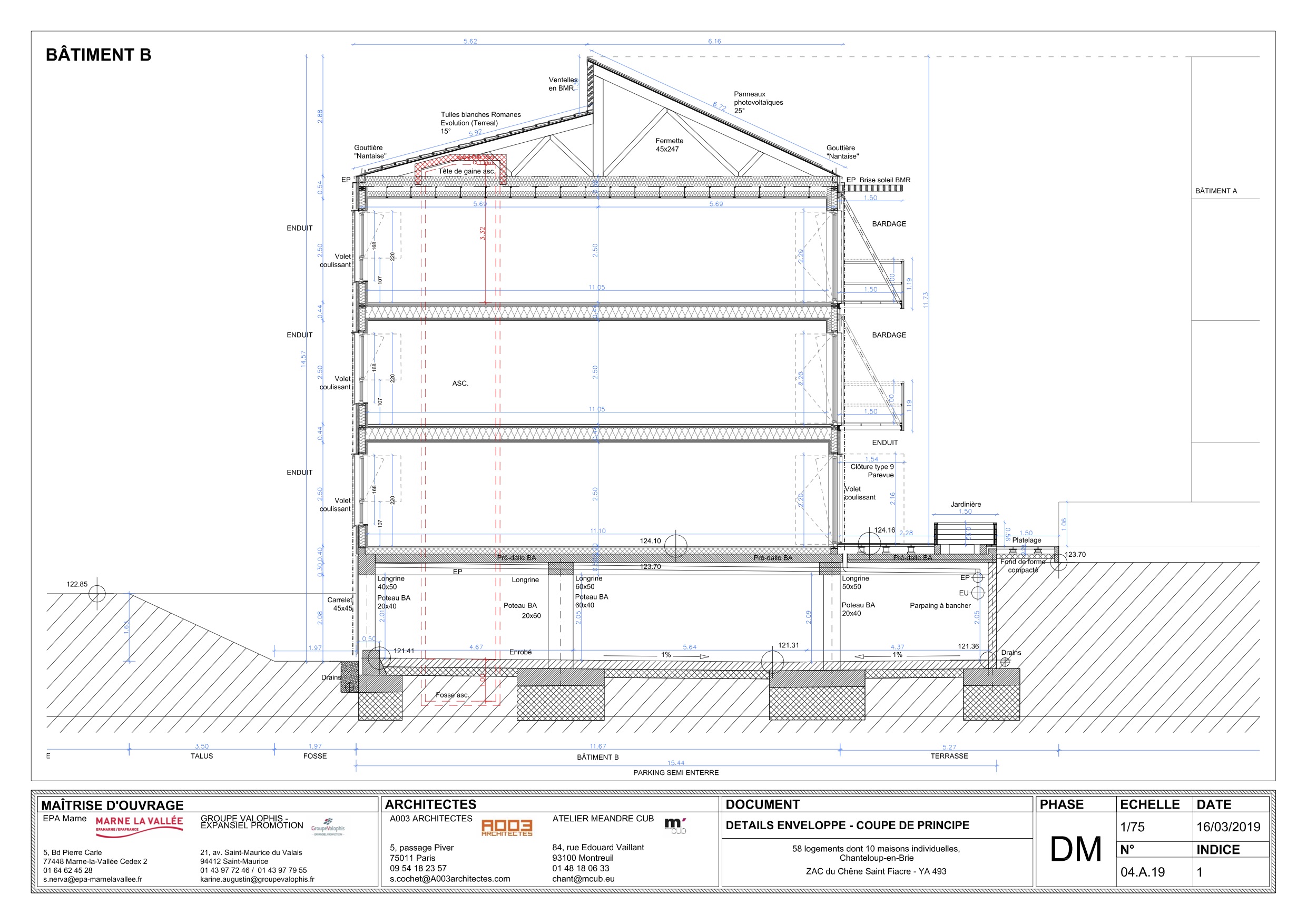 Descriptif technique : Accession sociale à la propriété. - Parcelle de 7845m2 - 10 individuels à R+1 accolés en T3/T4 - 48 collectifs sur 4 bâtiments à R+2 et 6 cage d'escalier/ascenseur en T2/T3/T4 - 110 places de stationnement dont 60 en semi-enterré. L'orientation du terrain permet d'installer les balcons et terrasses en prolongement des pièces de vie sur les façades exposées Sud, les chambres et les circulations au Nord. Les bâtiments de 12,00m de large comportent 8 logements par cage. 75% des logements sont traversants (0 mono-orientés Nord) et 100% des logements bénéficient d'un espace extérieur privatif. PEFC (Gestion forestière durable) FSC (Gestion forestière responsable) CTB A Traitement des bois en oeuvre CTB Panneaux de process CTB Structures Marquage CE NF Logement Démarche HQE
