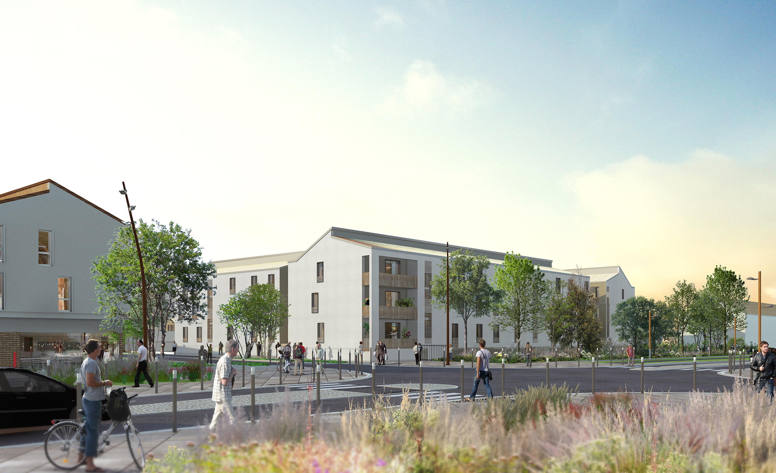 Le projet à R+2 reprend l'écriture architecturale développée sur les lots voisins - Simeio/Gabrion - en Entrée de bourg: façades enduites sur l'espace public, toitures à 2 pans coupés, loggias d'angle, volets bois, balcons et bardage bois en retour et implantations en lignes brisées, structurées autour d'un jardin commun en coeur d'îlot. Les compositions alternent corps d'enduit blanc et bardage prégrisaillé, tuiles blanches délignées par les rives zinguées et panneaux photovoltaiques, lames bois ventilées façon séchoirs briards, descentes Ep ouvertes sur l'écoulement vertical de l'eau.