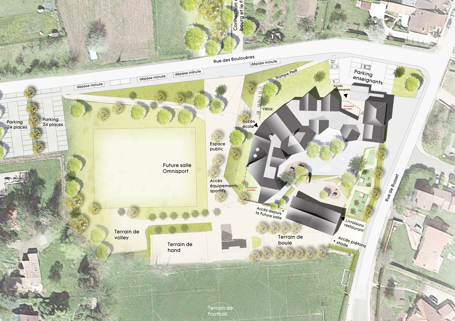 Approche environnementale : la lumière naturelle est mise à l'honneur tout en protégeant du soleil pour éviter les fortes chaleurs. Un système de ventilation double flux avec surventilation nocturne en été sera installé pour optimiser le confort des usagers. Pour les extensions, dont la cantine, l’utilisation de matériaux biosourcés a été privilégiée. Notre choix s’est donc naturellement porté sur une ossature bois, pertinente au regard du territoire, entouré de la montagne bourbonnaise, et sur une isolation en paille, elle aussi locale puisqu’elle est issue des déchets agricoles de la plaine de la Limagne
