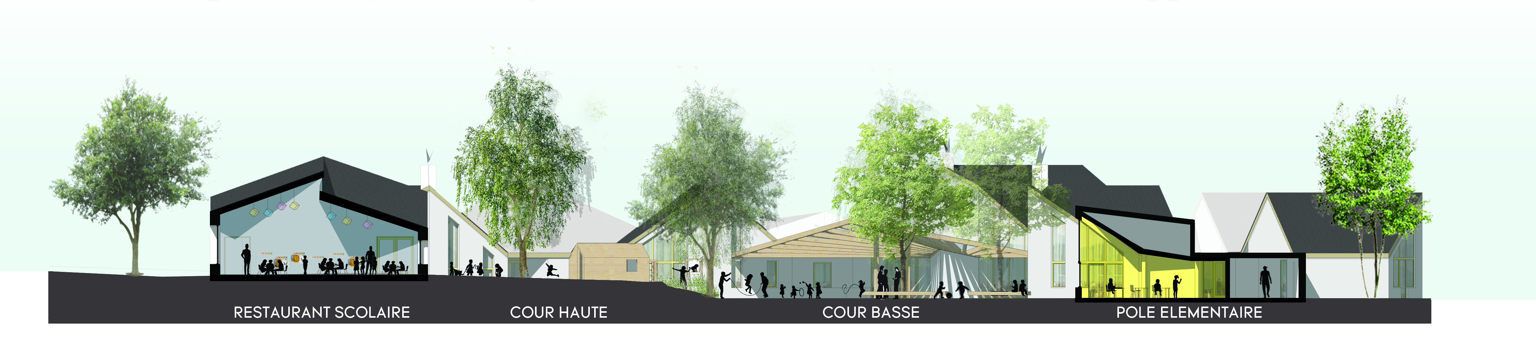 Notre projet d’extension s’inscrit dans la continuité de la forme actuelle du bâtiment en arc de cercle : la cantine s’implante dans le prolongement de la courbe, formant ainsi un «fer à cheval». Toutes les salles convergent sur la cour, celle-ci se place comme le cœur du projet. Les enfants peuvent facilement se repérer dans l’école grâce aux émergences formées par les toitures à 2 pans où se trouvent les salles spécifiques, en oppositions aux circulations qui présentent des toits plats.
