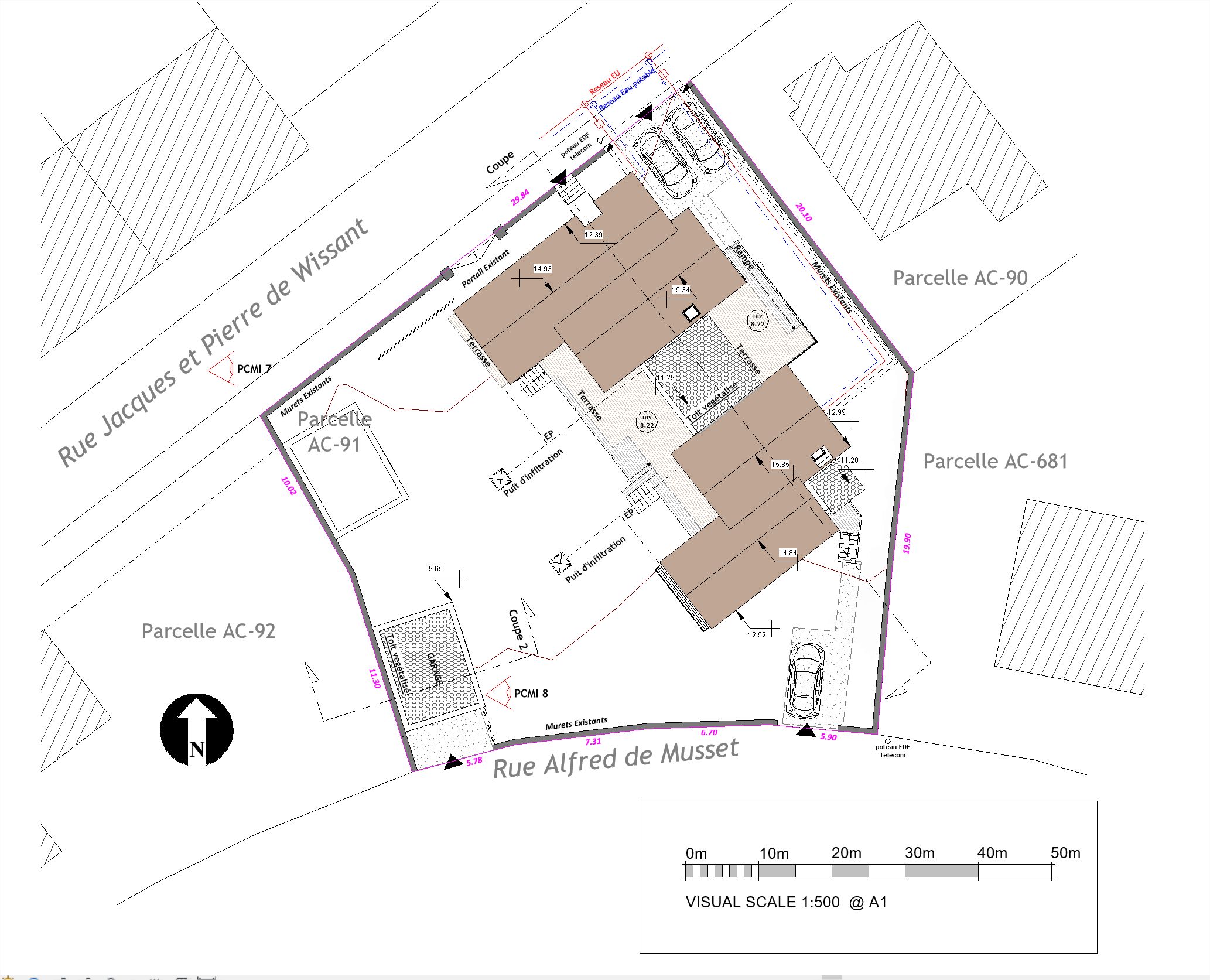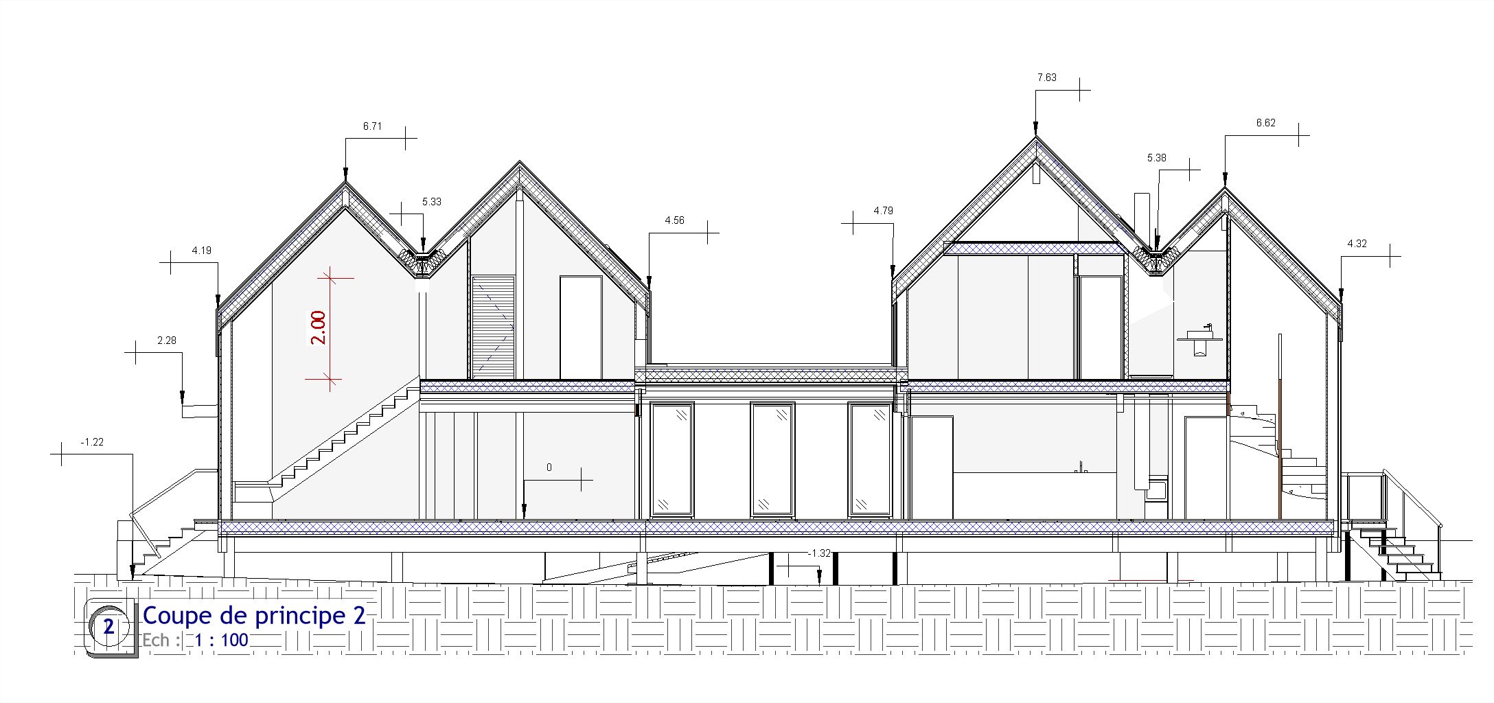 Création d'une habitation comportant 2 maisons familiales (Parents/enfants/petits enfants), relié par une salle commune. Le projet s'insére en 2em rang sur un front de mer, en zone sensible (PPRL), avec vague centenaire et en zone patrimoine ( GRAND SITE DE FRANCE LES DEUX-CAPS). L'implantation permet une protection au nord du projet et une ouverture vers le jardin, avec quelques vues mer. Ses fondations et sa base sur pilotis, permet de répondre à des conditions administratives fortes (Zone ABF - site des grands caps - Zone PPRI/PPRL)