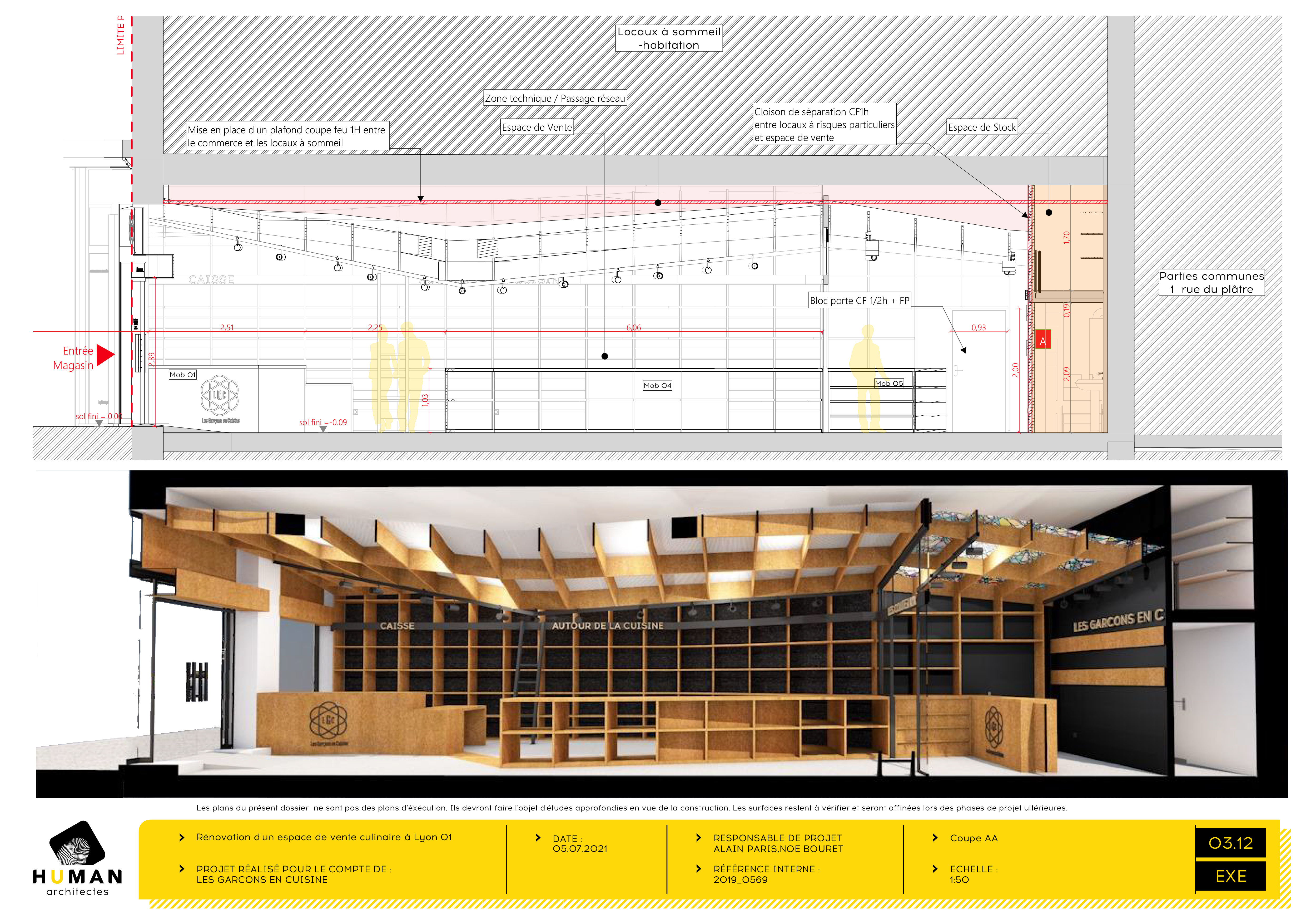 Descriptif technique de l'aménagement : Notre réponse s'appuie sur les principes suivants : >Créer un univers inspiré de la nature pour affirmer une identité connectée aux valeurs « des garçons en cuisine » >Générer une forme complexe par une trame simple (surfaces réglées) >Coloniser les creux et les interstices pour valoriser les produits par le foisonnement >S’appuyer sur des compétences locales en intégrant dès l’avant-projet l’entreprise Créabois dans le processus de conception >S’appuyer sur les outils de découpe numériques intimement connectés à nos outils de dessin pour optimiser les chutes et les coûts de production