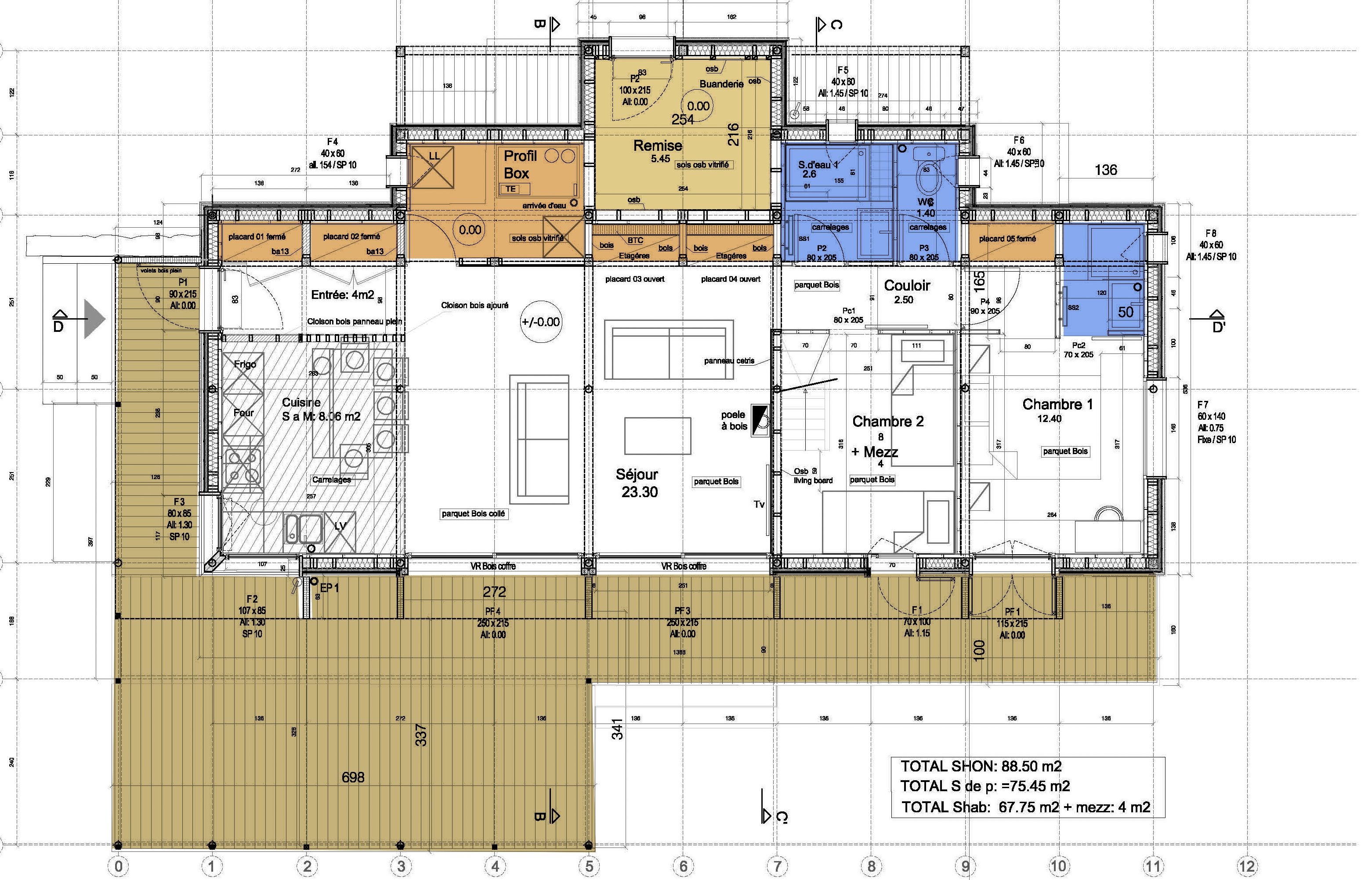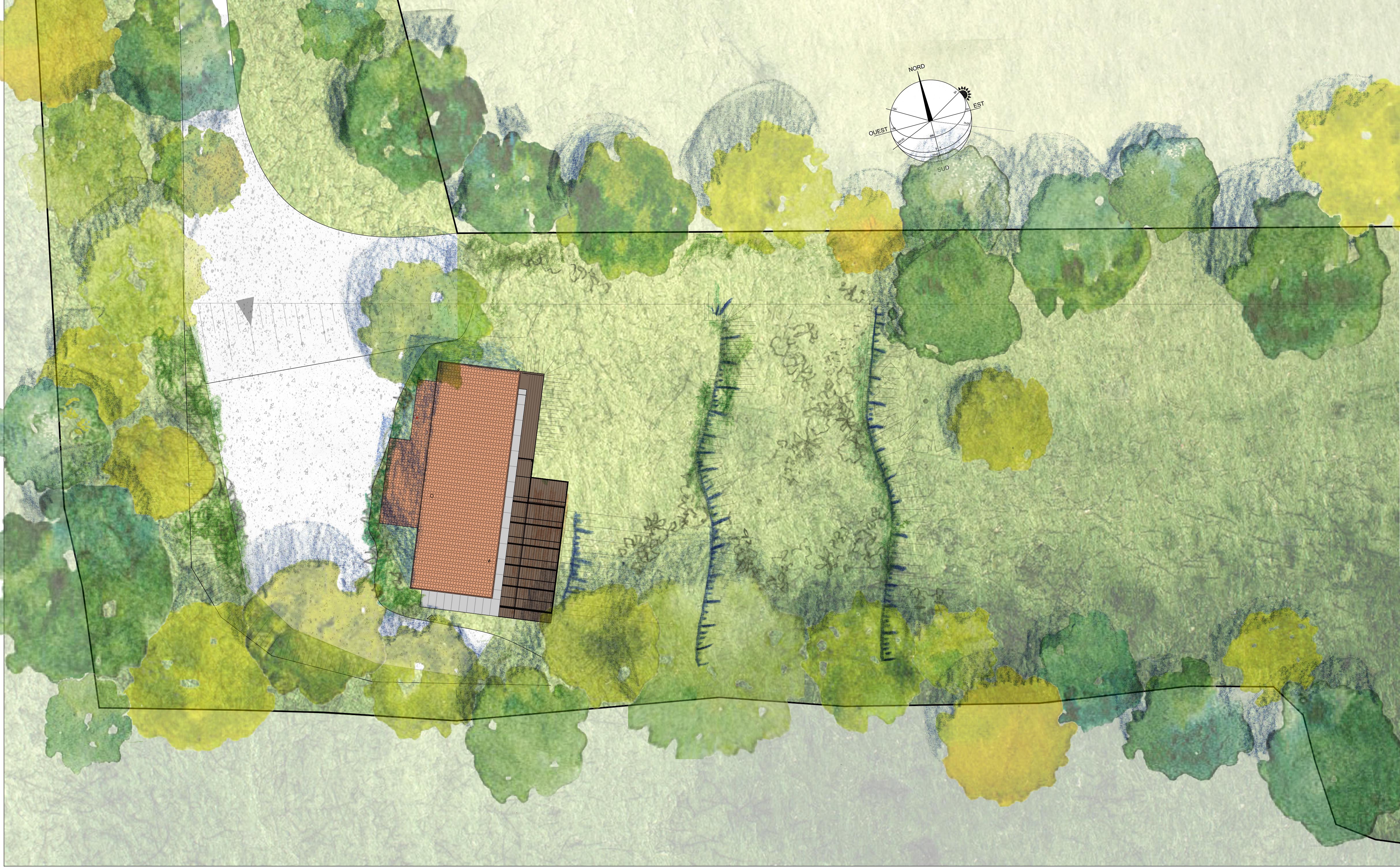 Approche environnementale : Ce projet est construit selon les préceptes de l'architecture bioclimatique pour bénéficier au maximum des apports solaires passifs et s'inscrit dans la pente naturelle du site en s'ouvrant sur une vue dégagée sur la vallée. Il utilise un maximum de matériaux biosourcés tant dans sa structure en ossature bois que dans ses isolants (laine de bois) ou ses matériaux de finition (parquet, parements bois, brique de terre crue..)