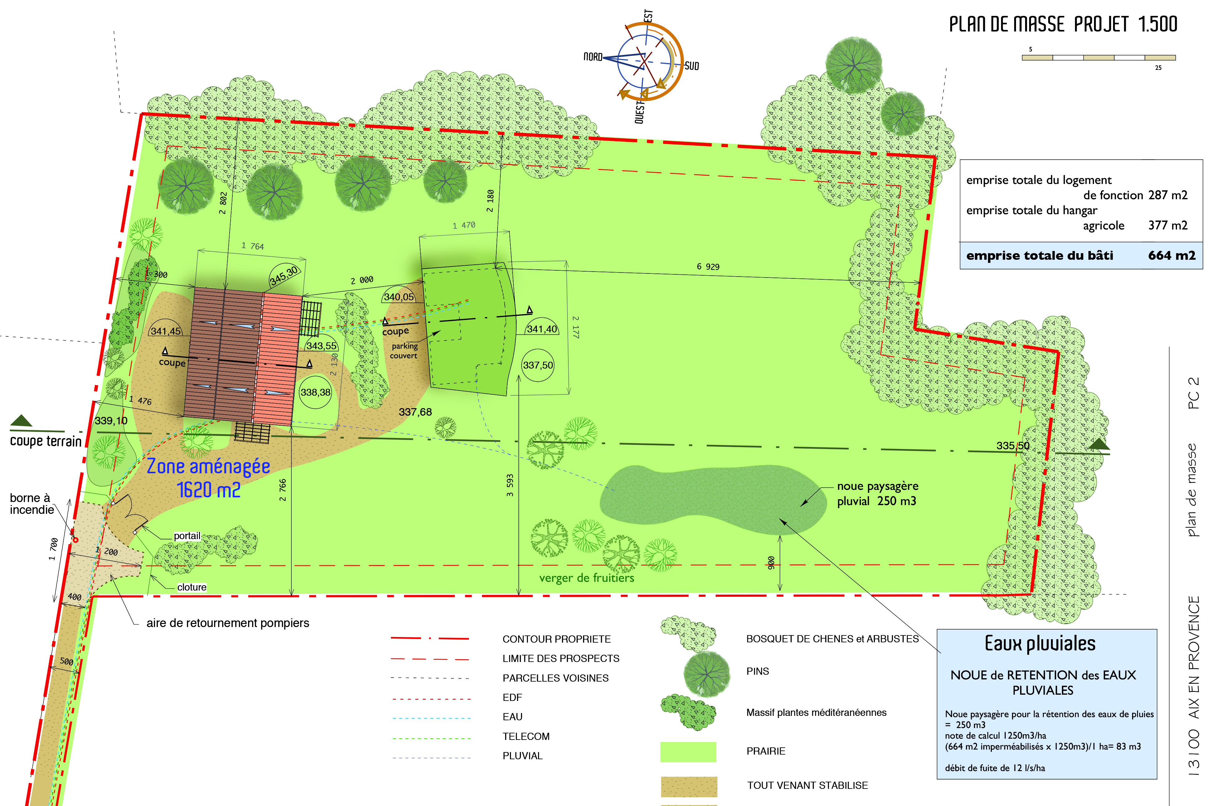 Approche environnementale : Un grand pan de toiture végétalisé diminue la présence du bâtiment sur ce terrain plat et permet de dévier le Mistral, compléter par les plantations à venir. Projet en éco-construction avec : Ossature bois noyée dans 300 mm de béton de chanvre, Menuiseries extérieures en bois massif contre collé, Mur intérieur en brique de terre crue, derrière le poêle à granulés de bois.
