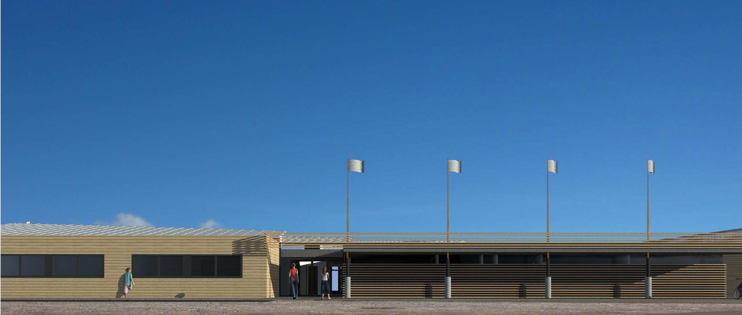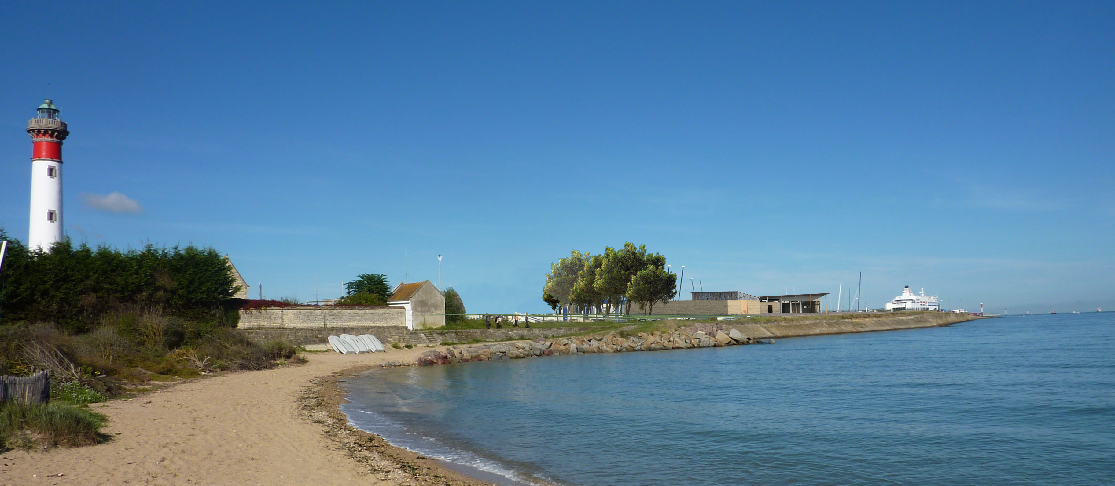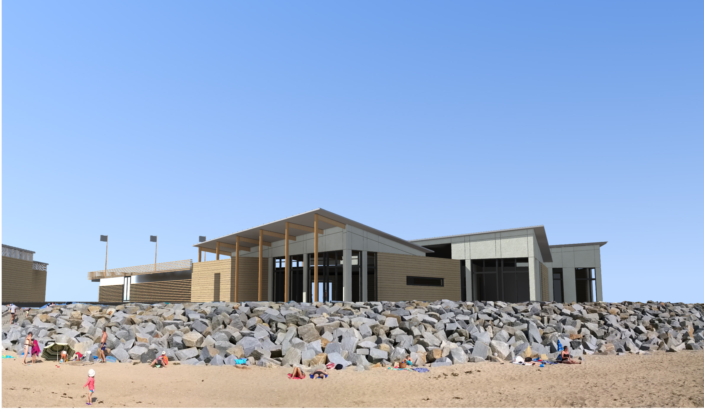 Le bâtiment est tout à RDC et son compose en 2 volumes formant ainsi une cour technique pour la circulation des bateaux en toute sécurité. Les façades du volume bas horizontal seront bardées en lames ou en tasseaux horizontaux en bois traité incolore qui grisera naturellement. La casquette de l’auvent sera marquée par les mêmes tasseaux bois horizontaux. Les façades des 3 volumes hauts seront habillées d’un bardage en grandes plaques de fibres-ciment teintées gris clair. Les menuiseries seront en alu laqué noir. La structure de l’avant-toit côté mer abritent des surchauffent estivales la salle de convivialité, elle est en bois lamellé-collé. La toiture des volumes hauts et édicules sont en zinc pré-patiné gris, Au niveau de l’entrée, la casquette viendra s’interrompre pour laisser place à une couverture en polycarbonate, créant ainsi un appel de lumière au droit de la porte.
