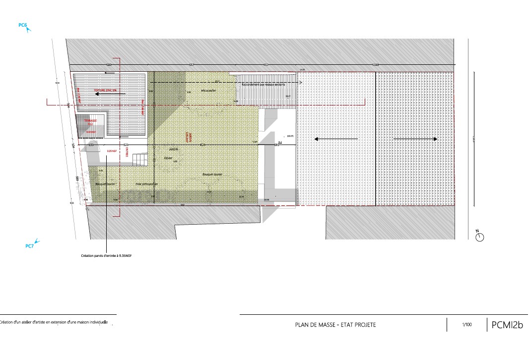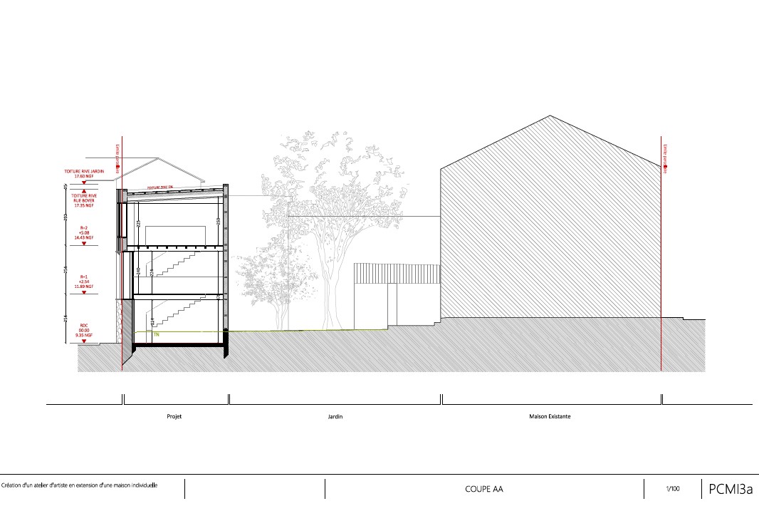Le projet consiste en la création d'un atelier d'artiste en fond de jardin d'une maison de ville caractéristique des faubourgs de Montpellier. Le projet se développe sur 3 niveaux et s'insère en alignement avec les proportions du bâti existant mitoyen. Le rdc se dissimule derrière le mur de clôture existant , l'étage présente une façade vitrée laissant entrée la lumière dans le rdc et l'étage en coursive de l'atelier, le dernier niveau se compose d'un pièce de réunion. Le rdc est complété par espace terrasse entouré de la végétation existante et conservée du jardin.