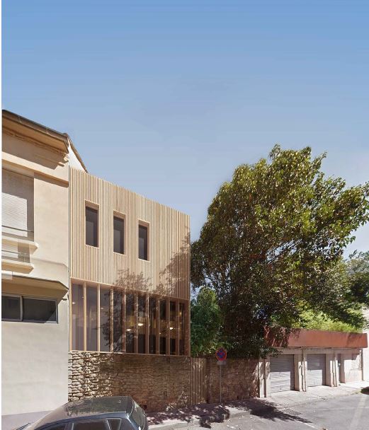 Approche environnementale : Dans le contexte urbain mais boisé du terrain, le choix de l'ossature bois a permis la préfabrication des éléments de murs ossature bois et planchers afin de limiter l'impact sur chantier et les nuisances pour les riverains. Le bois qui habille les façades est un douglas issu d'une scierie locale du gard.