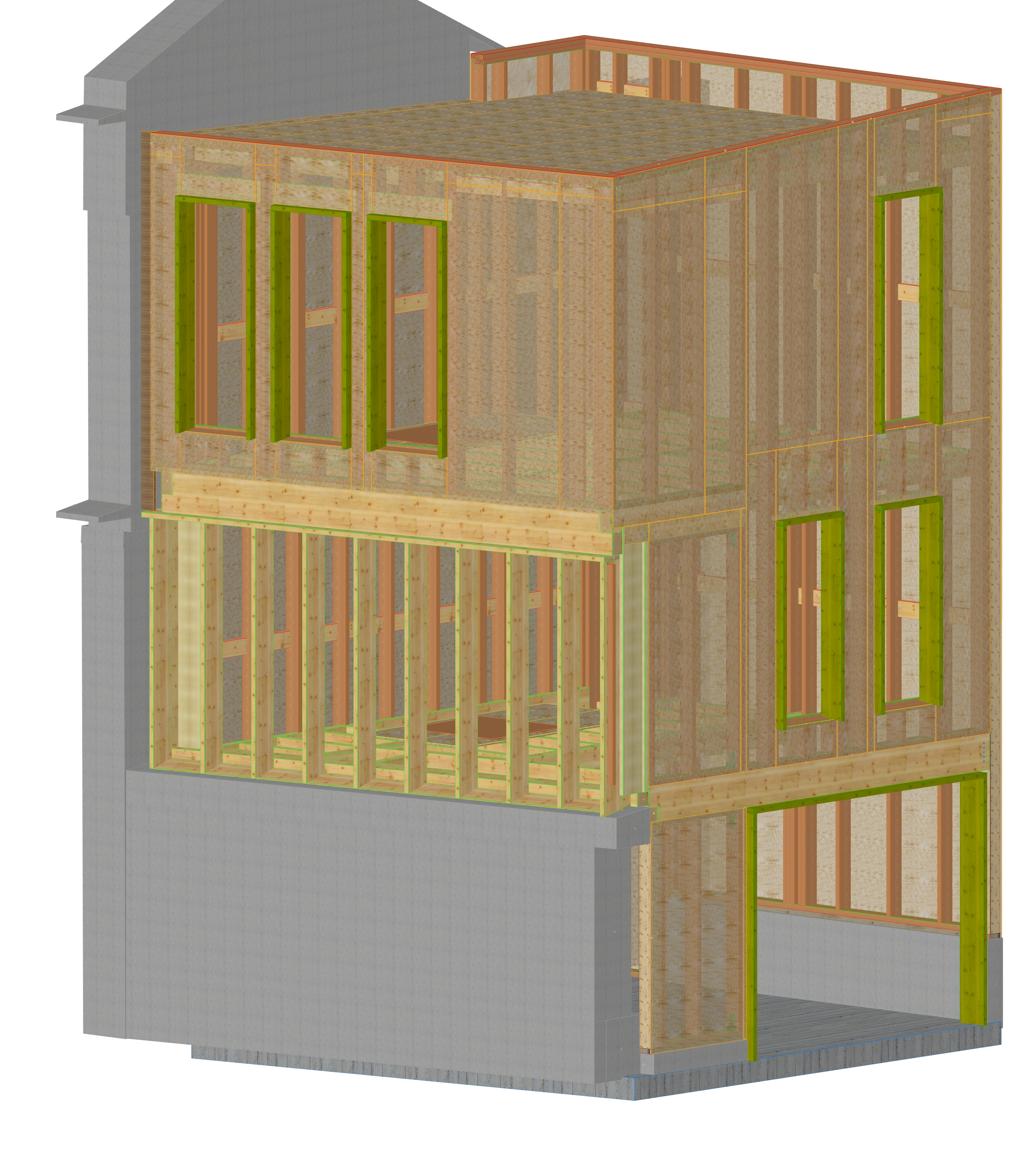 Descriptif technique : Les murs ossature bois sont composés de montants en 45*145 contreventés par un OSB 12 mm. Le bardage est en douglas autoclave marron, posé verticalement. Les planchers intermédiaires sont composés de poutres porteuses lamelle collé permettant de créer les trémies d'escalier et de la double hauteur. Les solives sont en contre collé épicéa et resteront visible . Les solives de la toiture sont en bois massif. L'étanchéité de la toiture est réalisé en membrane synthétique . PEFC (Gestion forestière durable)