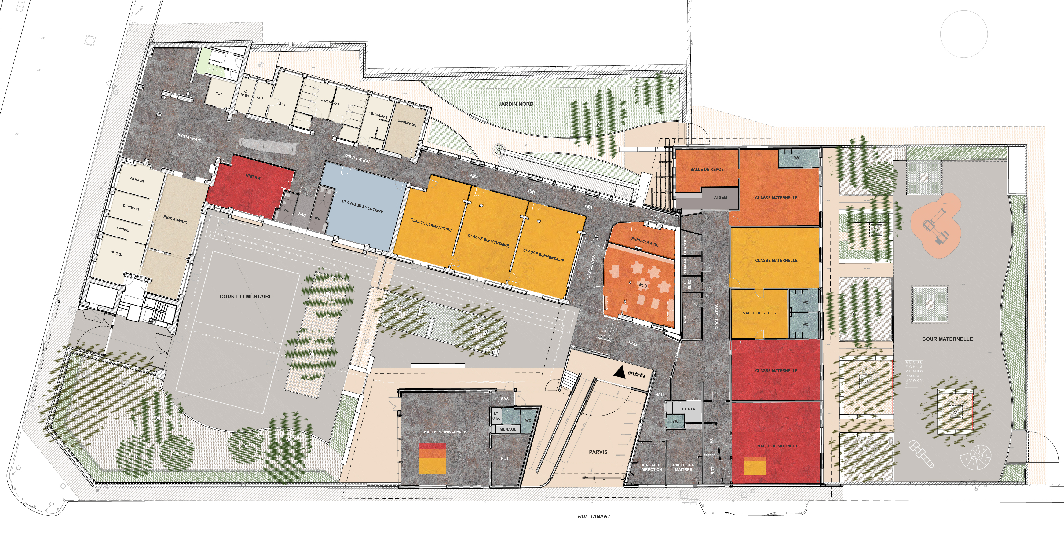 L’école maternelle Diderot, des années 50, est restructurée et agrandie pour accueillir le groupe scolaire dans son ensemble. Le nouveau groupe scolaire reprend de l’école maternelle, comme en hommage à celle-ci, l'image d'un grand toit abritant les différentes fonctions. Le volume compact créé s’enroule autour de l’existant, coiffé d’une toiture ascendante, s’ouvrant d’une fenêtre sur le ciel au niveau du parvis. Le projet présente une structure mixte béton et ossature bois, le béton constitue le socle et la colonne vertébrale, l’ossature et la charpente bois forment l’enveloppe extérieure.