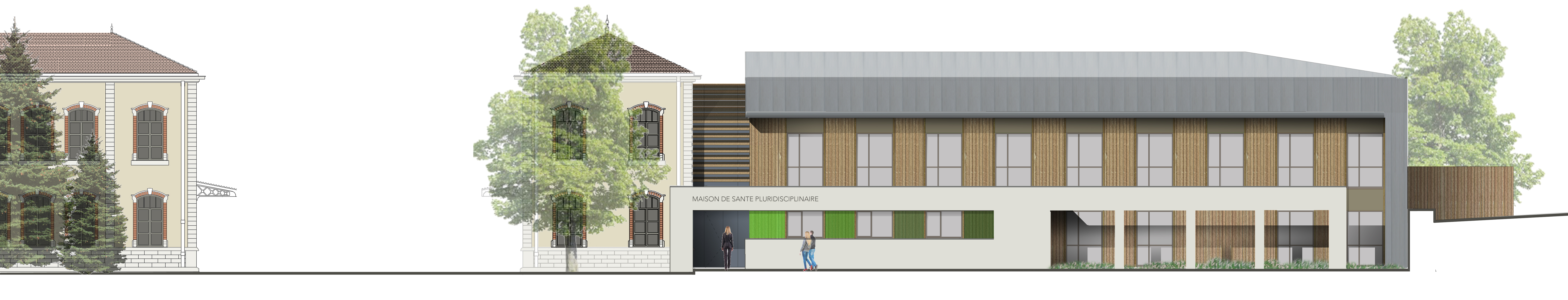 La Maison de Santé pluridisciplinaire a permis de valoriser les anciennes friches militaires, par la réhabilitation de l'ancien poste de garde et la création d'un bâtiment neuf en continuité bâtie. Le projet offre une volumétrie simple, compacte, en lien avec le patrimoine historique et la recherche d'une certaine sobriété fonctionnelle et constructive. L’édifice est structuré par assise en maçonnerie surélevée d’une « boite » en bois (murs en ossatures bois, charpente); les façades porteuses permettent une évolutivité dans l’aménagement des espaces intérieurs.