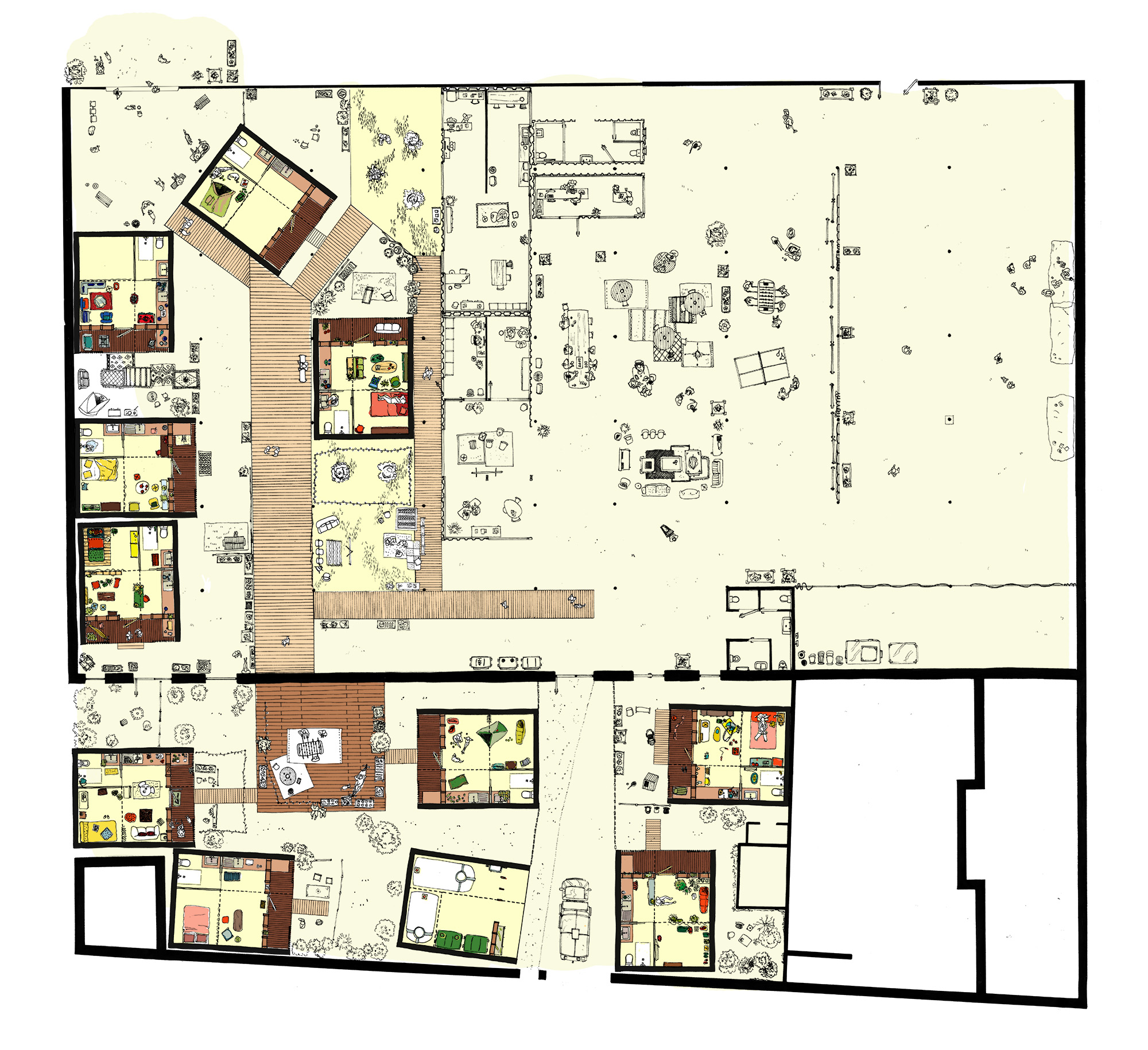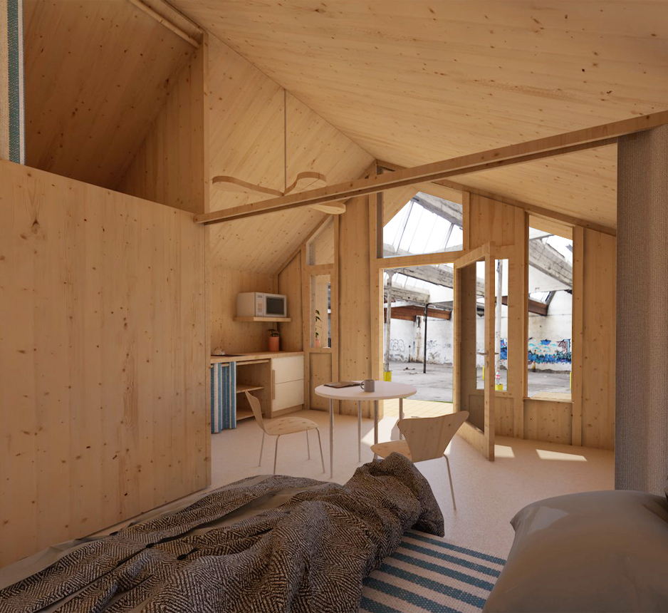 Le projet est porté par ALYNEA pour la DIHAL (Délégation Inter-Ministérielle à l’Hébergement et l’accès au Logement des personnes sans abri) pour créer un lieu de vie avec étayage collectif.Le projet prévoit l’installation temporaire sur 3 ans de modules bureaux et de 10 modules en pré-fabrication 2D, démontables, d’habitat de 24 m2 environ chacun et d’un module technique constitué d’un conteneur maritime. 5 modules en extérieur et 5 modules à l'intérieur dans l'ancienne usine occupée. Projet en conception - réalisation par un groupement de SCOP (études et réalisation)