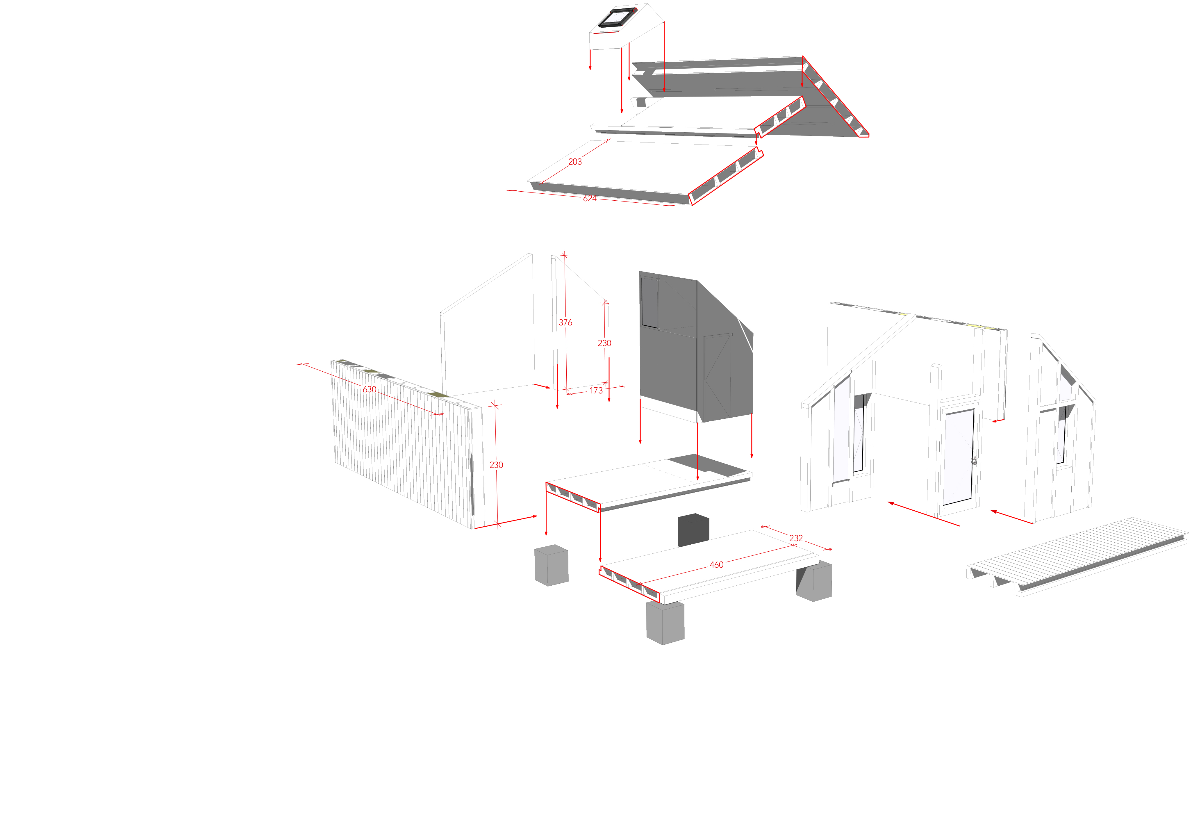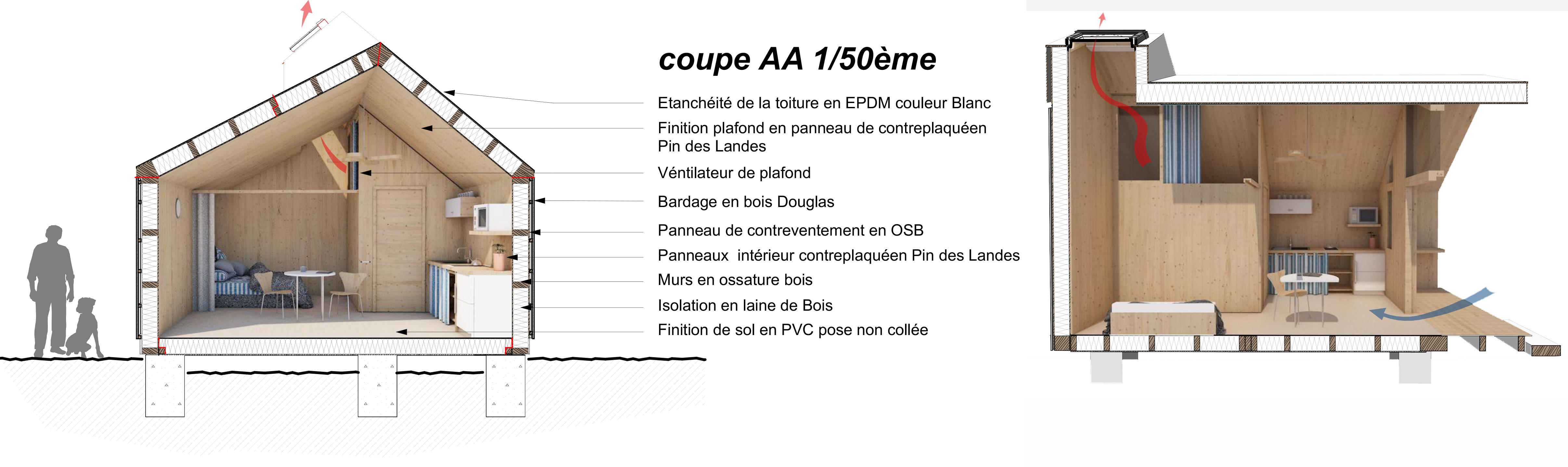 Descriptif technique : Préfabrication en 2 dimensions de caissons bois isolés en ossature bois Massif certifié Bois des Alpes, revêtue d’un panneau extérieur en OSB III 15 mn et en intérieur d’un Contre-plaqué PIN 18 mn (Pin Maritime des Landes ECOPIN certifié PEFC) / isolés par insufflation de laine de bois. pignon d’entrée est réalisé en ossature type colombage module Salle de bains préfabriqué plot de fondation en béton préfabriqué bac acier de couverture Assemblage des panneaux préfabriqués par mi-bois 3 mois d'étude et 2 mois de chantier modules technique d'autonomie avec PV, batterie et stockage EU et EP. PEFC (Gestion forestière durable) Bois des Alpes