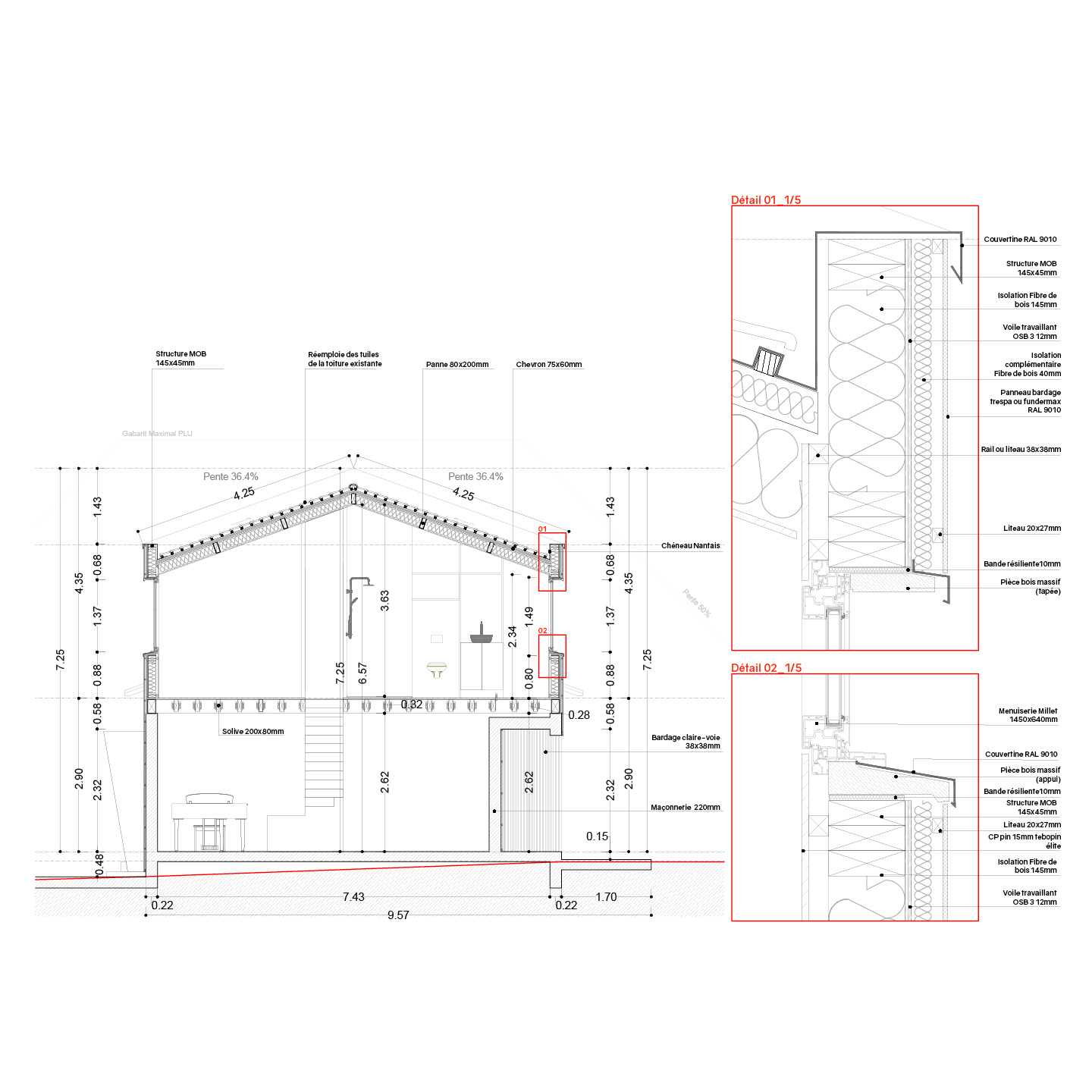 Approche environnementale : L’une des contraintes majeur fut de devoir surélever sans découvrir l’existant, l’habitation restant occupée durant toute la durée du chantier. Une des solutions esthétiques mais aussi économique fut de réaliser le doublage intérieur en contre-plaqué pin provenant des landes.
