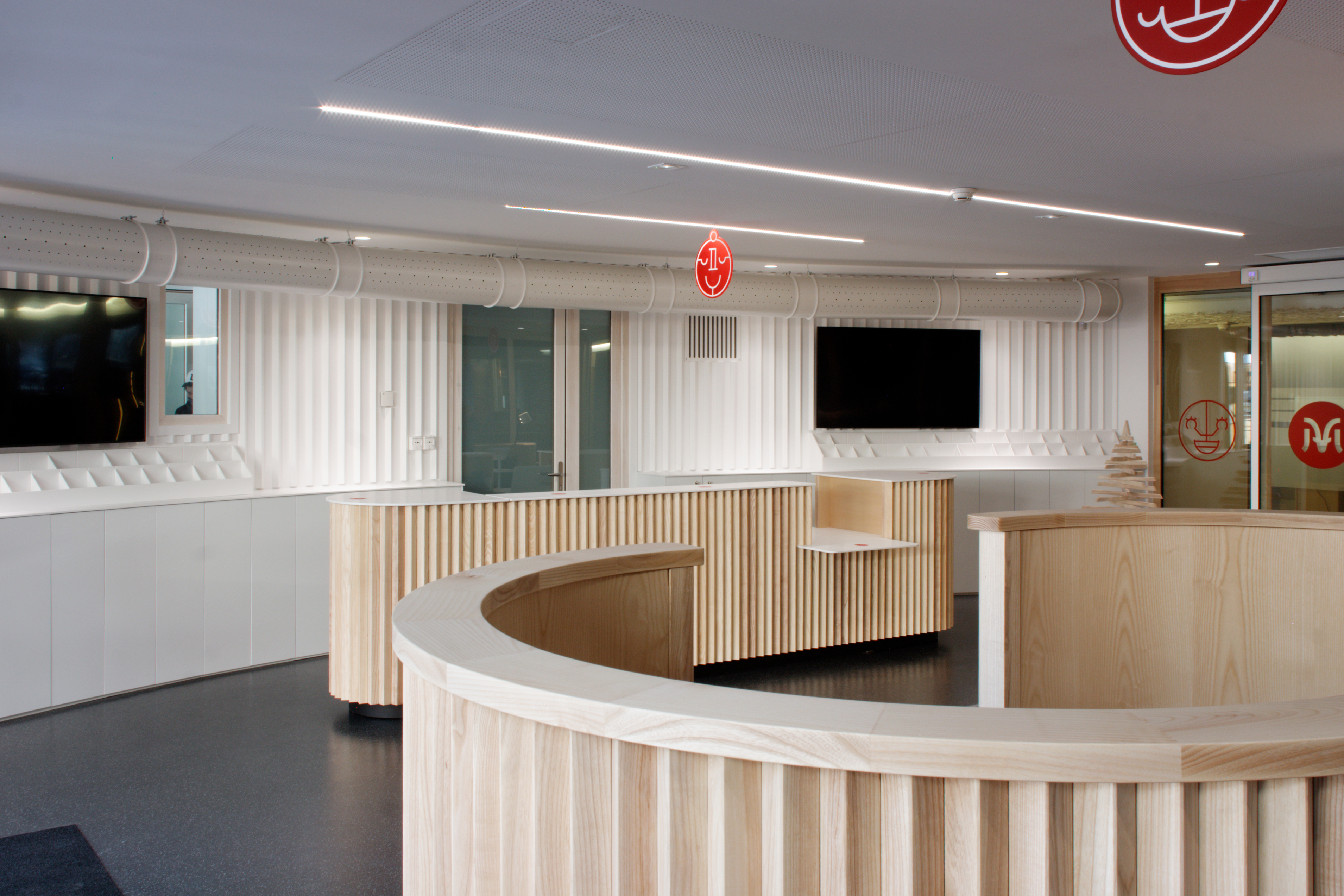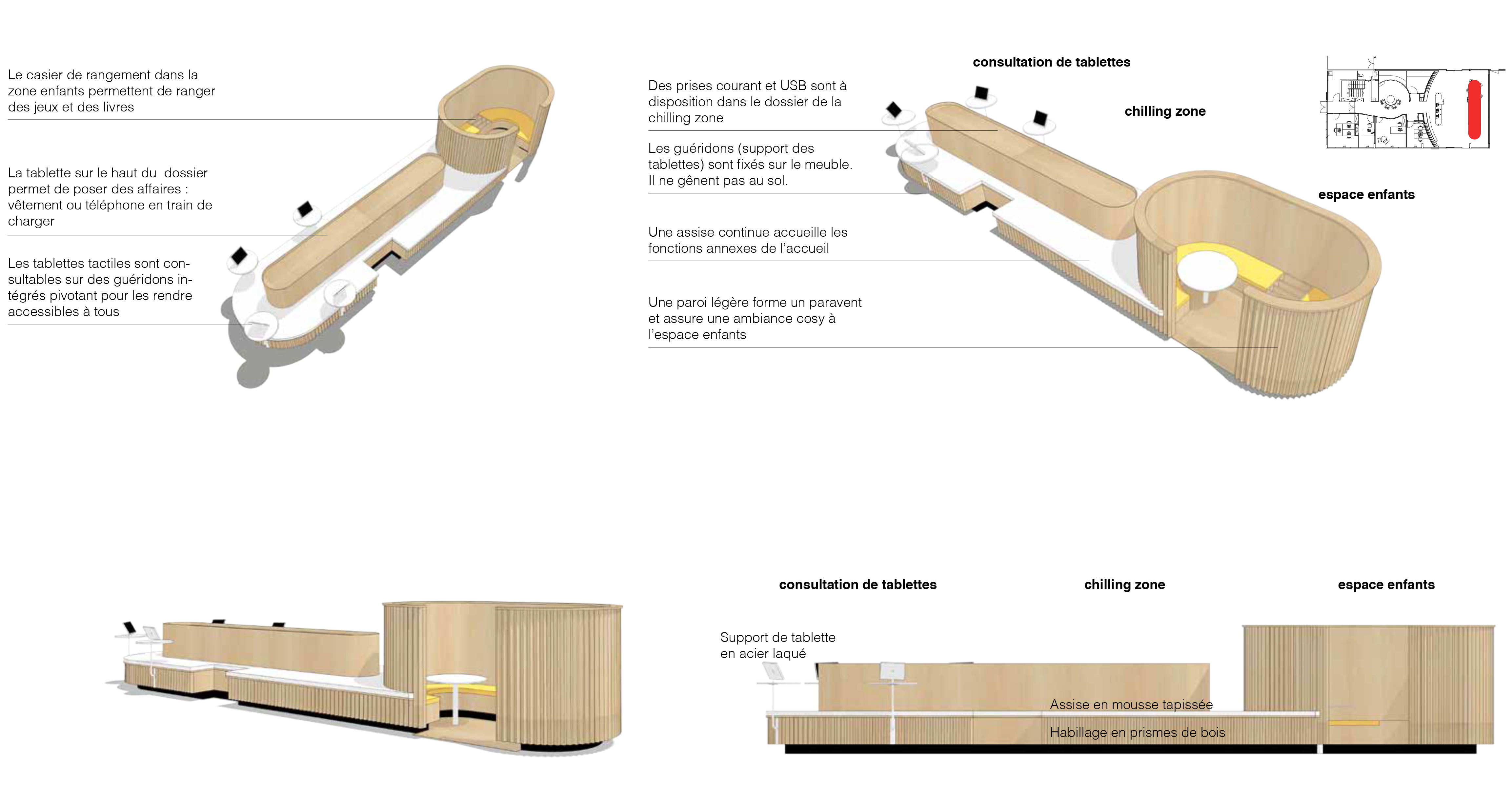 Descriptif technique de l'aménagement : Le projet est un aménagement intérieur situé au rez-de-chaussée d'une co-propriété datant de 1964. Le principe de l'intervention a été de curer les espaces afin de retrouver un plateau libre. Les aménagements ont été conçu pour être préfabriqués en atelier, en majorité, afin d'optimiser le temps de chantier, notamment : la banque d'accueil mobile (déplaçable et ajustable), le gradin, les banquettes, l'espace enfant.