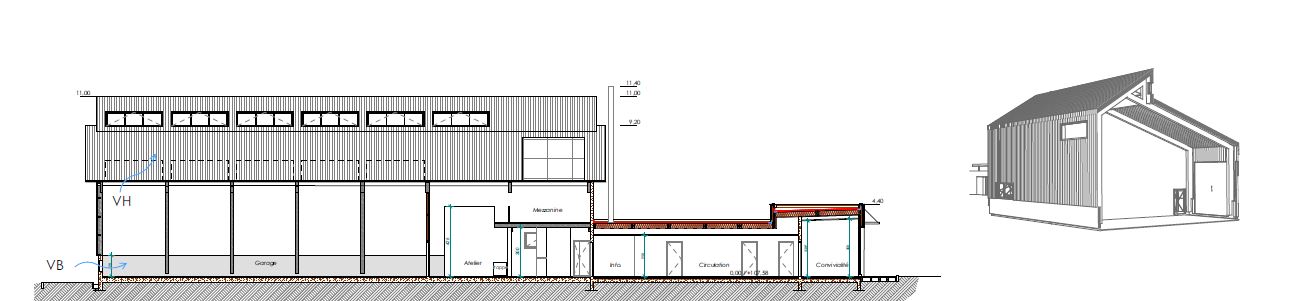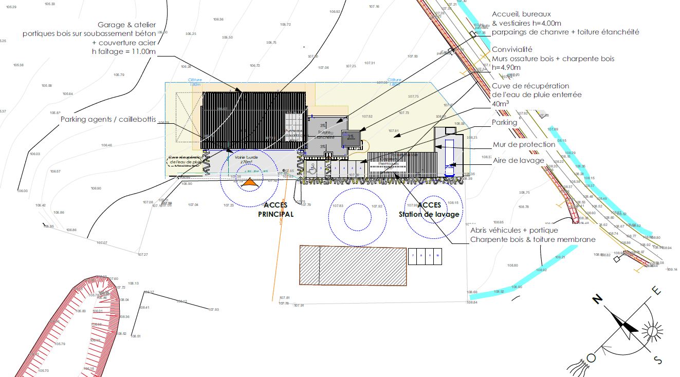 Cette opération a pour objectif la réalisation d’un bâtiment technique pour le service environnement. L’ensemble est composé de 3 entités : Le garage & les ateliers : Ce grand volume (11m sous faitage) est porté par des portiques en bois et bardé de bois ou de bac acier. Les bureaux : Connecté à l’atelier ce volume est de plain pied et de plus petite hauteur (3.50m à l’acrotère). Il est constitué de murs en parpaings de chanvre (matériaux biosourcés). La convivialité qui termine ce volume est en ossature bois. L’abri & la station de lavage, préau en bois qui protège les voitures de fonction
